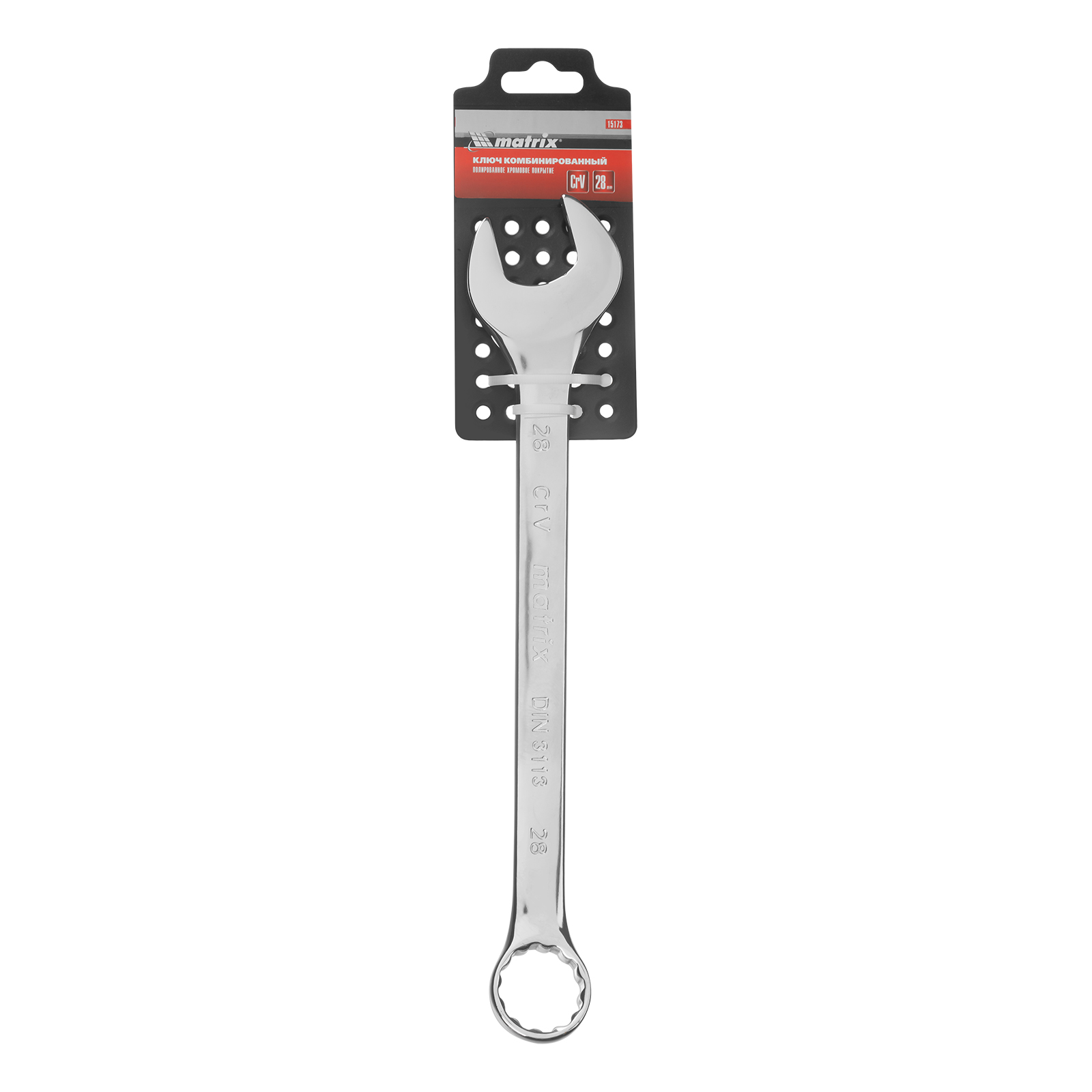 Комбинированный ключ Matrix 15173 размером 28 мм, из стали CrV, с покрытием «полированный хром», пригодится во время ремонтных работ дома или в гараже. С его помощью можно быстро монтировать и демонтировать крепежные элементы. Угол наклона кольцевого зева относительно плоскости инструмента составляет 15°, поэтому ключом удобно работать в труднодоступных местах.