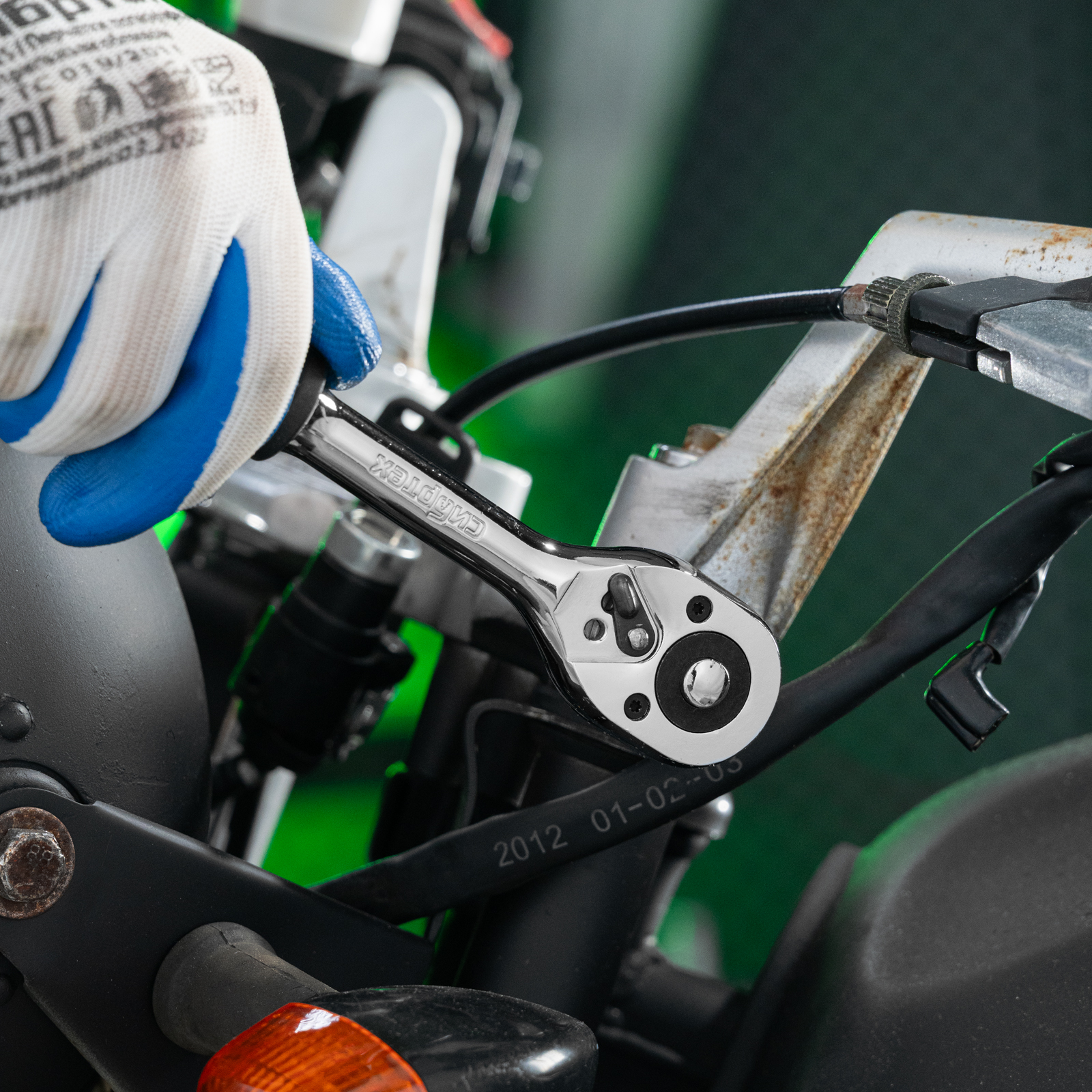Хромированный ключ-трещотка Сибртех 14002 из стали CrV, с посадочным размером 3/8″ и 45-зубым храповым механизмом, с функцией быстрого сброса, используется для работы с резьбовым крепежом. Трещоточный механизм с 45 зубьями обеспечивает плавное вращение, облегчая работу. Инструмент пригодится дома, в мастерской и гараже.