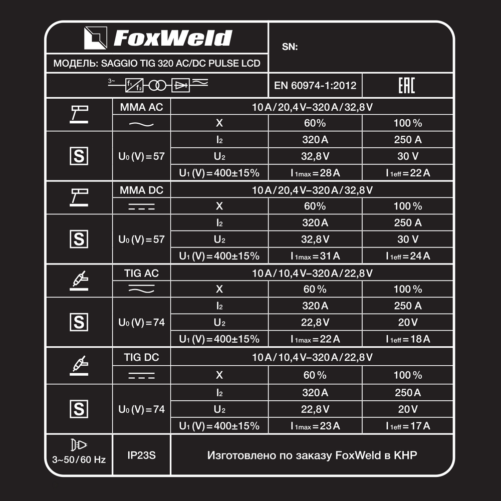 Аппарат аргонодуговой сварки FOXWELD SAGGIO TIG 320 AC/DC PULSE LCD – это промышленная флагманская установка серии SAGGIO для аргонодуговой сварки TIG. Многофункциональный аппарат с синергетическим управлением предназначен для работы как на постоянном (сварка сталей, меди, титана), так и на переменном токе (сплавы алюминия, магния, медные сплавы больших толщин, где требуется удаление окислов со свариваемой поверхности), в импульсном режиме и без него. Импульсный режим идеально подойдёт для сварки тонких металлов, особенно алюминия. Удобный 5-дюймовый LCD-дисплей на панели управления отображает всю необходимую информацию о сварочном процессе в реальном времени. Максимальный сварочный ток в 320 ампер в любом режиме сварки, 2 мощные ручки на корпусе, платформа на колёсах с установочным местом для баллона с газом, возможность подключения БЖО (блок жидкостного охлаждения) – в установке есть всё необходимое для крупных промышленных производств и строительства. На всю линейку аппаратов серии SAGGIO предоставляется расширенная гарантия в 5 лет.РЕЖИМ MULTITACK: Серия импульсов сварки позволяет контролировать нагрев изделия, избегая прожога и деформации. Регулируя частоту режима MULTITACK, можно оптимизировать проплавление металла, скорость сварки и, в частности, управление тепловложением, а также уменьшить любую последующую деформацию детали. Режим MULTITACK отлично подходит для сварки угловых соединений. Сварной шов не подвержен окислению, что позволяет избегать обработки после сварки.ФУНКЦИЯ DYNAMIC ARC: При включении данной функции источник питания поддерживает постоянную тепловую мощность на сварочной дуге, что позволяет избежать перегрева детали, пластических деформаций и потери механических свойств. Это реализуемо за счёт автоматической регулировки напряжения дуги и силы тока. DYNAMIC ARC позволяет сохранять один и тот же фокус сварочной дуги при изменении расстояния между электродом и деталью.ФУНКЦИЯ Q-START: При работе этой функции быстрее появляется сварочная ванна, чем при обычном режиме сварки за счёт подачи тока высокой частоты. Поскольку он способствует смешиванию двух кромок резкими колебаниями тока для ускорения соединения. Эта функция полезна при точечной сварке тонкого листового металла, а также для прихваток в разных пространственных положениях.РЕЖИМ PULSE: Режим PULSE упрощает процесс сварки алюминия и его сплавов, а также нержавеющих сталей, обеспечивая высокий уровень надежности соединения. В отличие от короткого замыкания, импульсная сварка не создает брызг и предотвращает залипание. Качество и удобство импульсного процесса позволяет сваривать швы разной сложности сварщику с незначительным опытом. Импульсный режим на переменном и постоянном токе дает возможность высококачественной сварки тонкостенных изделий из нержавейки и алюминия.СВАРКА ПЕРЕМЕННЫМ И ПОСТОЯННЫМ ТОКОМ: Возможность работать как на постоянном (сварка стали, меди, титана), так и на переменном токе (сплавы алюминия, магния, медные сплавы больших толщин, где требуется удаление окислов со свариваемой поверхности).ПРЕИМУЩЕСТВА:Импульсный режим сварки "Pulse" предотвращает вероятность прожога и деформации металла в случае длительных сварочных работСинергетический режим сварки "Smart TIG" облегчает процесс управления сварочными процессамиРежим "SPOT" позволяет осуществлять сварку точк