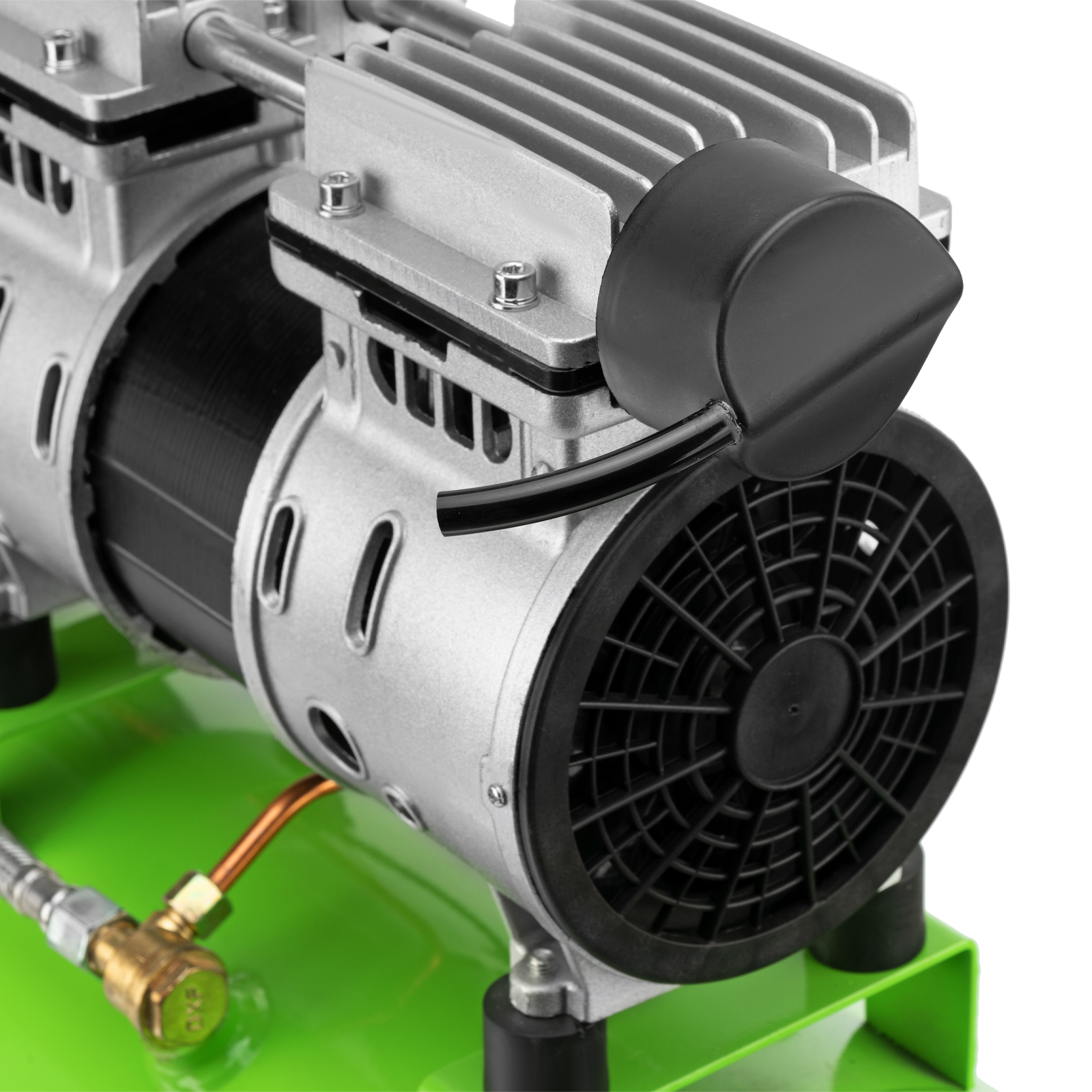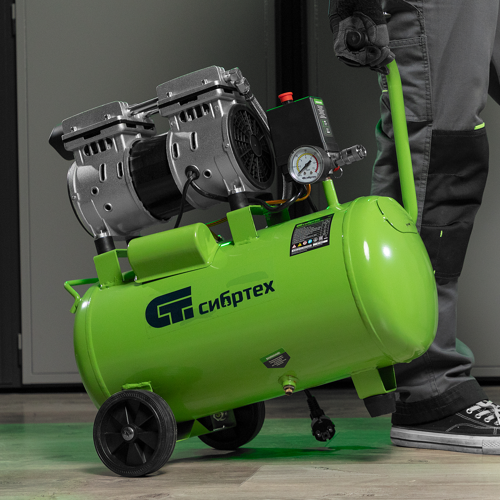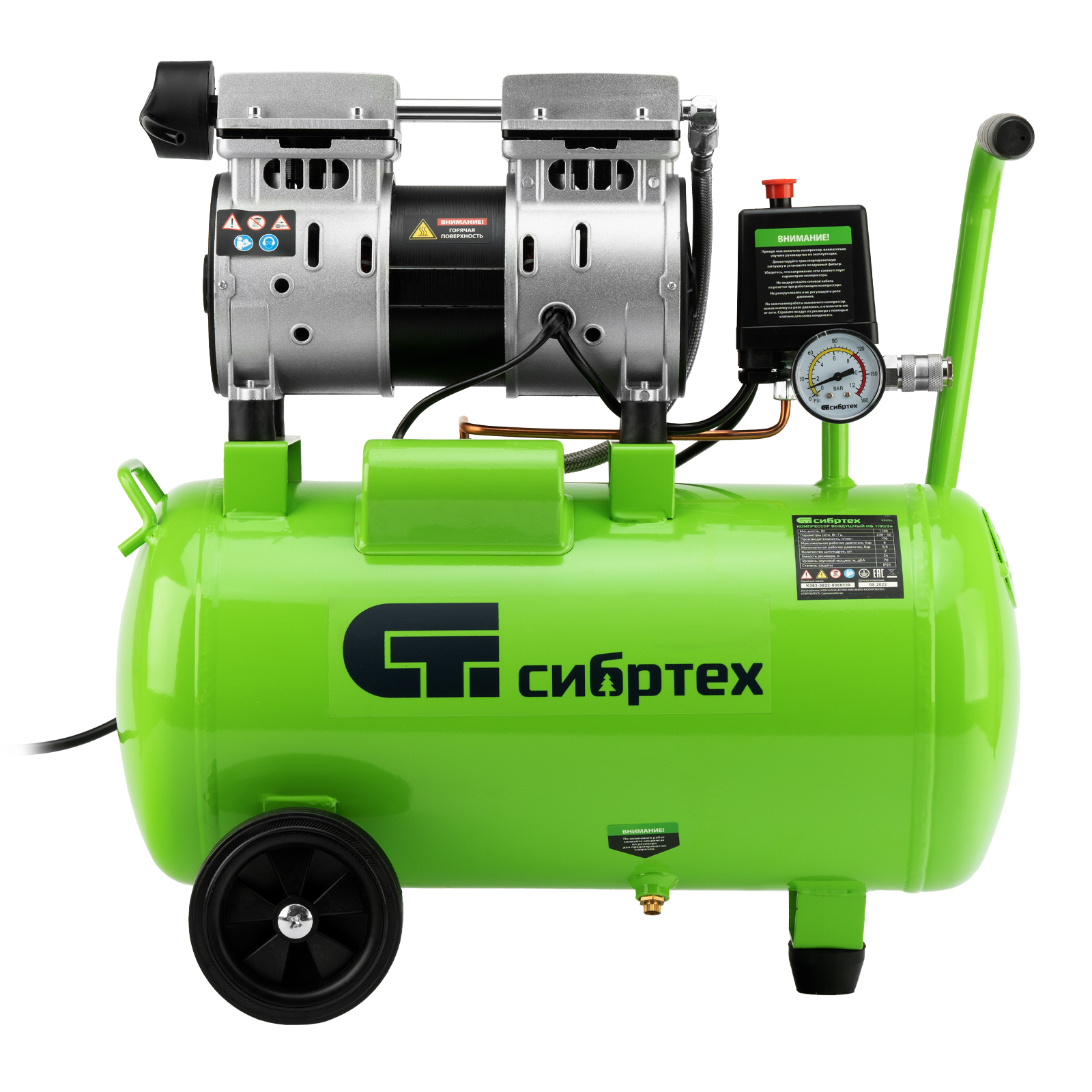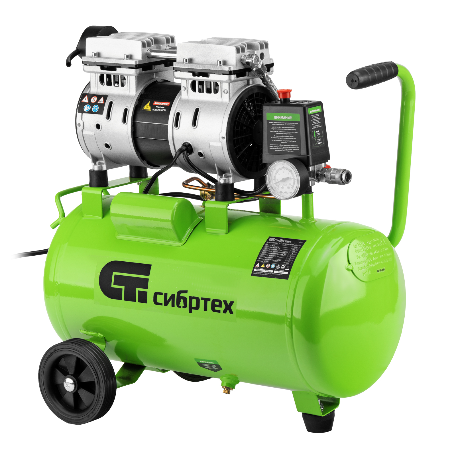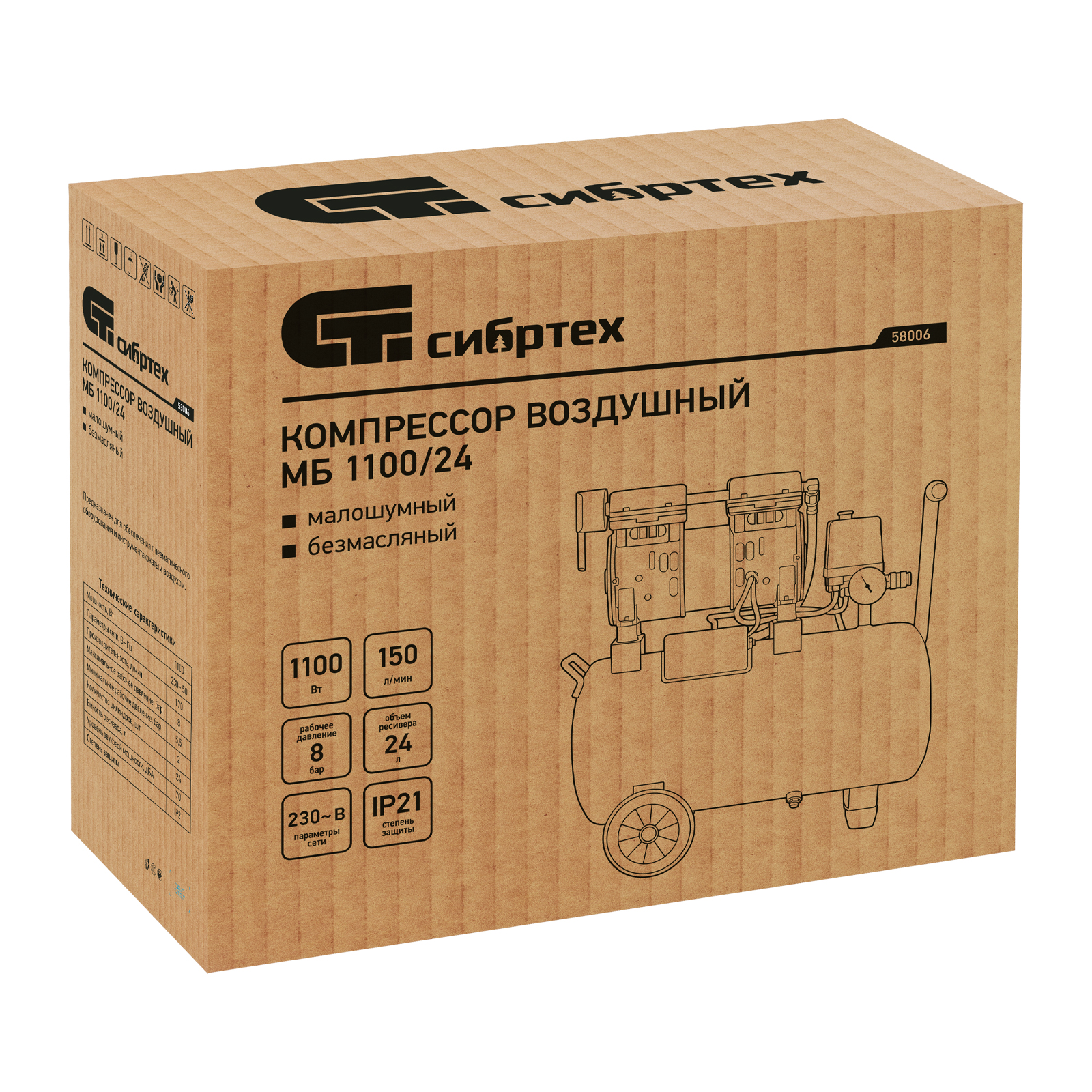 Безмасляный малошумный компрессор Сибртех МБ 1100/24 58006 мощностью 1100 Вт и объемом ресивера 24 л имеет производительность на входе 170 л/мин и сжимает воздух под давлением до 8 бар. Используется для обеспечения функционирования пневмоинструмента, например, краскораспылителя или пневматического шуруповерта. Для работы устройства не требуется масло, поэтому воздух на выходе не содержит его частиц. Компрессор оптимален для проведения покрасочных работ и продувки электронных компонентов.,Одна из ключевых особенностей компрессора — низкий уровень шума (не превышает 70 дБ), позволяющий использовать устройство в жилом помещении без дискомфорта для людей.