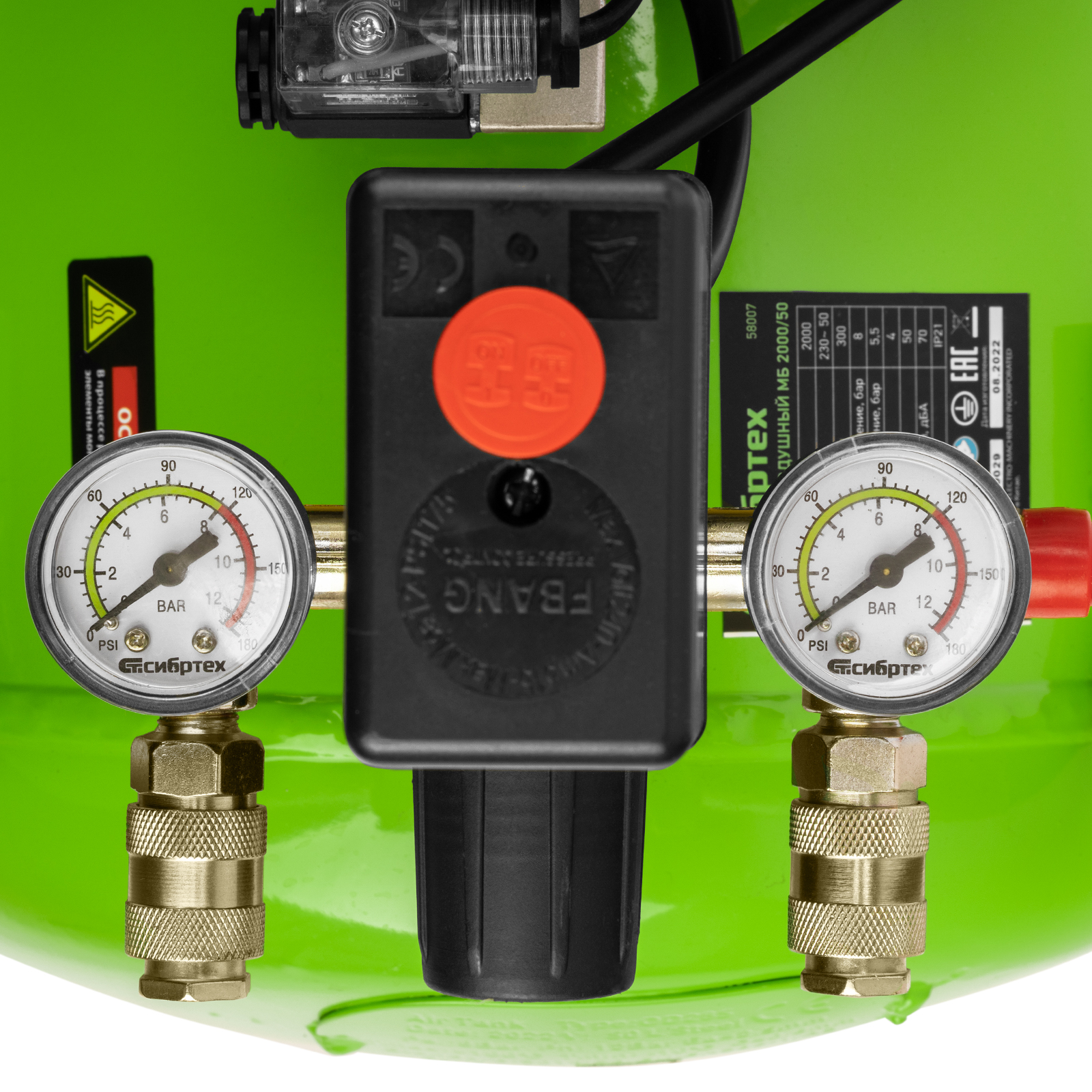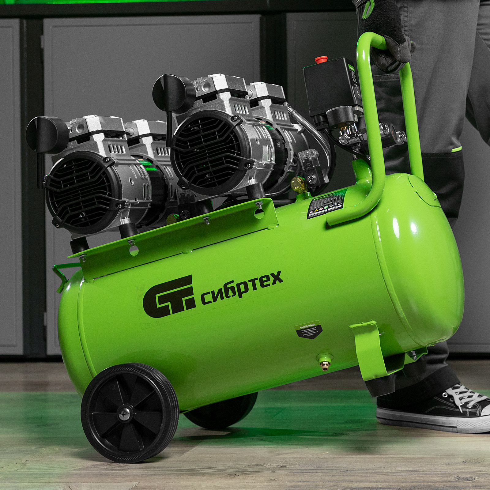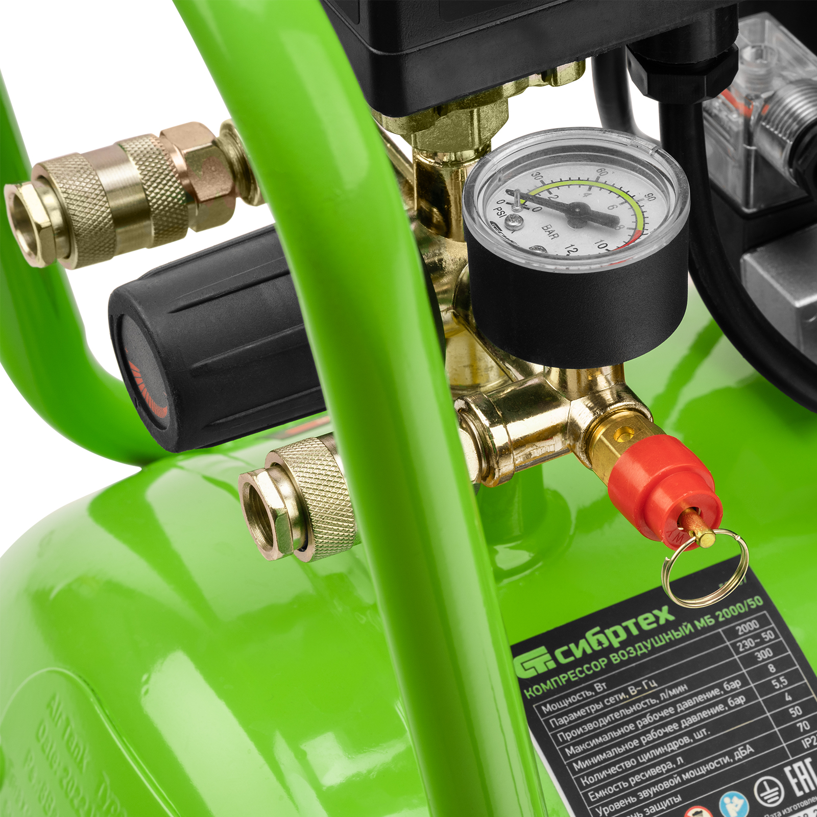 Безмасляный малошумный компрессор Сибртех МБ 2000/50 58007 мощностью 2000 Вт и объемом ресивера 50 л имеет производительность на входе 300 л/мин и сжимает воздух под давлением до 8 бар. Используется для обеспечения функционирования пневмоинструмента, например, краскораспылителя, перфоратора или пневматического шуруповерта. Для работы устройства не требуется масло, поэтому воздух на выходе не содержит его частиц. Компрессор оптимален для проведения покрасочных работ и продувки электронных компонентов.,Одна из ключевых особенностей компрессора — низкий уровень шума (не превышает 70 дБ), позволяющий использовать устройство в жилом помещении без дискомфорта для людей.