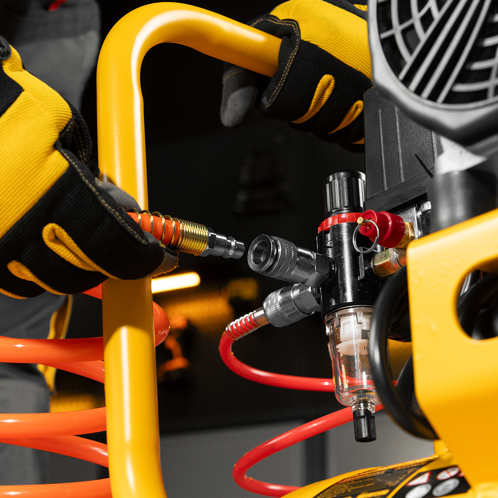 - Простая подготовка к работе — благодаря быстросъемному выходному коннектору подключение пневмоинструмента занимает несколько секунд.
