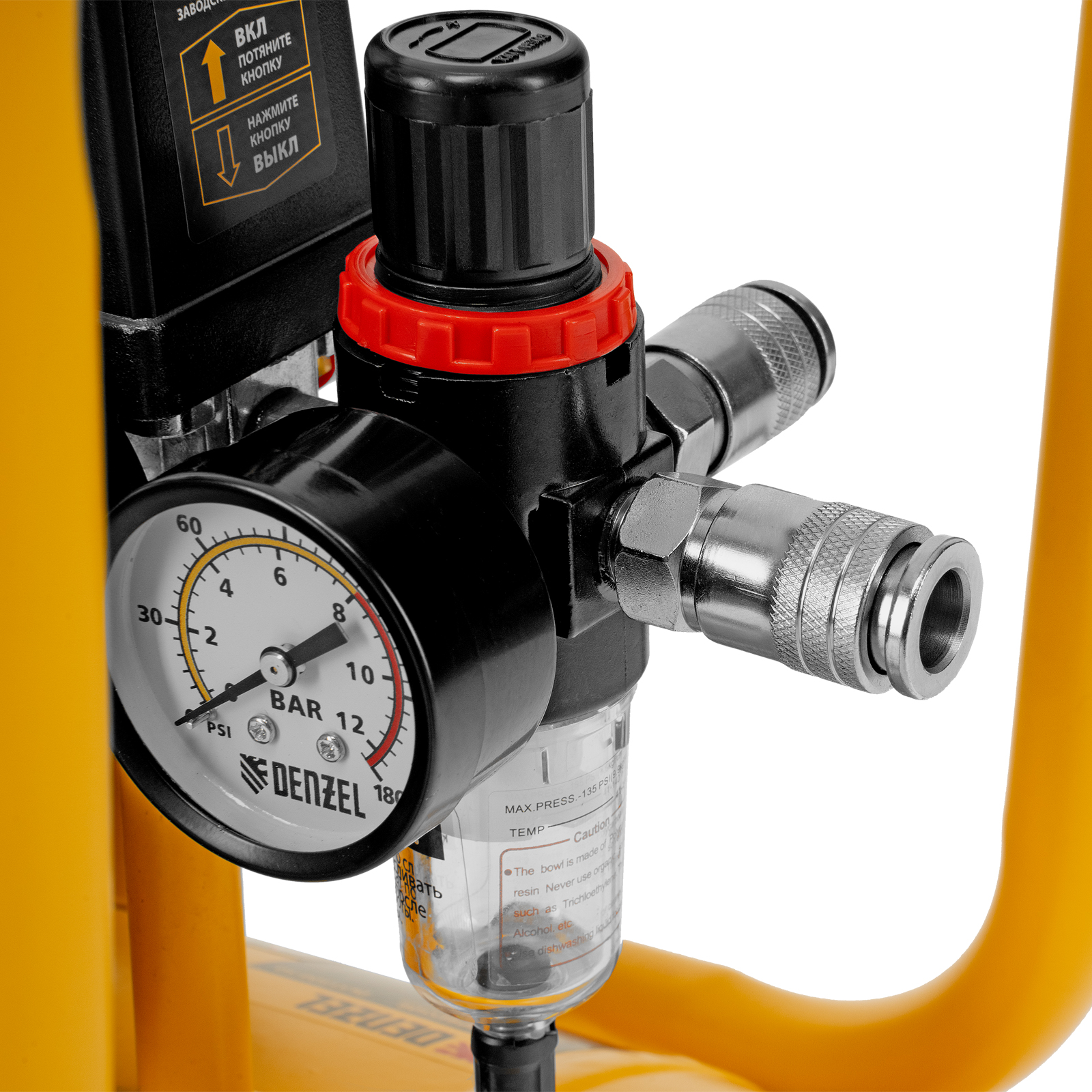 - Регулятор давления на выходе — можно выбрать оптимальный режим подачи воздуха в соответствии с характеристиками пневмоинструмента.