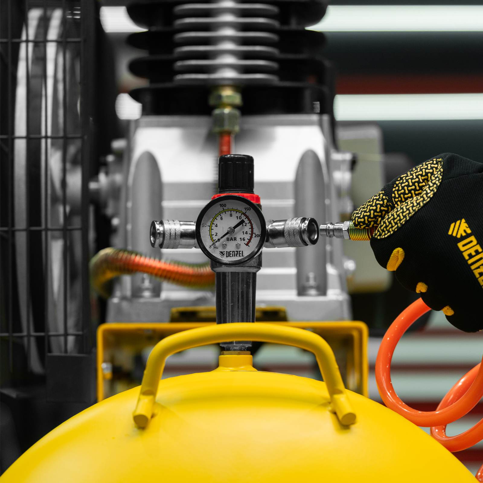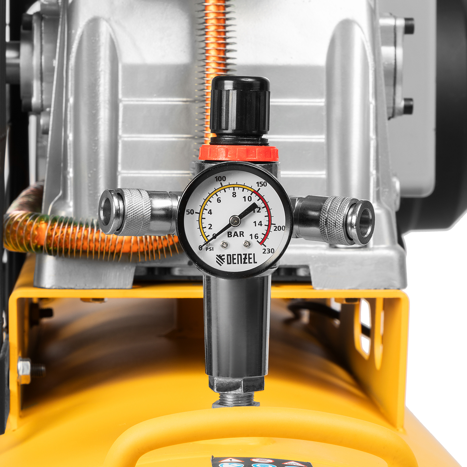 - 2 больших манометра — мастеру удобно отслеживать давление в ресивере и на выходной магистрали.