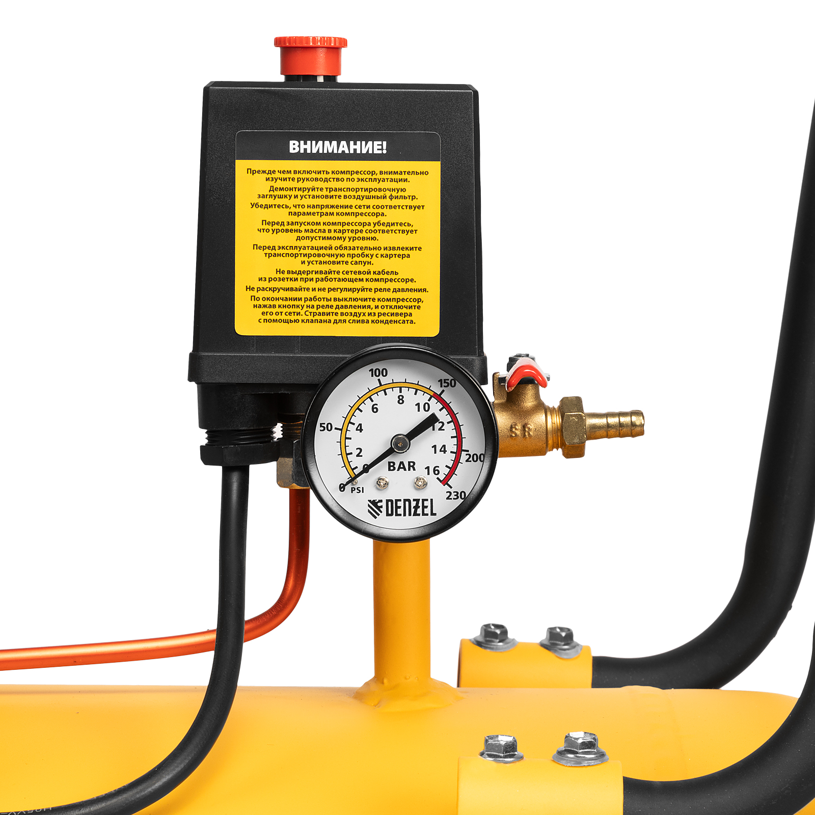 - Автоматический спускной клапан — лишнее давление быстро сбрасывается без вреда для компрессора.