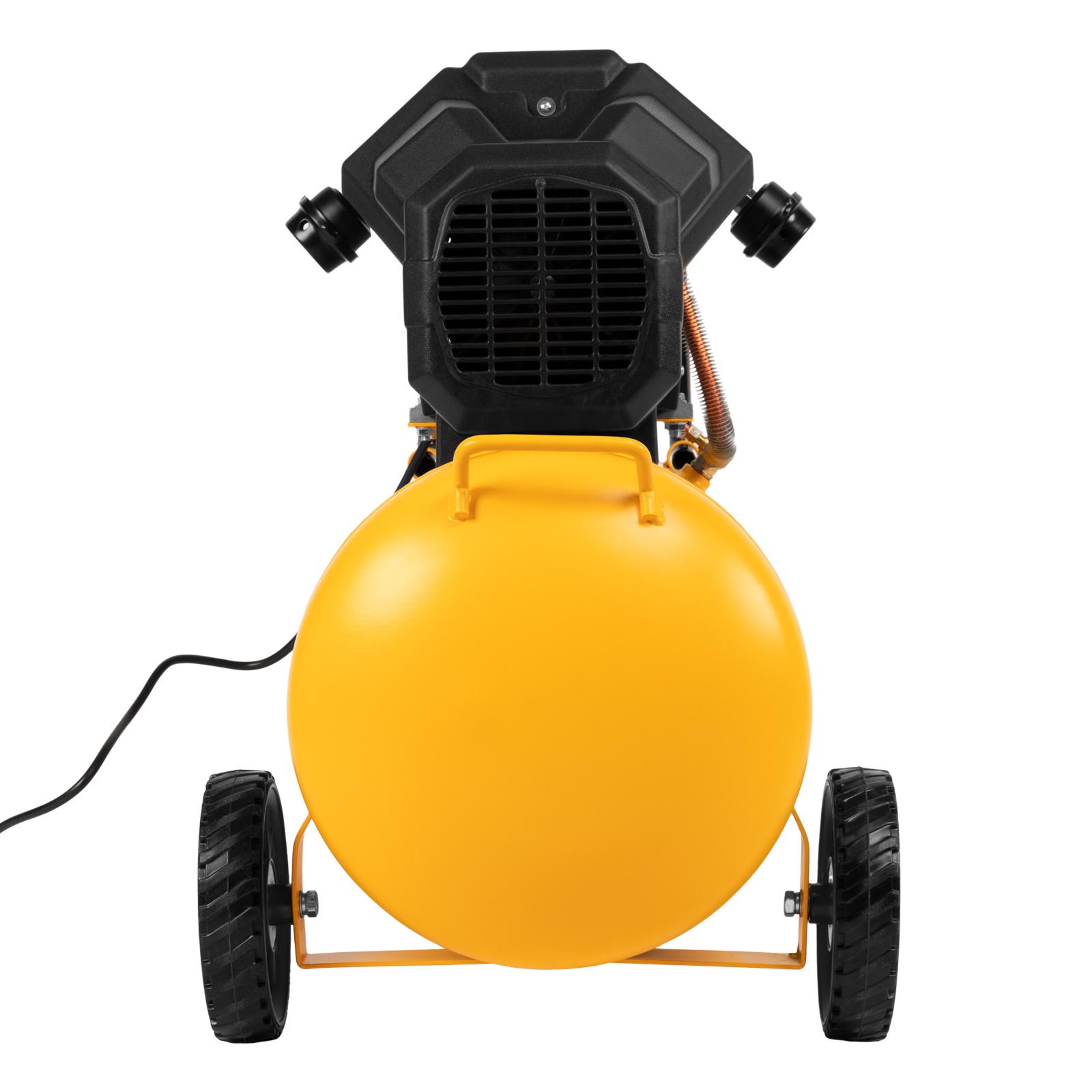 - Мобильность — большие колеса и П-образная ручка позволяют легко перемещать компрессор по рабочей площадке.