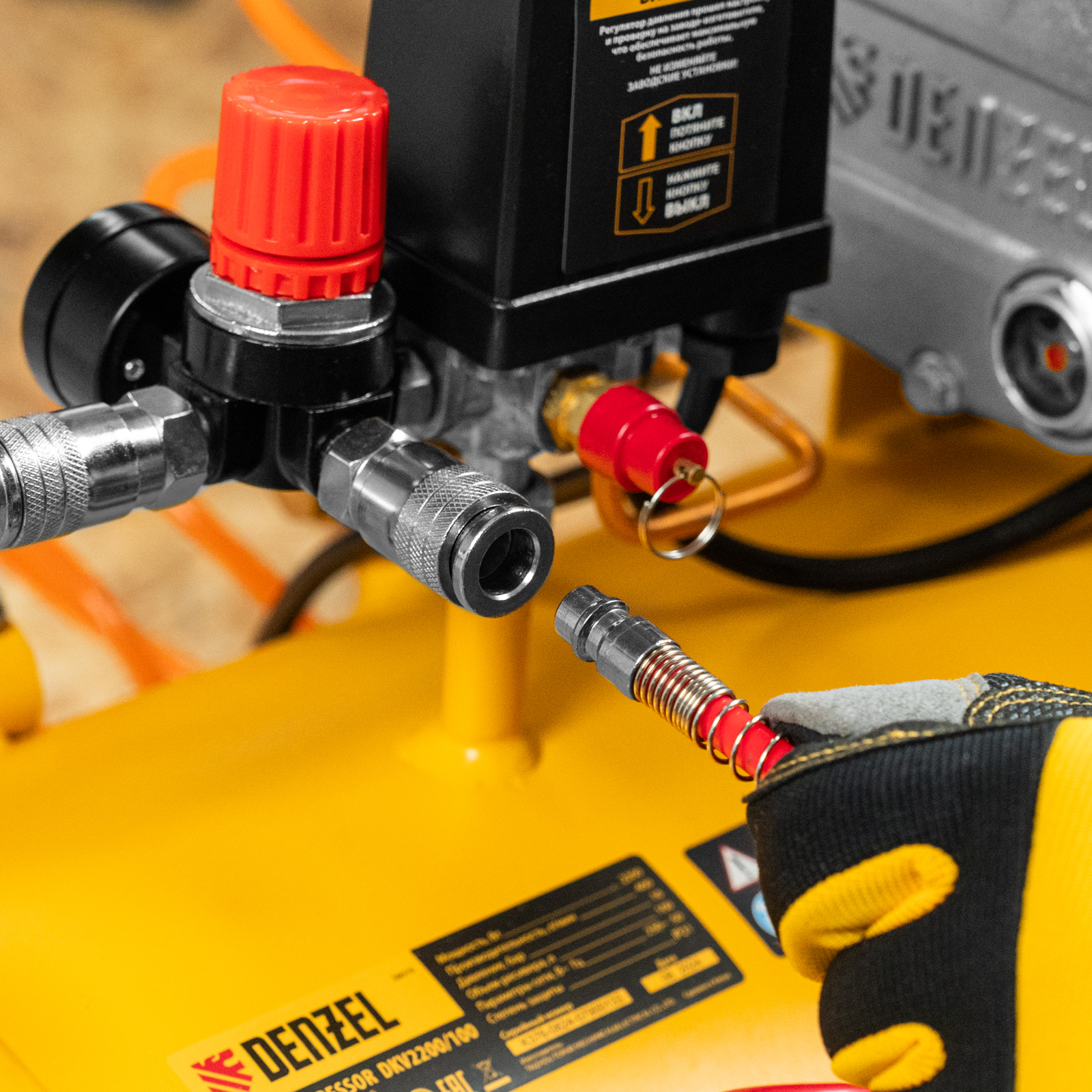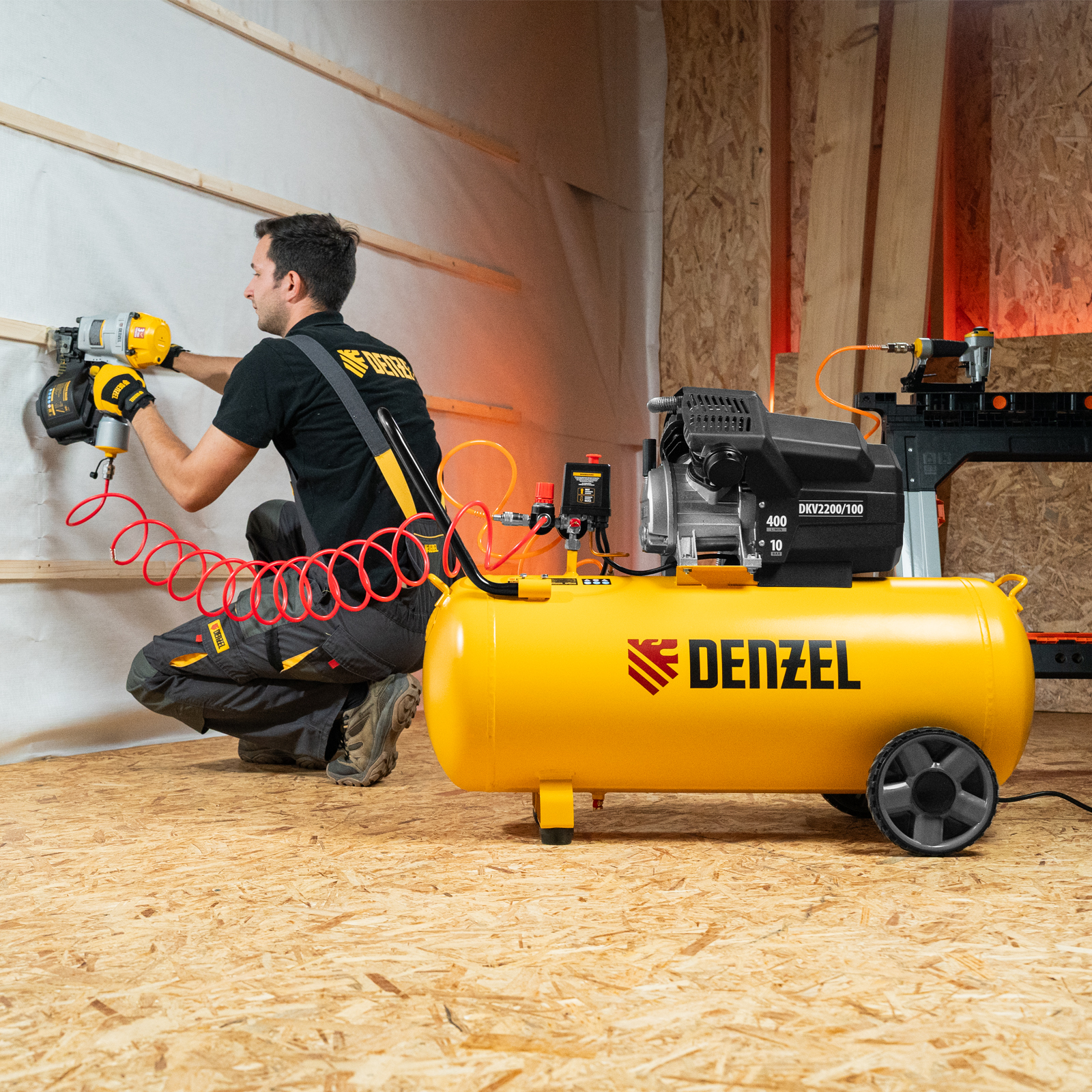 Компрессор Denzel X-PRO DKV2200/100 58079 мощностью 2,2 кВт, с ресивером объемом 100 л, обеспечивает производительность 400 л/мин, что позволяет использовать его в гараже, автомастерской, в строительстве и на небольшом производстве. Его мощности хватит для обеспечения работы пневмоинструментов, например, продувочных и окрасочных пневмопистолетов, пневмонейлеров, пневмостеплеров.