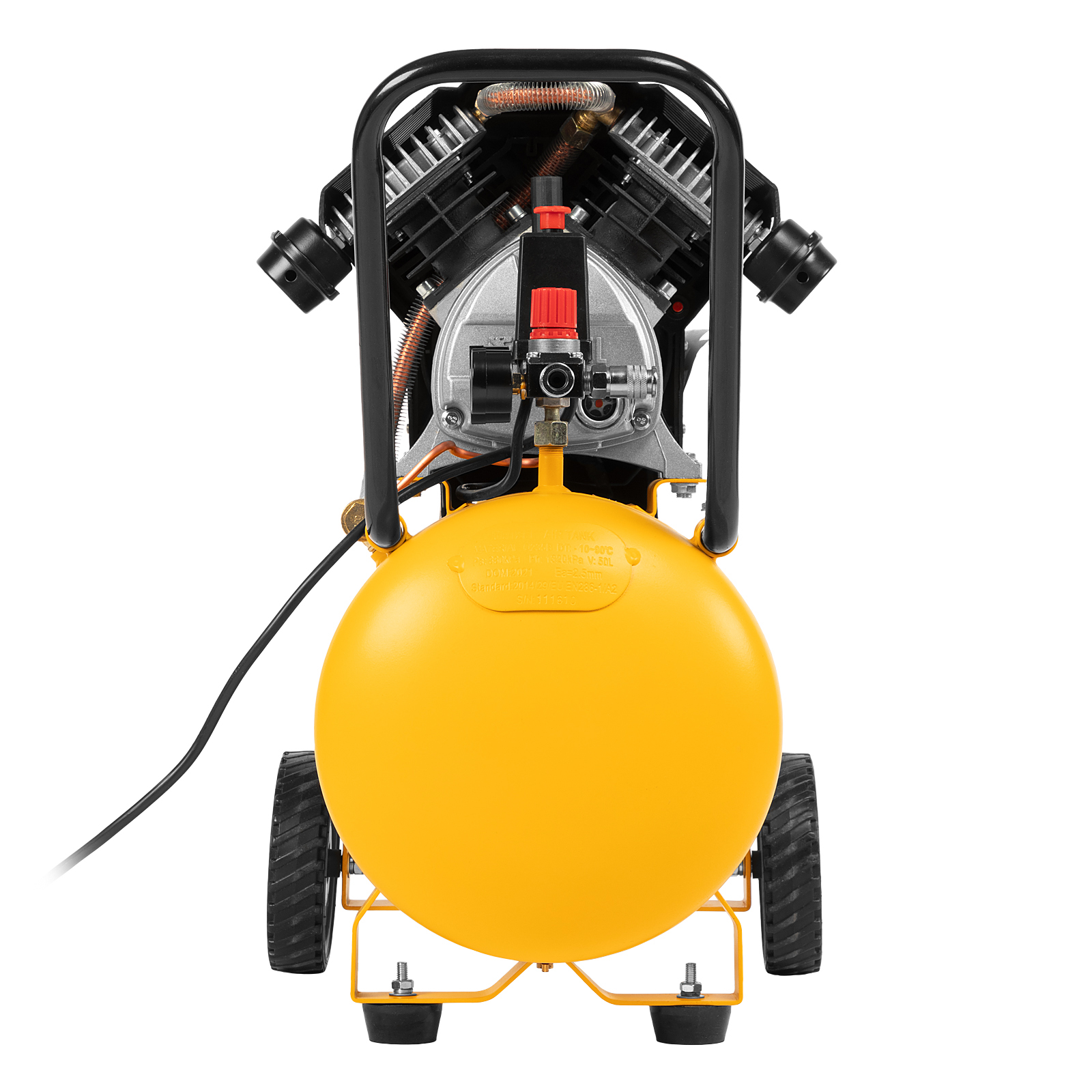 - Удобное перемещение — компрессор оснащен колесами и П-образной ручкой.