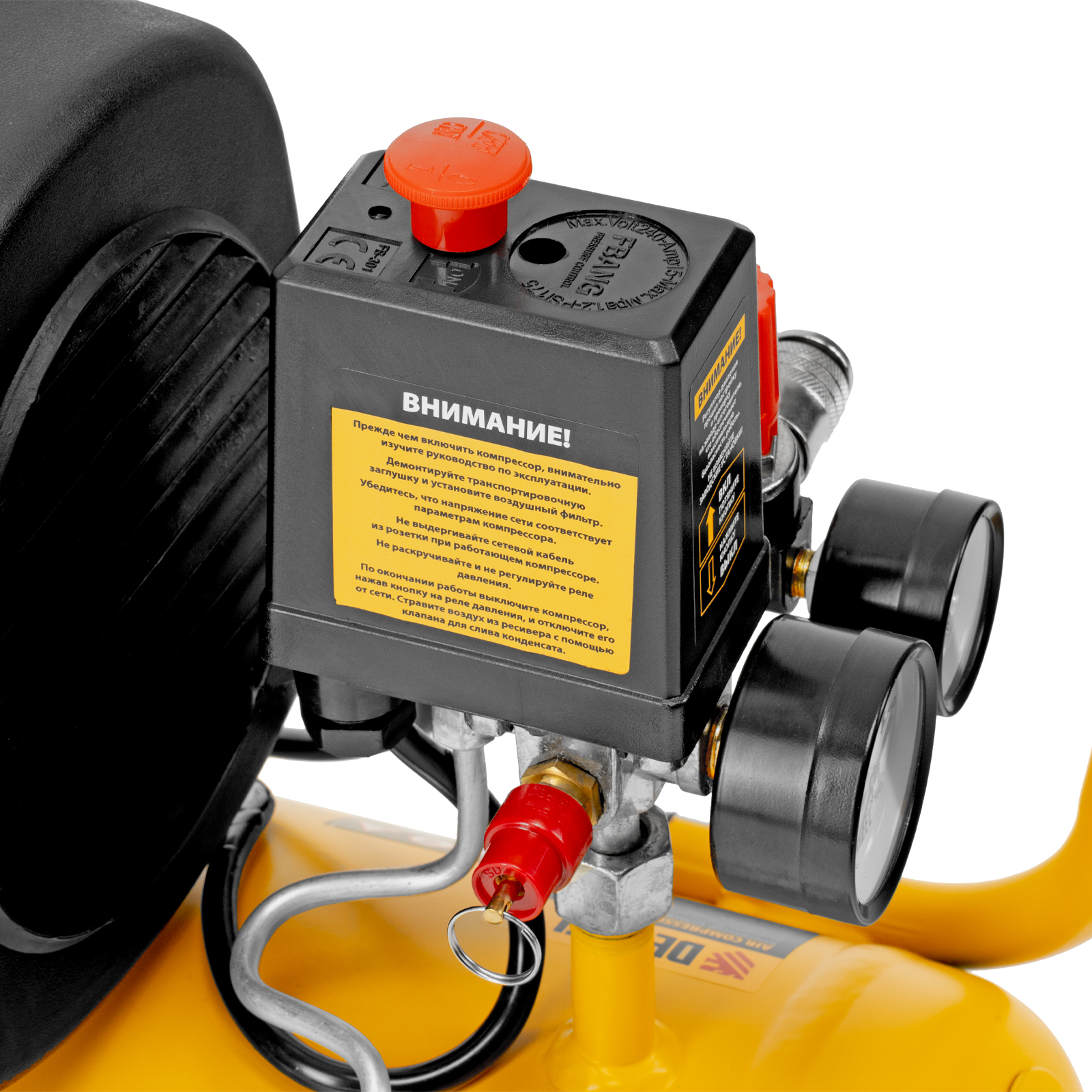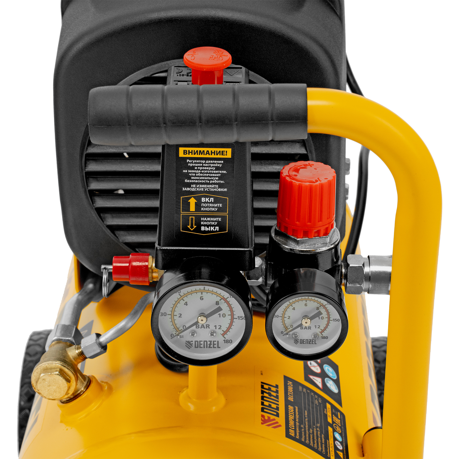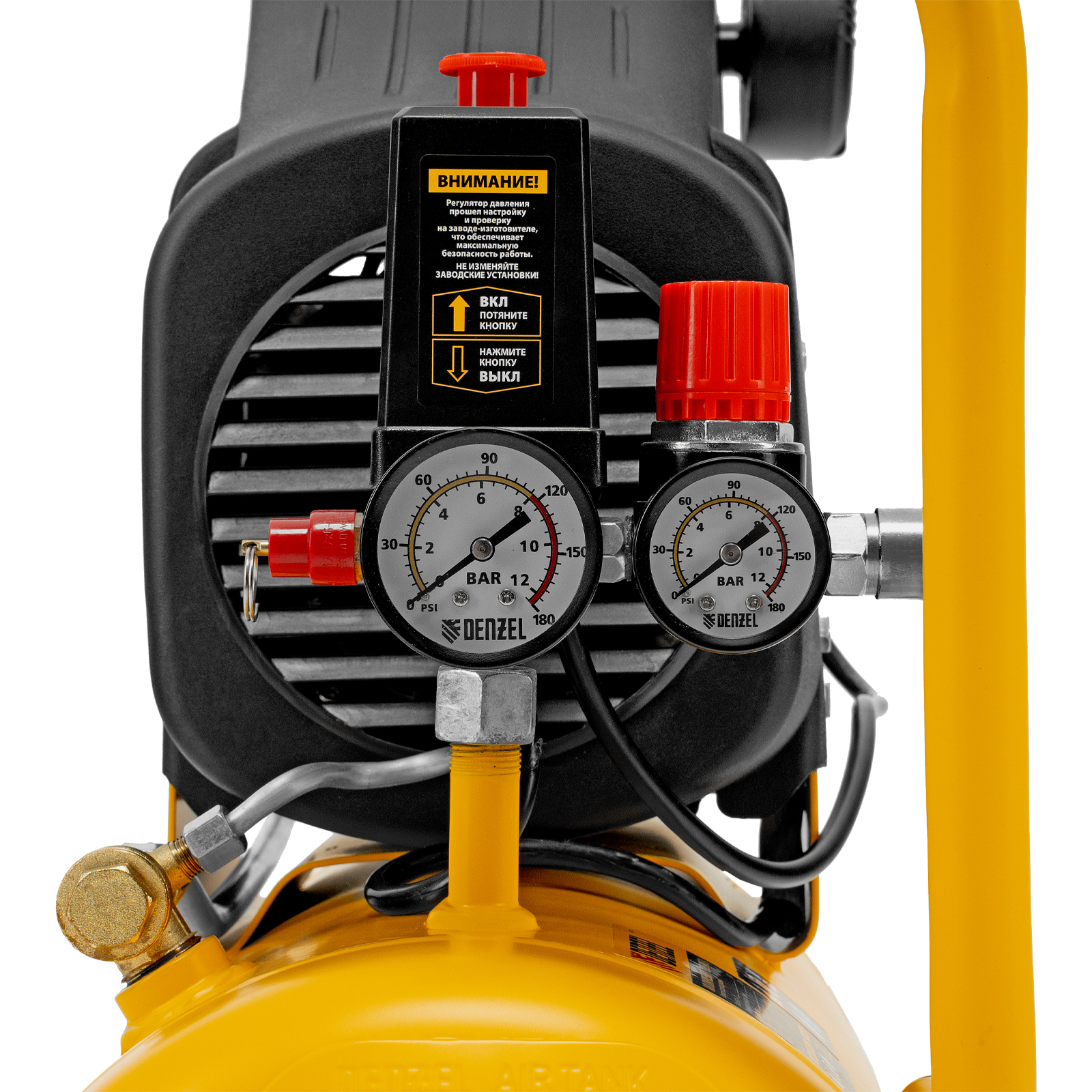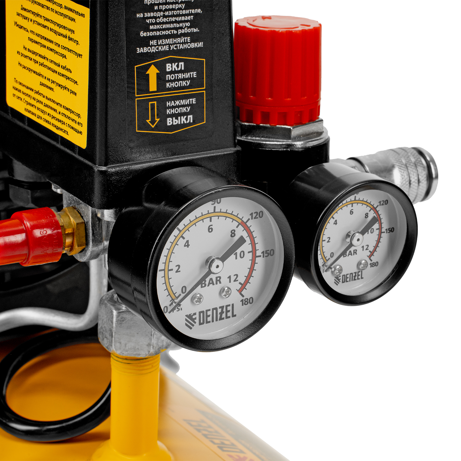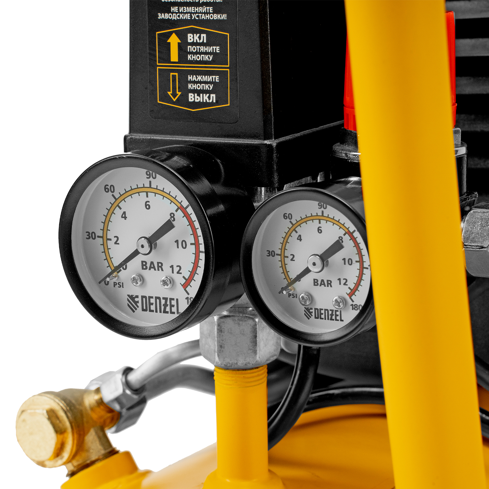 - Контроль рабочих параметров — компрессор оснащен двумя манометрами для отслеживания давления в пневмолинии и ресивере.