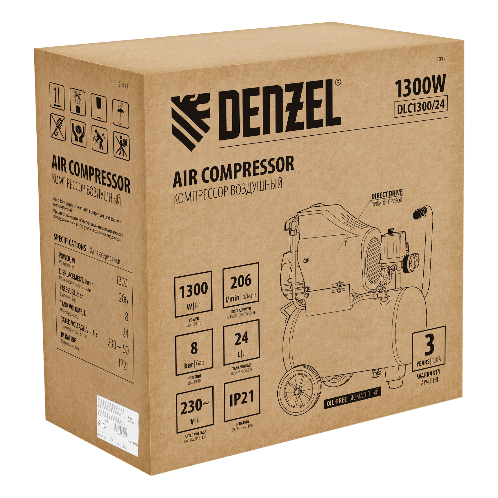 Безмасляный воздушный компрессор Denzel DLC1300/24 58171 мощностью 1,3 кВт, с объемом ресивера 24 л и производительностью на входе 206 л/мин, обеспечивает на выходе чистый сжатый воздух без примесей масла, что позволяет использовать его при окрашивании, креплении паркета и вагонки, продувке электронной техники, накачке шин. Подходит для обеспечения длительной работы пневмоаэрографа, пневмогравера, пневмошуруповерта, пневмодрели и пневмонейлера, а также другого пневмоинструмента. Быстроразъемный коннектор Euro (Rapid) упрощает подключение пневмомагистрали.