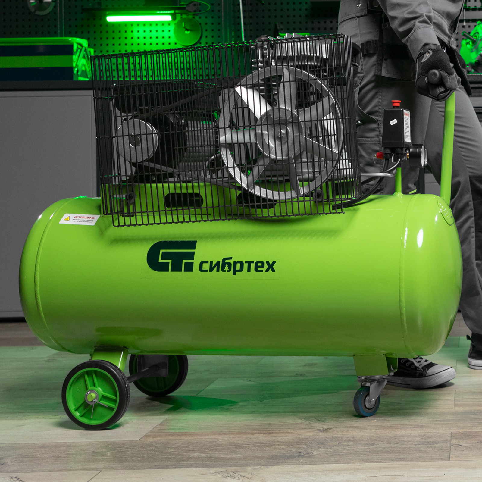 Масляный компрессор с ременным приводом относится к наиболее производительным моделям. Мощность 2.2 кВт, позволяет генерировать 350 л сжатого воздуха в минуту под давлением 10 бар. Такой производительности хватит для долговременных работ на небольших производствах, в автосервисах, на стройках или СТО. Перед сжатием воздух проходит через фильтр очистки, после — отправляется в ресивер объемом 100 л.,Чугунные цилиндры с большими ребрами охлаждения надежно защищают двигатель от перегрева. Встроенная защита от перегрузки отключит двигатель в случае необходимости, что позволит избежать поломки. Ременной привод защищен металлическим кожухом для безопасности оператора.