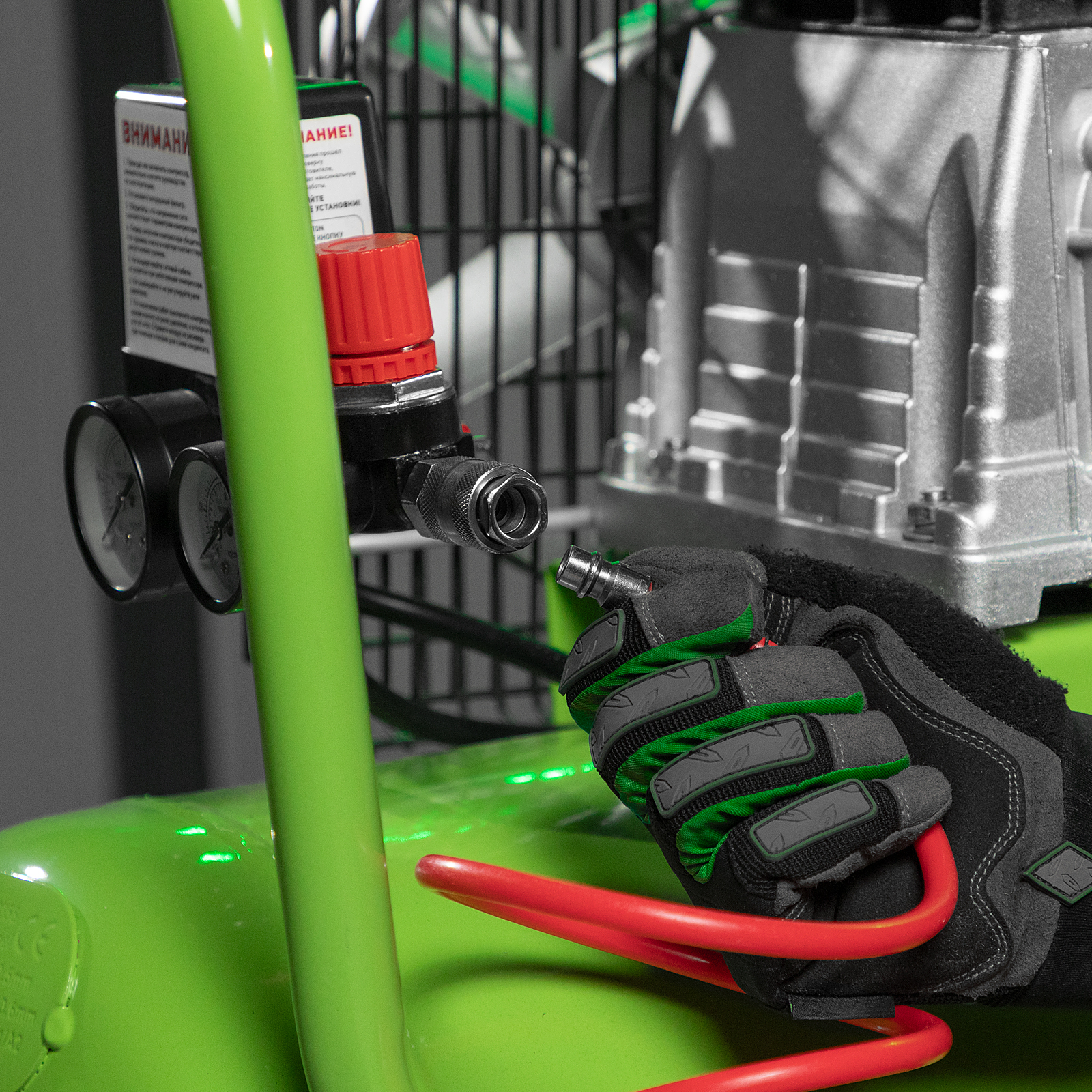 - Реле давления воздуха на выходе — регулятор обеспечивает подачу воздуха в диапазоне давления 6-8 бар и не дает компрессору работать с повышенной нагрузкой.