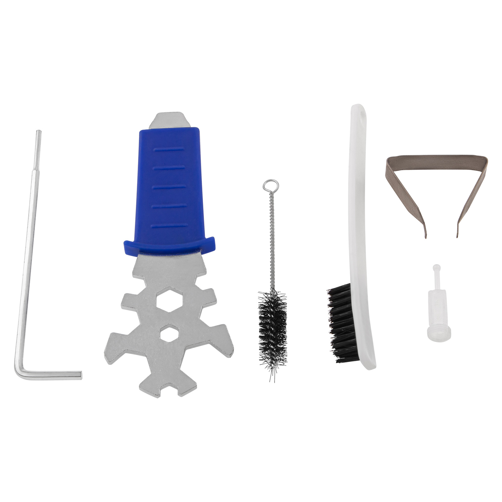 - Необходимые аксессуары в комплекте — краскопульт поставляется с дюзовым набором диаметром 1,3 мм, ершиком для очистки и универсальным ключом.