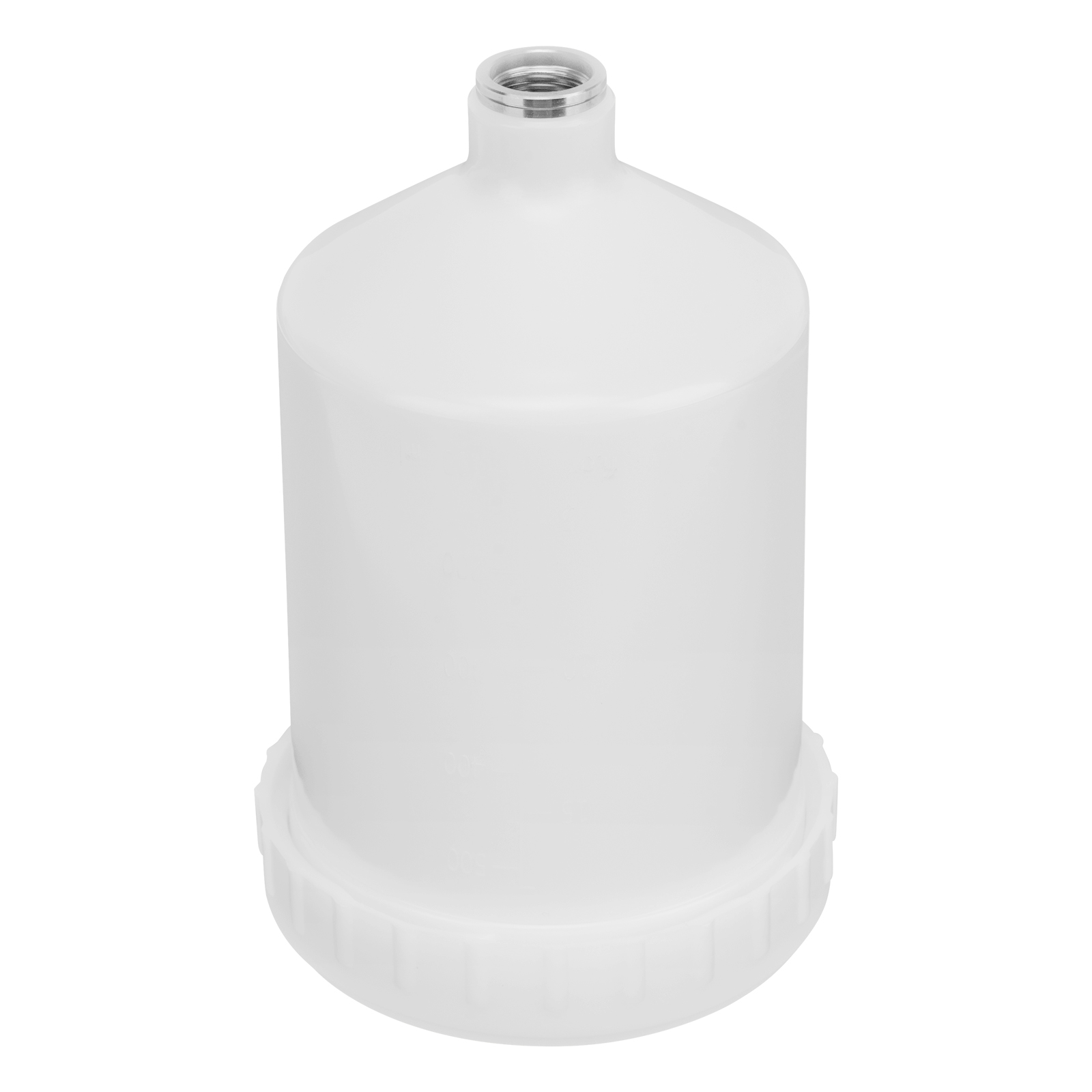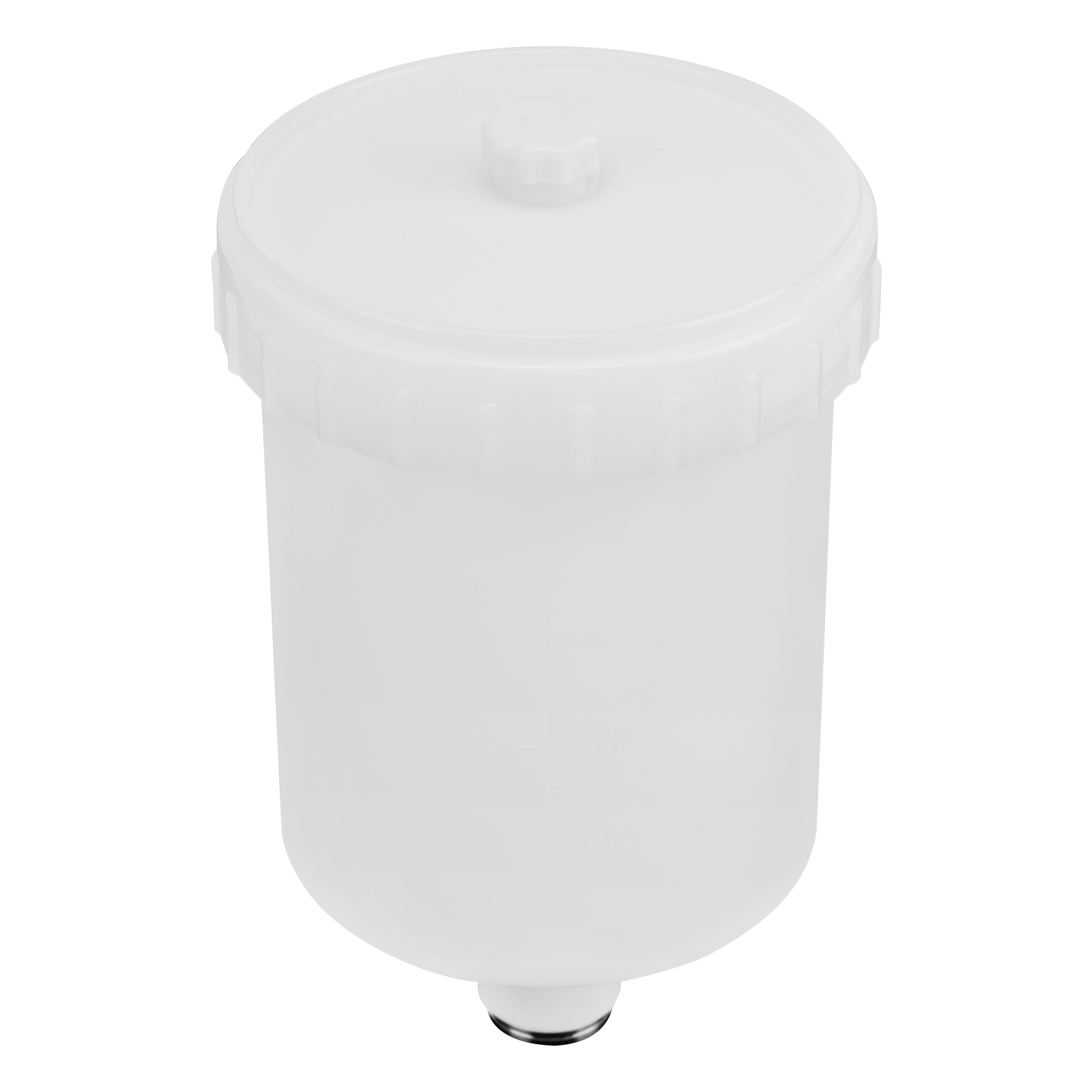 - Бачок объемом 0,6 л для окрасочного материала — его наличие повышает мобильность краскопульта — мастеру не нужно подключать инструмент к дополнительным емкостям.