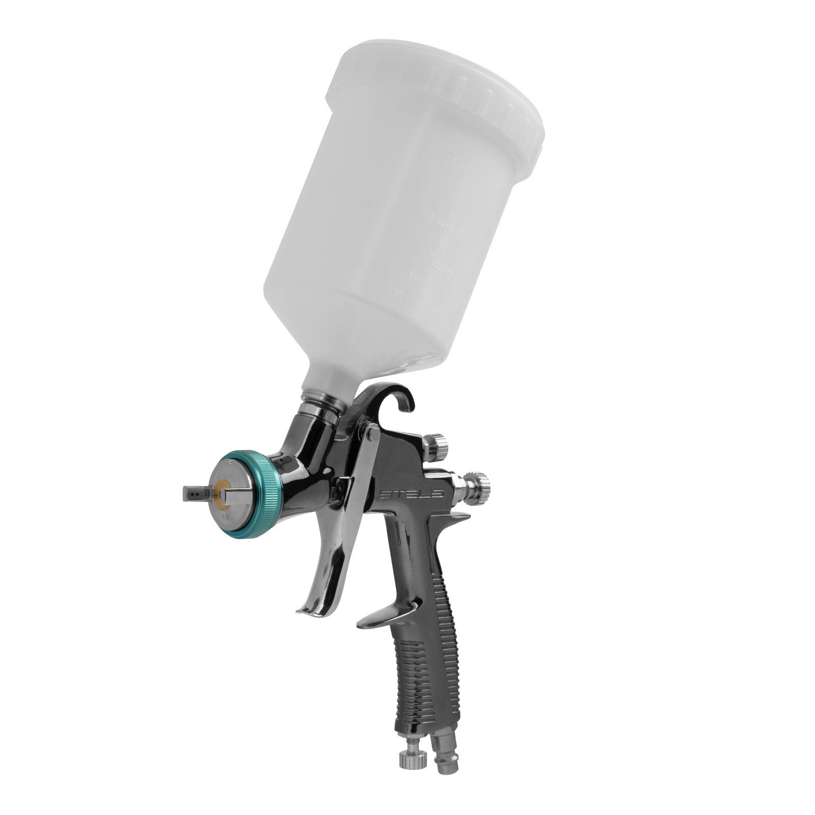 Профессиональный пневматический краскораспылитель гравитационного типа Stels AG 950 LVLP 57367 с соплом диаметром 1,5 мм подходит для проведения окрасочных работ, покрытия керамики глазурью, грунтовки стен, побелки потолков, лакирования дерева. Технология «Низкий объем, низкое давление» (Low Volume Low Pressure) позволяет уменьшить расход окрасочного материала до 140-190 мл/мин и добиться его 80-процентного переноса на обрабатываемую поверхность. Поэтому краскопульт отлично подойдет для применения как в быту, так и на производствах.