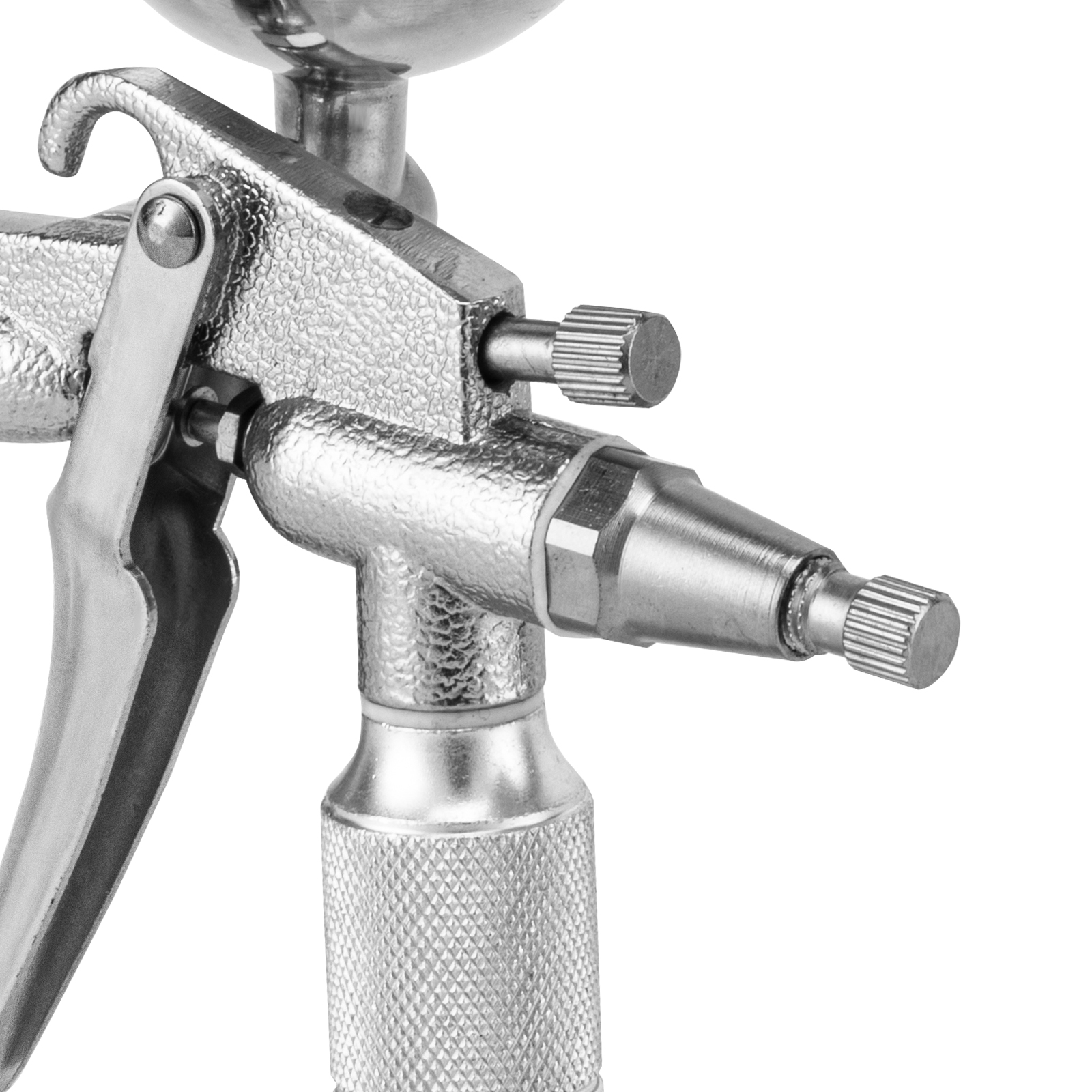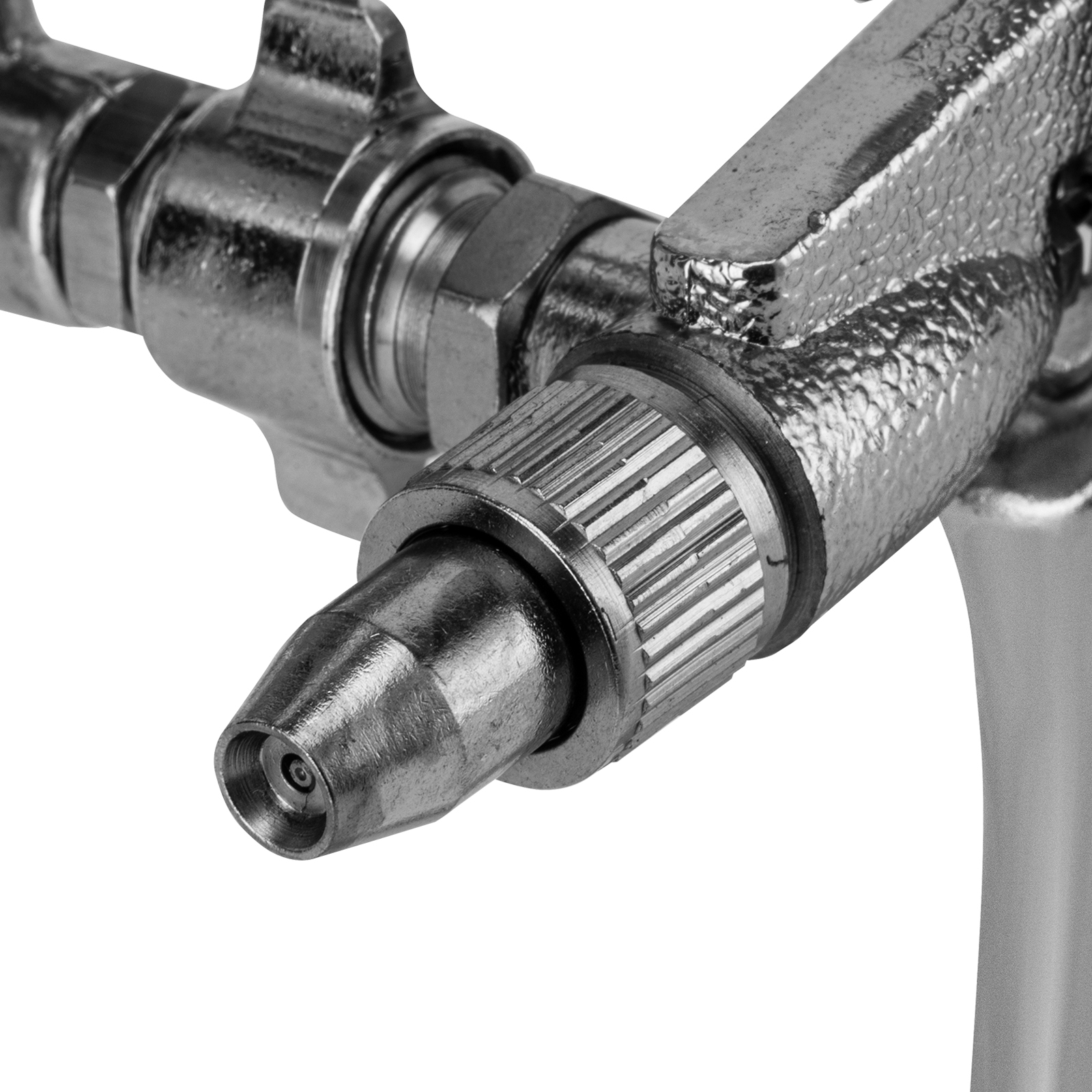 Пневматический краскораспылитель Matrix 57318 с верхним бачком объемом 0,1 л и соплом диаметром 0,5 мм позволяет равномерно распределить грунтовку или краску по поверхности и применяется для финишных работ. Краскопульт можно использовать с масляными и латексными красками, воздух расходуется со скоростью 140 л/мин.