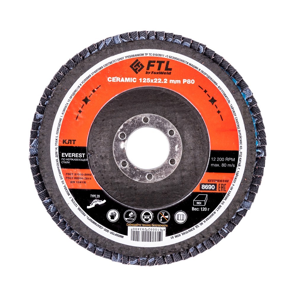 Круг лепестковый с керамическим абразивом для шлифования по нержавеющей стали FTL Everest 29 125 х 22,2 мм P80 в Челябинске