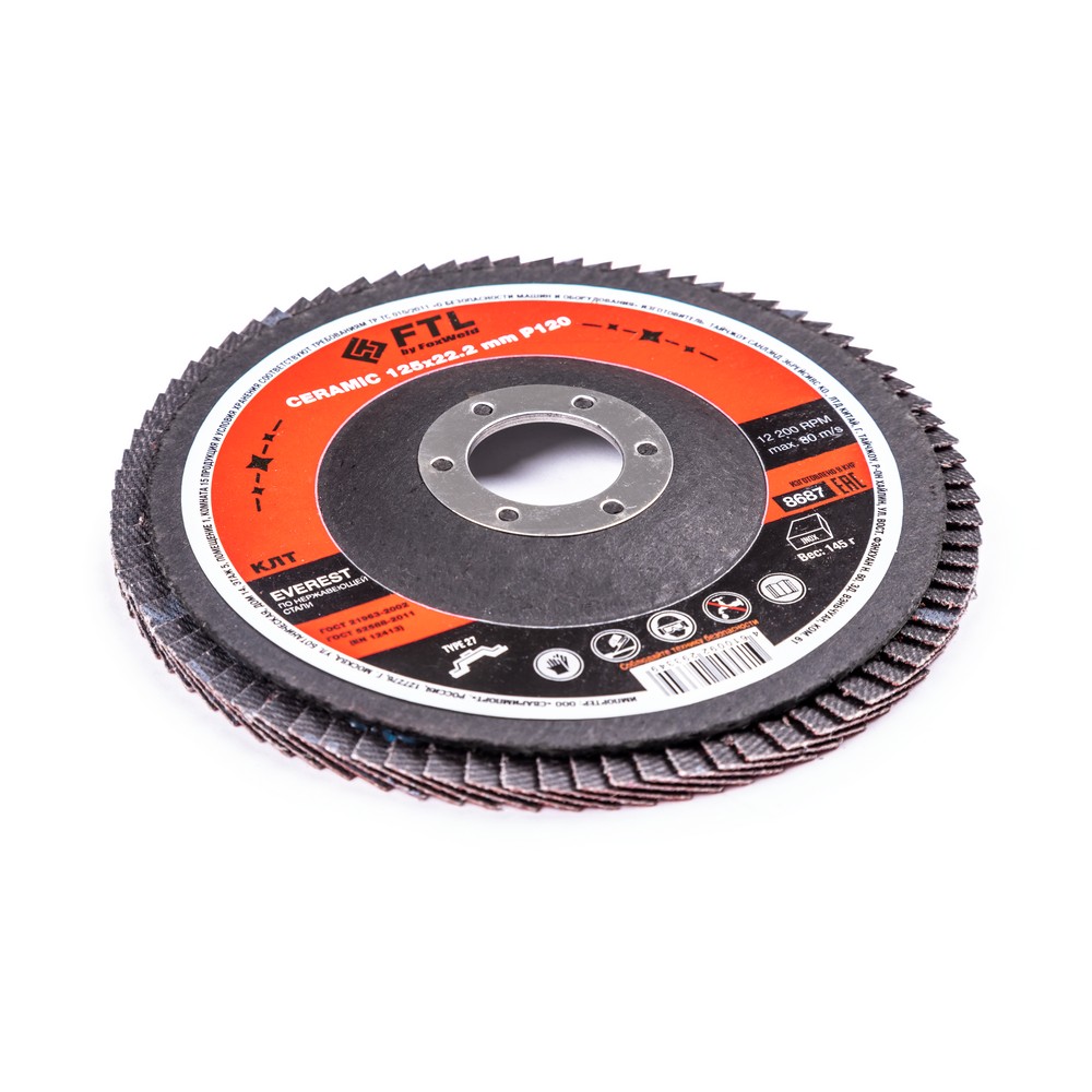 Круг лепестковый с керамическим абразивом для шлифования по нержавеющей стали FTL Everest 27 125 х 22,2 мм P120