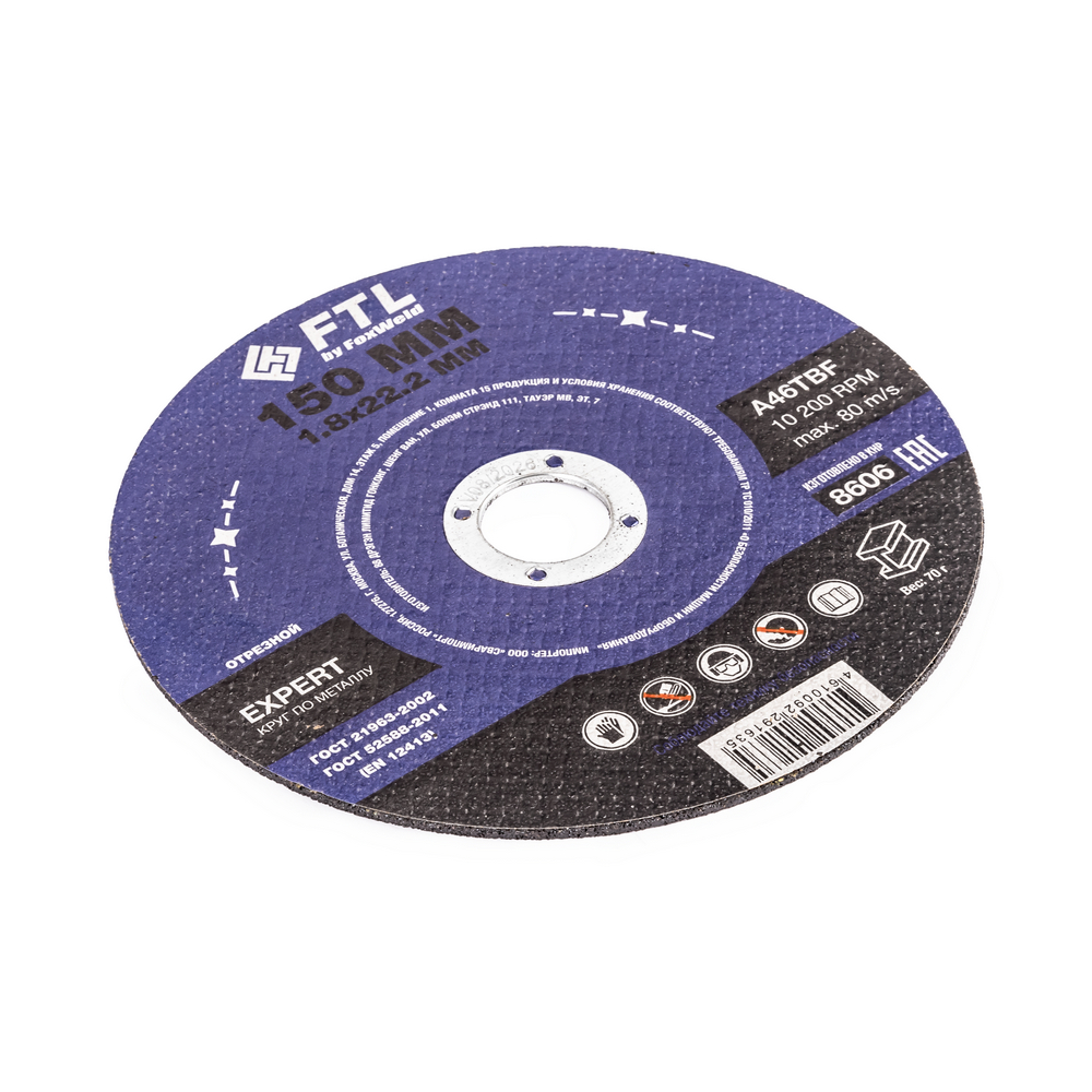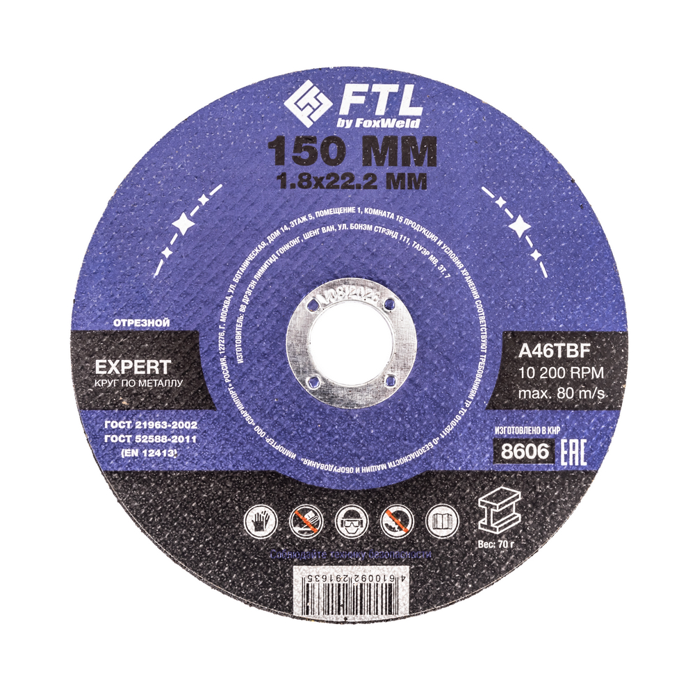 Диск отрезной по металлу FTL Expert 150 х 1,8 х 22,2 мм A46TBF - расходный инструмент для ручной угловой шлифовальной машины, предназначенный для резки различных изделий из чёрных металлов (чугунов). Конструктивно представляет собой плоский диск (тип 41), поверхность которого покрыта слоем абразивных частиц. Посыпка скреплена между собой бакелитовой связкой и армирована одной стекловолоконной сеткой и тканой подложкой. Поставляется во влагозащитной упаковке. Серия EXPERT - абразивный состав, оптимизированный для высокой износостойкости при резе чёрных металлов. Это свойство даёт увеличенный срок службы одного круга, давая возможность сделать значительно бóльшее количество резов заготовки, чем круги с обычным абразивом. Не рекомендуется для реза изделий из нержавеющей стали во избежание перегрева, прижога, окисления, потери эффективности легирующих добавок.ИЗНОСОСТОЙКОСТЬ: Благодаря премиальной формуле режущая и шлифовальная способность абразива снижается в процессе работы значительно медленнее, позволяя выполнить больше работы.УНИКАЛЬНЫЙ СОСТАВ: Технология производства включает в себя эксклюзивный рецепт абразива и смол: применение только твёрдых составов класса ВТ1, ВТ2, армирование сеткой из стекловолокна. Высокая твёрдость связывающей смолы позволяет сделать значительно большее количество резов по сравнению с кругами с обычным абразивом.МЕТАЛЛИЧЕСКОЕ КОЛЬЦО: Металлическое кольцо на диске обеспечивает плотную посадку на фланец УШМ, исключая биения и вибрацию при работе.ГЕРМЕТИЧНОСТЬ УПАКОВКИ: Диски упакованы в специальную термоусадочную герметичную плёнку, которая предохраняет от пыли и влаги при длительном хранении в условиях повышенной влажности, на строительных объектах и крупных промышленных производствах.ПРЕИМУЩЕСТВА:По чёрному металлу (!)Тип 41 (плоский)Высокая износостойкость (долгий срок службы)Состав на базе оксида алюминияПрофессиональный компаундМеталлическое кольцо для плотной посадки на фланец УШМВлагозащитная упаковкаКОМПЛЕКТАЦИЯ: Отрезной круг по чёрному металлу в термоусадочной плёнке со вкладышем – 10 шт.