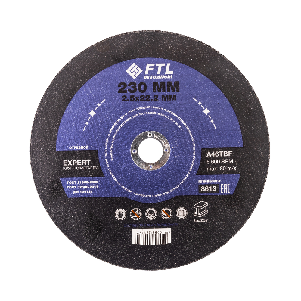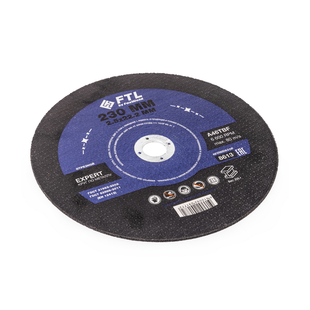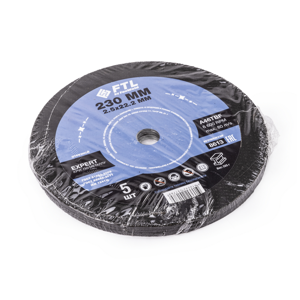 Диск отрезной по металлу FTL Expert 230 х 2,5 х 22,2 мм A46TBF - расходный инструмент для ручной угловой шлифовальной машины, предназначенный для резки различных изделий из чёрных металлов (чугунов). Конструктивно представляет собой плоский диск (тип 41), поверхность которого покрыта слоем абразивных частиц. Посыпка скреплена между собой бакелитовой связкой и армирована одной стекловолоконной сеткой и тканой подложкой. Поставляется во влагозащитной упаковке. Серия EXPERT - абразивный состав, оптимизированный для высокой износостойкости при резе чёрных металлов. Это свойство даёт увеличенный срок службы одного круга, давая возможность сделать значительно бóльшее количество резов заготовки, чем круги с обычным абразивом. Не рекомендуется для реза изделий из нержавеющей стали во избежание перегрева, прижога, окисления, потери эффективности легирующих добавок.ИЗНОСОСТОЙКОСТЬ: Благодаря премиальной формуле режущая и шлифовальная способность абразива снижается в процессе работы значительно медленнее, позволяя выполнить больше работы.УНИКАЛЬНЫЙ СОСТАВ: Технология производства включает в себя эксклюзивный рецепт абразива и смол: применение только твёрдых составов класса ВТ1, ВТ2, армирование сеткой из стекловолокна. Высокая твёрдость связывающей смолы позволяет сделать значительно большее количество резов по сравнению с кругами с обычным абразивом.МЕТАЛЛИЧЕСКОЕ КОЛЬЦО: Металлическое кольцо на диске обеспечивает плотную посадку на фланец УШМ, исключая биения и вибрацию при работе.ГЕРМЕТИЧНОСТЬ УПАКОВКИ: Диски упакованы в специальную термоусадочную герметичную плёнку, которая предохраняет от пыли и влаги при длительном хранении в условиях повышенной влажности, на строительных объектах и крупных промышленных производствах.ПРЕИМУЩЕСТВА:По чёрному металлу (!)Тип 41 (плоский)Высокая износостойкость (долгий срок службы)Состав на базе оксида алюминияПрофессиональный компаундМеталлическое кольцо для плотной посадки на фланец УШМВлагозащитная упаковкаКОМПЛЕКТАЦИЯ: Отрезной круг по чёрному металлу в термоусадочной плёнке со вкладышем – 5 шт.