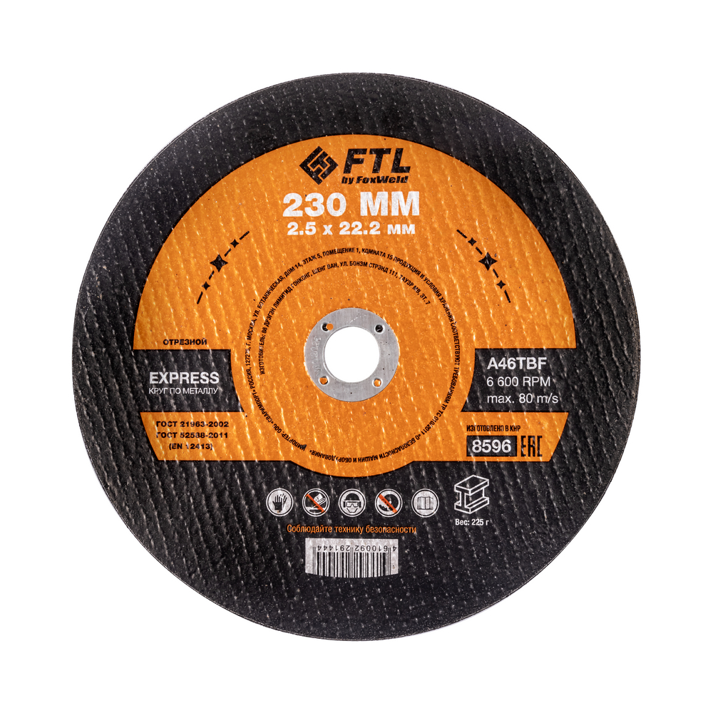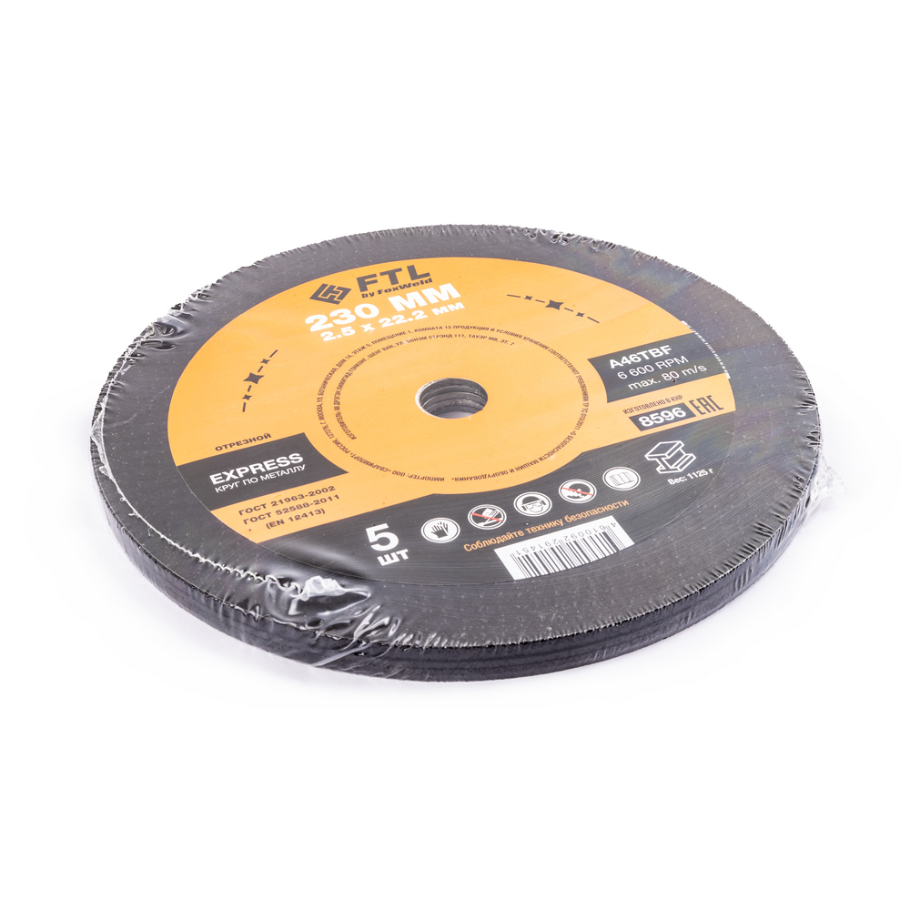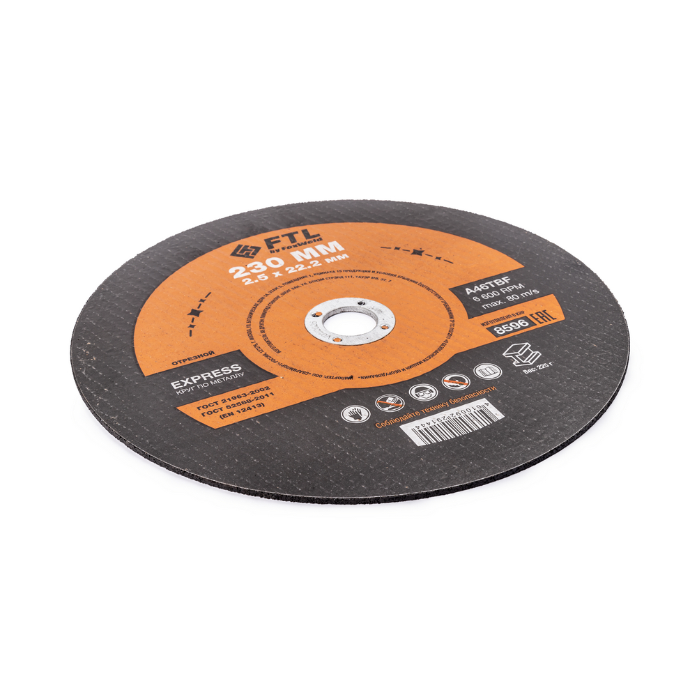 Диск отрезной по металлу FTL Express 230 х 2,5 х 22,2 мм A46TBF - расходный инструмент для ручной угловой шлифовальной машины, предназначенный для резки различных изделий из чёрных металлов (чугунов). Конструктивно представляет собой плоский диск (тип 41), поверхность которого покрыта слоем абразивных частиц. Посыпка скреплена между собой бакелитовой связкой и армирована одной стекловолоконной сеткой и тканой подложкой. Поставляется во влагозащитной упаковке. Серия EXPRESS представляет абразивный состав высокой твёрдости, оптимизированный для скоростного реза чёрных металлов. Не рекомендуется для реза изделий из нержавеющей стали во избежание перегрева, прижога, окисления, потери эффективности легирующих добавок.ИЗНОСОСТОЙКОСТЬ: Благодаря премиальной формуле режущая и шлифовальная способность абразива снижается в процессе работы значительно медленнее, позволяя выполнить больше работы.УНИКАЛЬНЫЙ СОСТАВ: Технология производства включает в себя эксклюзивный рецепт абразива и смол: применение только твёрдых составов класса ВТ1, ВТ2, армирование сеткой из стекловолокна. Высокая твёрдость связывающей смолы позволяет сделать значительно большее количество резов по сравнению с кругами с обычным абразивом.МЕТАЛЛИЧЕСКОЕ КОЛЬЦО: Металлическое кольцо на диске обеспечивает плотную посадку на фланец УШМ, исключая биения и вибрацию при работе.ГЕРМЕТИЧНОСТЬ УПАКОВКИ: Диски упакованы в специальную термоусадочную герметичную плёнку, которая предохраняет от пыли и влаги при длительном хранении в условиях повышенной влажности, на строительных объектах и крупных промышленных производствах.ПРЕИМУЩЕСТВА:По чёрному металлу (!)Тип 41 (плоский)Быстрый резСостав на базе оксида алюминияМеталлическое кольцо для плотной посадки на фланец УШМВысокая твёрдость составаВлагозащитная упаковкаКОМПЛЕКТАЦИЯ: Отрезной круг по чёрному металлу в термоусадочной плёнке со вкладышем – 5 шт.