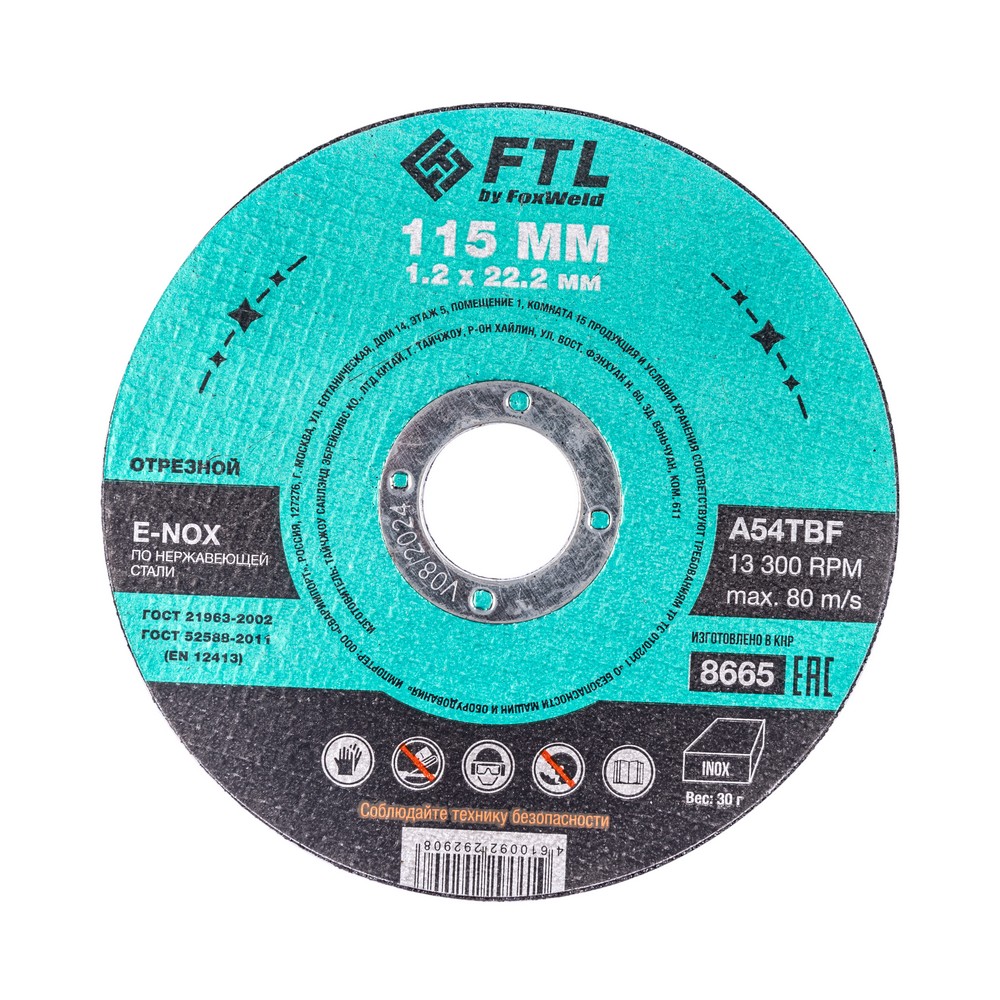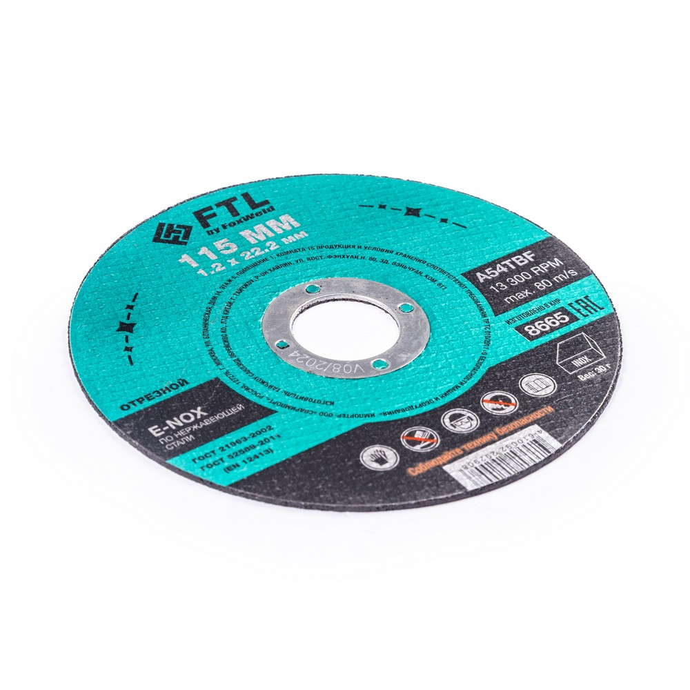 Диск отрезной по нержавеющей стали FTL E-Nox 115 х 1,2 х 22,2 мм A54TBF – это расходный инструмент для ручной угловой шлифовальной машины, предназначенный для резки деталей и конструкций, профиля и листового металла из нержавеющих и легированных сталей. Конструктивно представляет собой плоский диск (тип 41), поверхность которого покрыта слоем абразивных частиц. Посыпка скреплена между собой бакелитовой связкой и армирована одной стекловолоконной сеткой и тканой подложкой. Поставляется во влагозащитной упаковке. Серия E-NOX - новый специализированный абразивный компаунд для работы по изделиям из нержавеющей стали. Оксид циркония с лучшей теплопроводностью эффективно отводит тепло из зоны реза, противостоит прижогу и перегреву, сохраняя легирующие свойства нержавеющей стали. Минимальные значения железа, серы и хлора в составе абразива гарантируют защиту от окисления. Не рекомендуется к работе с изделиями из чёрных металлов из-за недостаточной износостойкости (увеличенного расхода материала диска при работе).УВЕЛИЧЕННАЯ СКОРОСТЬ РЕЗА: Компаунд на базе оксида циркония не перегревает, не окисляет, не искрит, не дымит, при этом демонстрируя высокий результат по количеству резов и скорости работы по сравнению с составами абразива общего значения.ВЫСОКОКАЧЕСТВЕННЫЙ ОКСИД ЦИРКОНИЯ: Серия E-NOX – это новый, узко специализированный состав для работы по нержавеющей стали, титану и меди. Благодаря присутствию оксида циркония в составе компаунда, круги не перегревают материалы, сберегая заготовки от побежалостей, посинений, окислений, при этом демонстрируя высокие результаты по количеству резов и скорости работы. Комфортный и мягкий рез по нержавейке.УНИКАЛЬНЫЙ СОСТАВ: Технология производства включает в себя эксклюзивный рецепт абразива и смол: применение только твёрдых составов класса ВТ1, ВТ2, армирование сеткой из стекловолокна. Высокая твёрдость связывающей смолы позволяет сделать значительно большее количество резов по сравнению с кругами с обычным абразивом.МЕТАЛЛИЧЕСКОЕ КОЛЬЦО: Металлическое кольцо на диске обеспечивает плотную посадку на фланец УШМ, исключая биения и вибрацию при работе.ГЕРМЕТИЧНОСТЬ УПАКОВКИ: Диски упакованы в специальную термоусадочную герметичную плёнку, которая предохраняет от пыли и влаги при длительном хранении в условиях повышенной влажности, на строительных объектах и крупных промышленных производствах.ПРЕИМУЩЕСТВА:По нержавеющей и легированной сталиОксид циркония (не перегревает материалы)Минимальное содержание железа, серы, хлора (не окисляет материалы)Тип 41 (плоский)Увеличенный срок службыФибергласс – прочное стекловолоконное основание дискаМеталлическое кольцо для плотной посадки на фланец УШМВлагозащитная упаковкаКОМПЛЕКТАЦИЯ: Отрезной круг по чёрному металлу в термоусадочной плёнке со вкладышем – 10 шт.