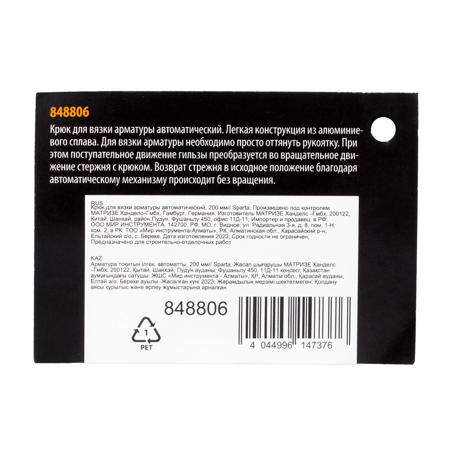 Автоматический крюк Sparta 848806 длиной 200 мм применяется для вязки арматуры. Позволяет быстро создать каркас и сетку из проволоки любого диаметра. Крюк используется для установки железобетонных конструкций и будет полезен на строительной площадке.