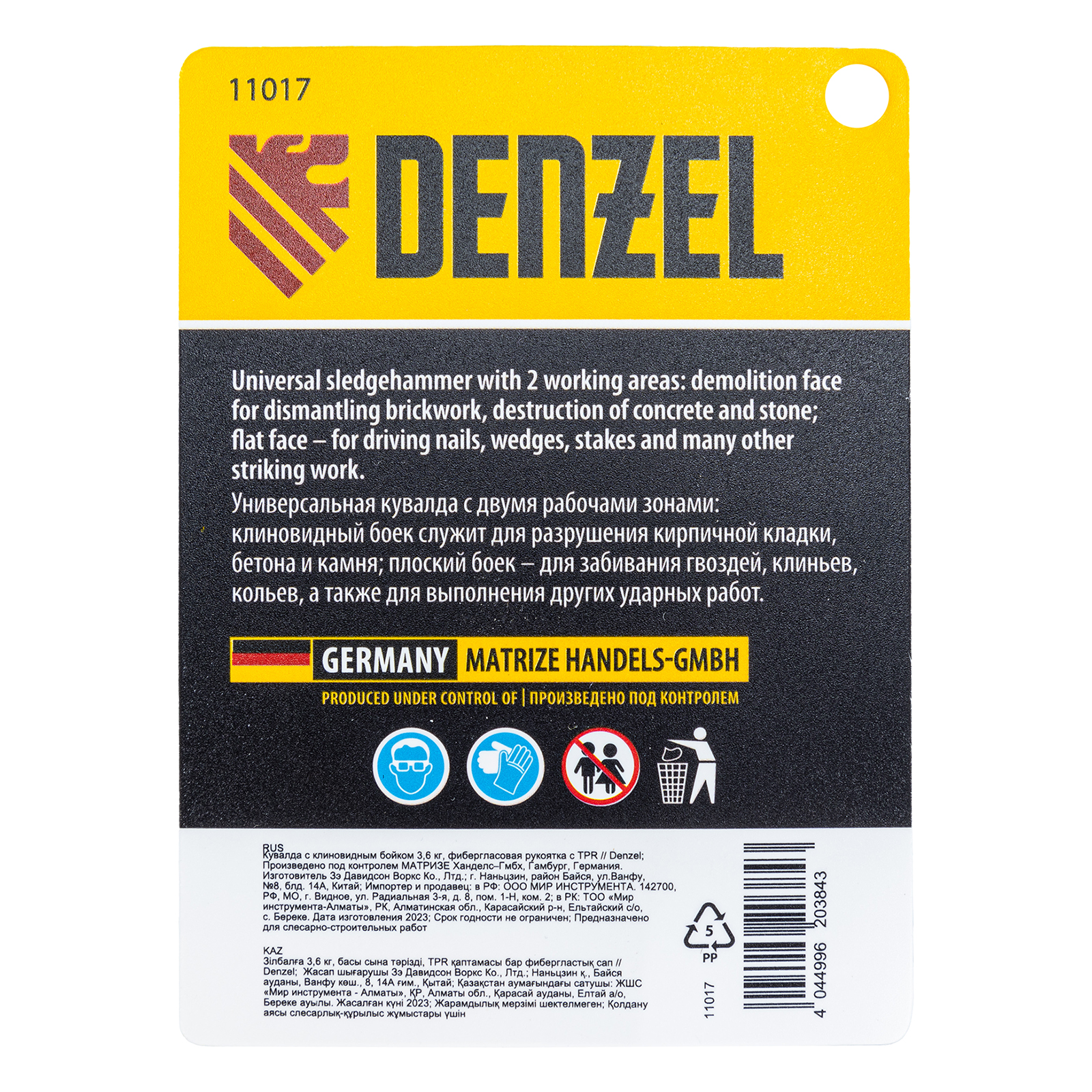 Кувалда с клиновидным бойком 3,6 кг, фибергласовая рукоятка c TPR Denzel в Челябинске