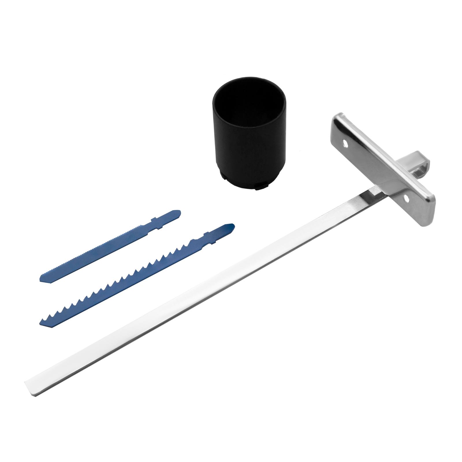 - Полная комплектация — лобзик поставляется с направляющей, пилками по дереву и металлу, шестигранным ключом, адаптером для подключения пылесоса и запасными угольными щетками.