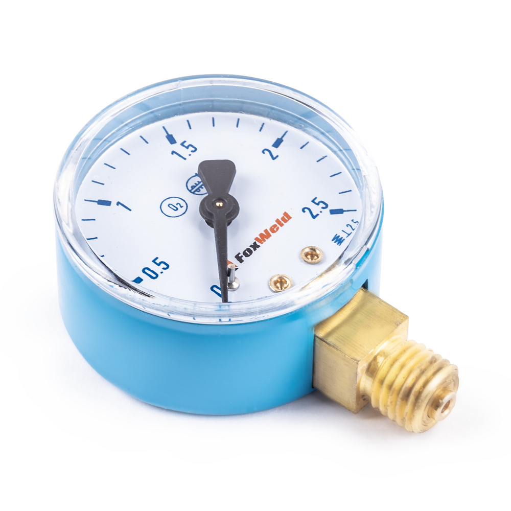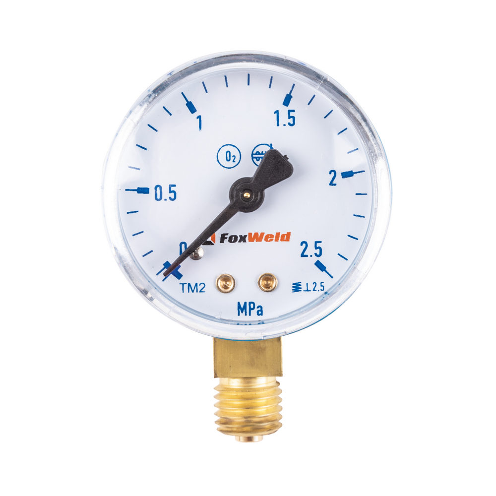 Манометр Foxweld предназначен для измерения и отражения давления кислорода от 0 до 2,5 МПа в баллоне при выполнении сварочных работ. В данном измерительном приборе применяется аналоговый метод работы и индикации. Присоединяется  радиально. Корпус выполнен из латуни.