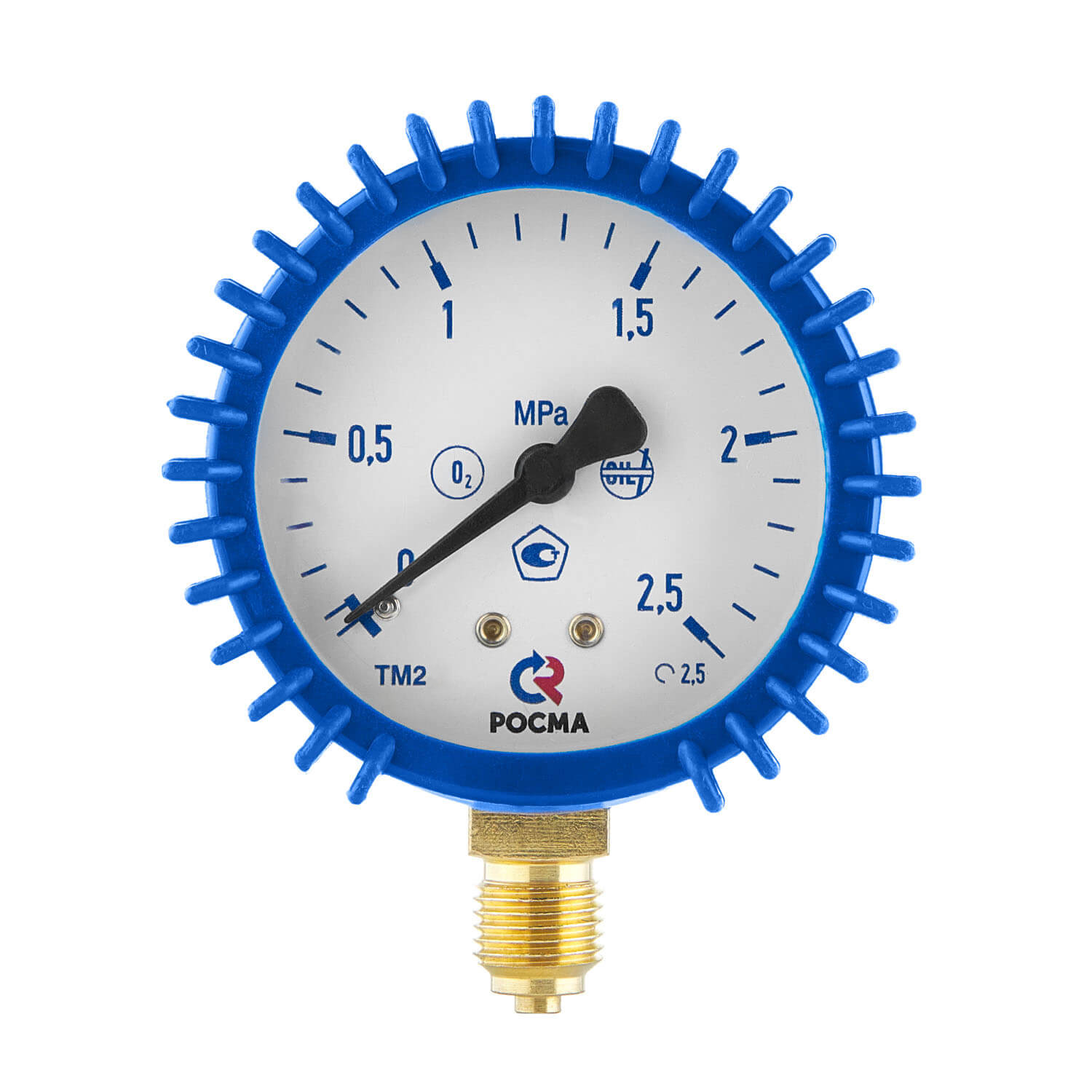 Сварочный манометр для измерений показаний давления кислорода от 0 до 2,5 МПа. Класс точности манометра – 2,5. Корпус манометра выполнен из стали, а механизм из латуни. Прибор имеет радиальное присоединение.