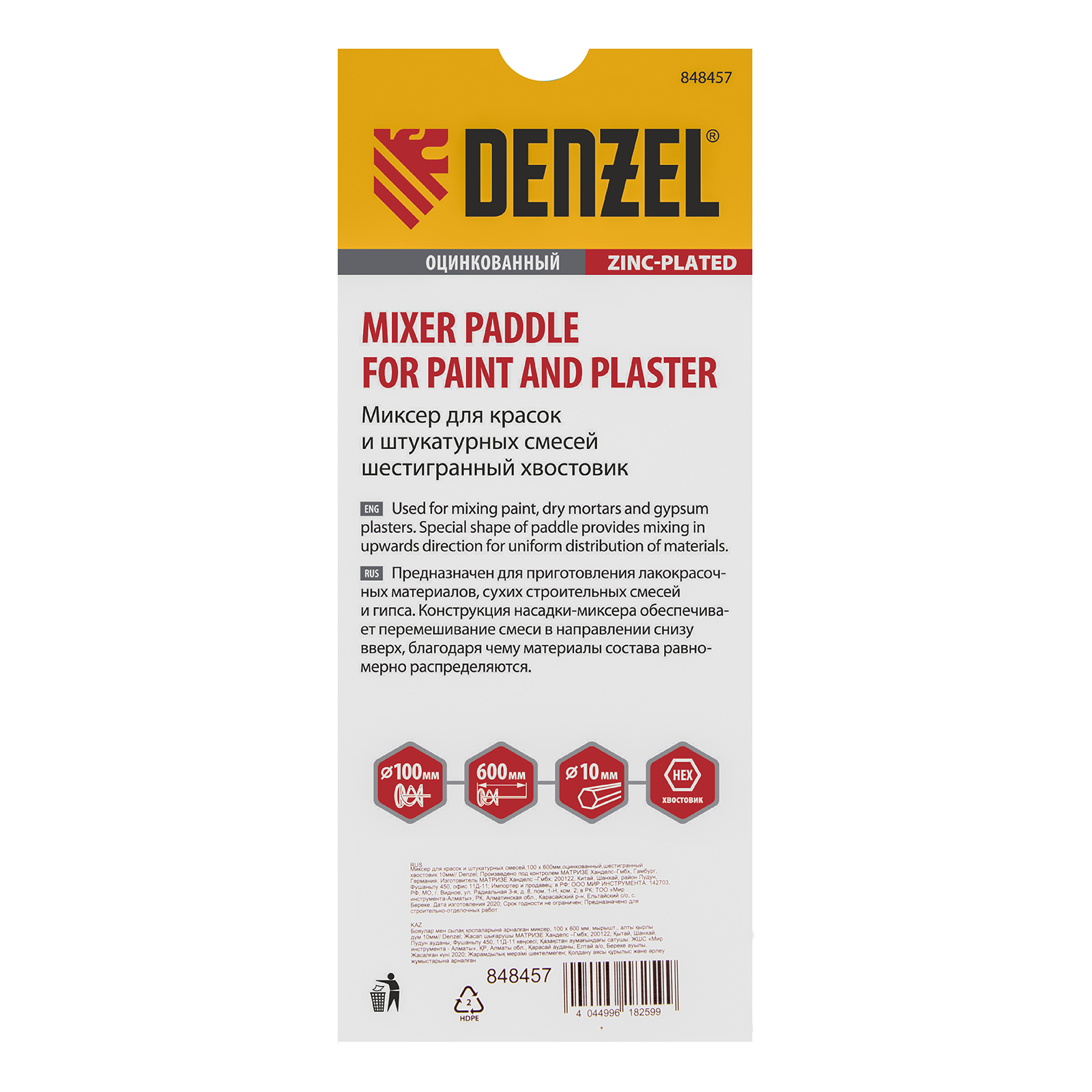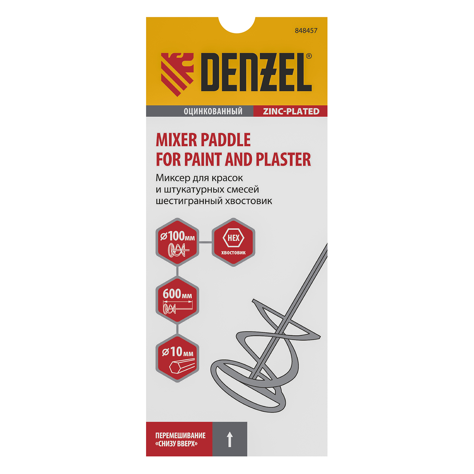 Миксер для красок и штукатурных смесей, 100 х 600 мм, оцинкованный, шестигранный хвостовик 10мм Denzel в Челябинске