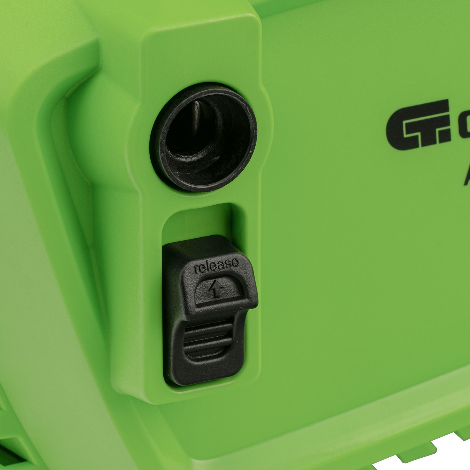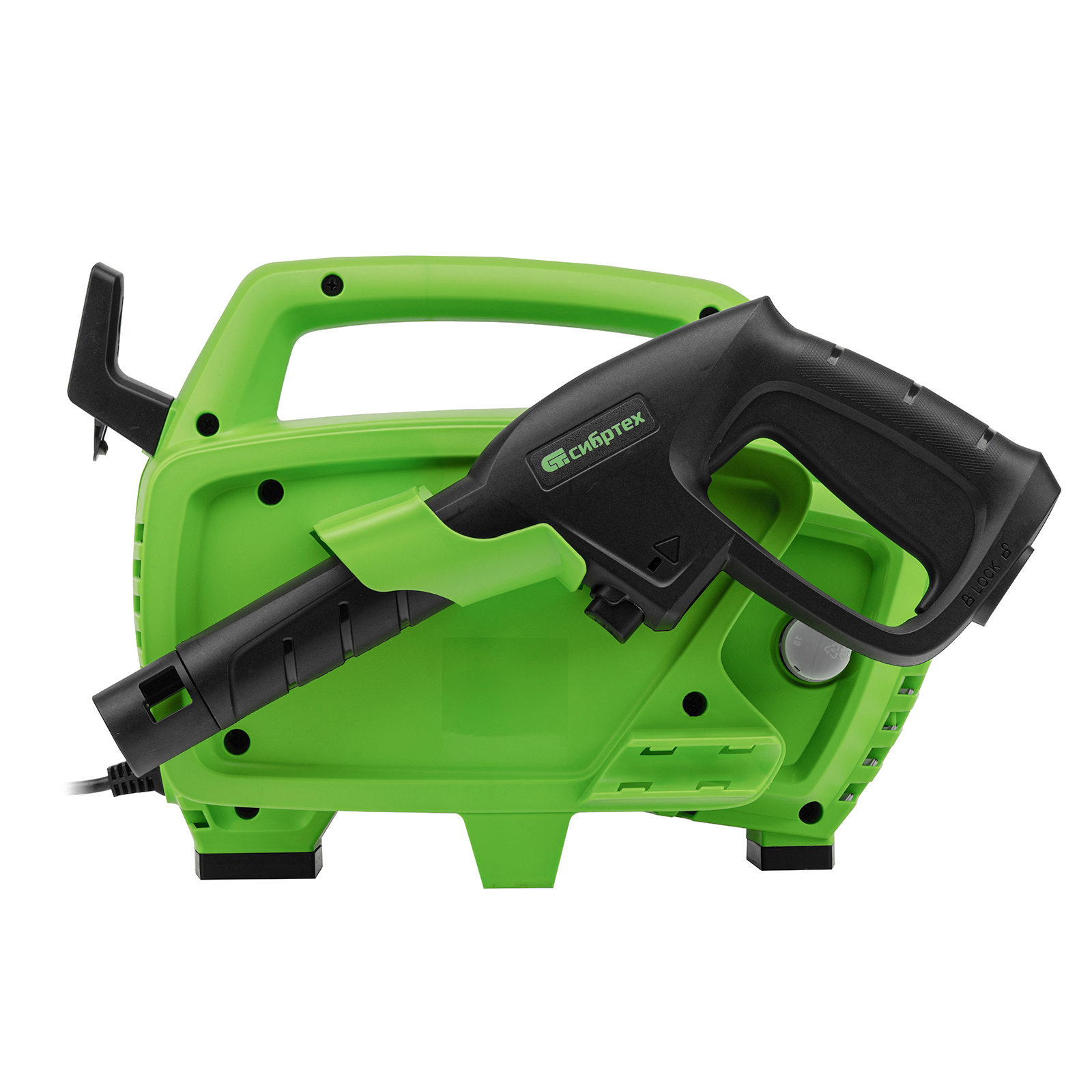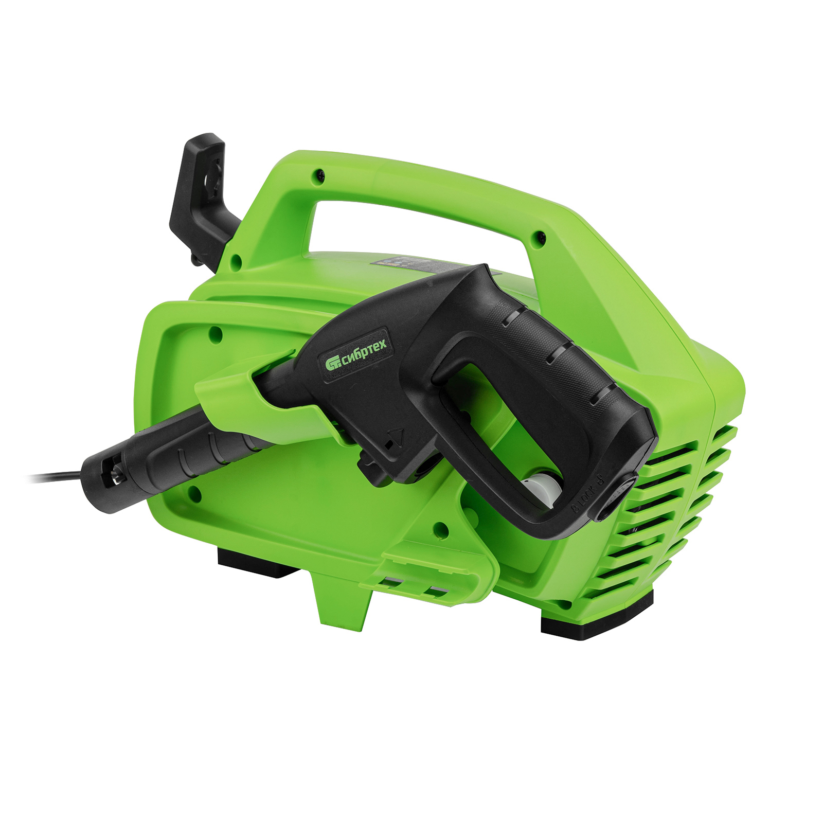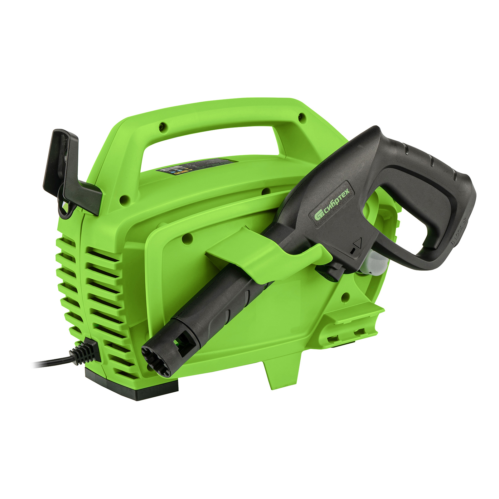 - Продуманное хранение и транспортировка — на корпусе имеется удобная ручка, предусмотрены специальные кронштейны для кабеля и шланга.