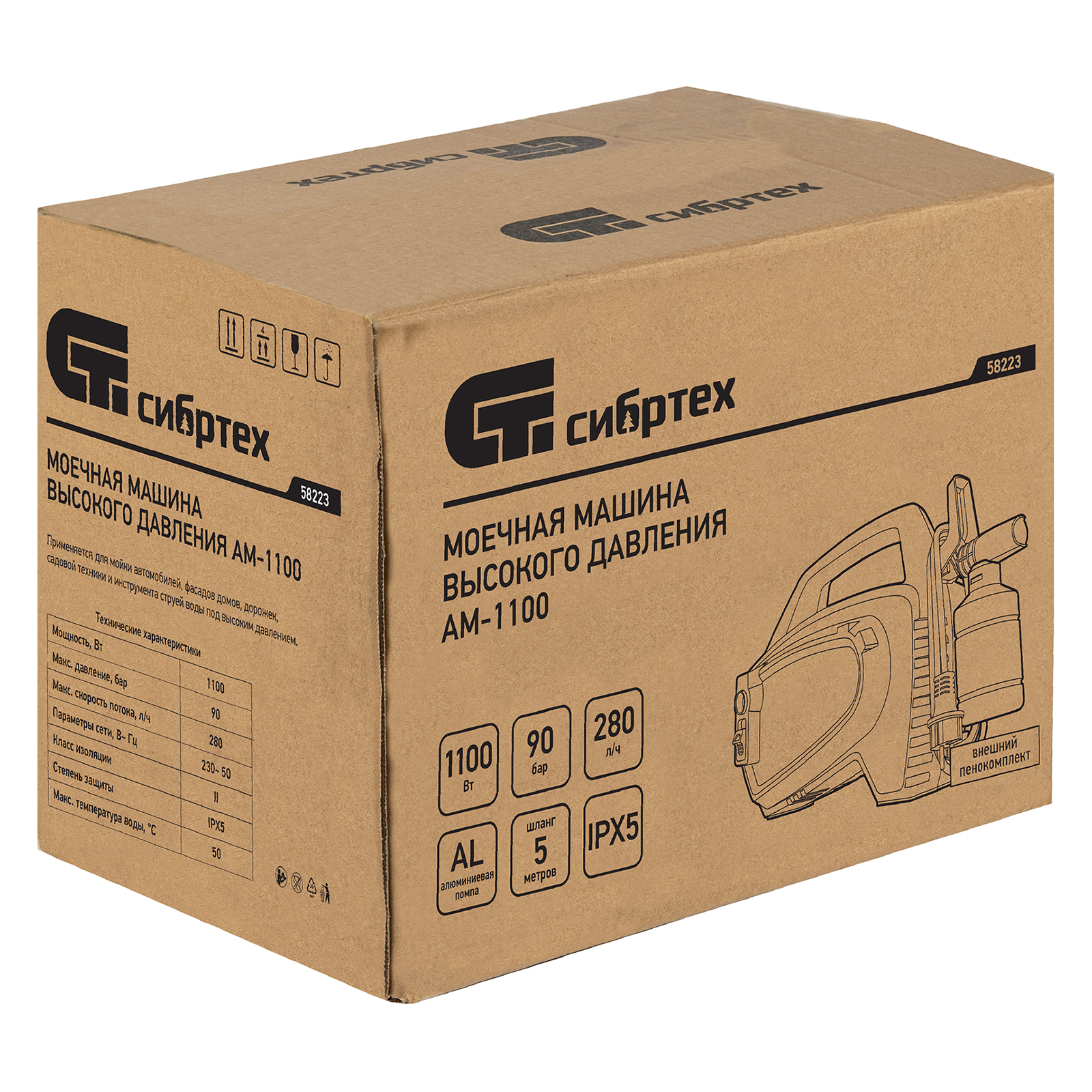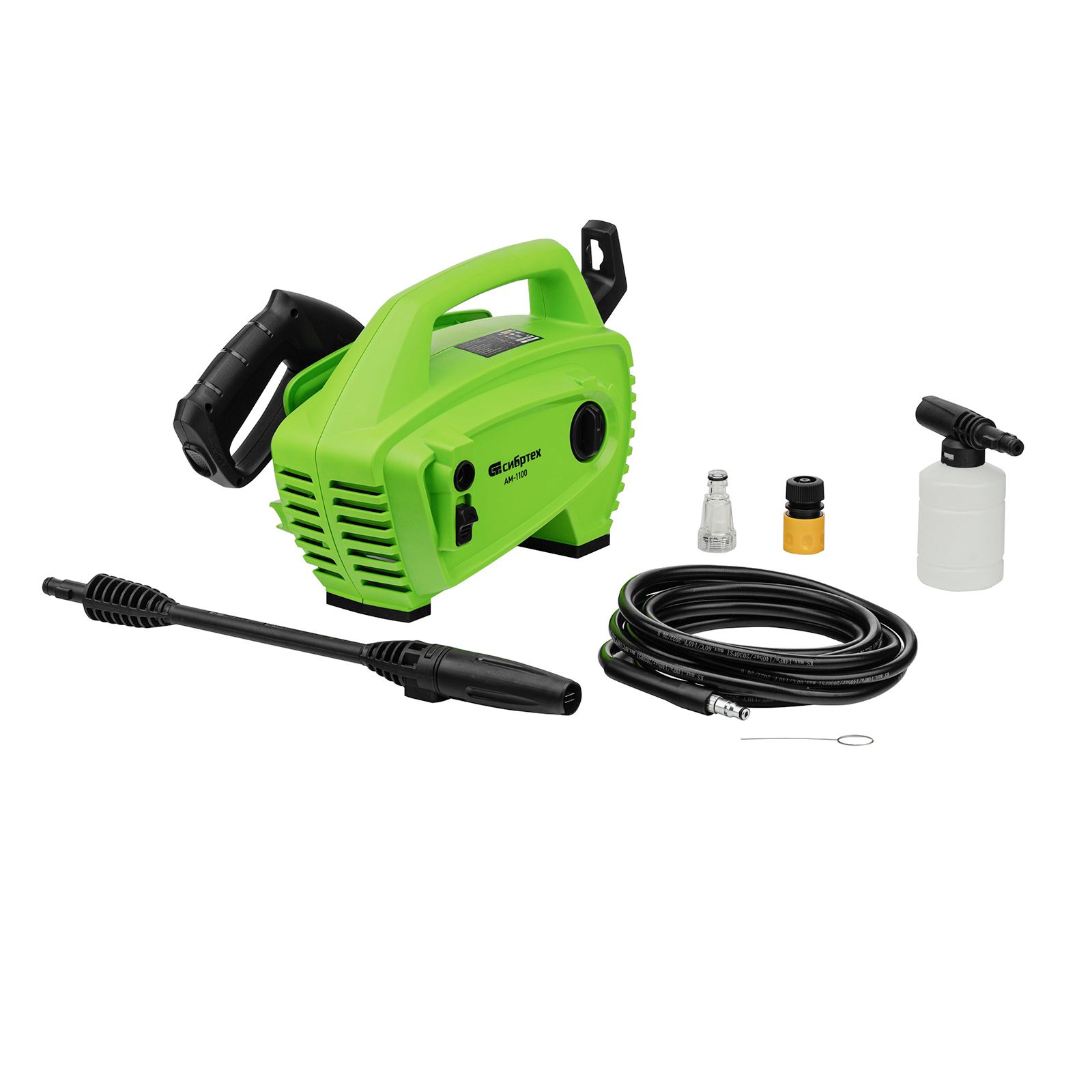 Переносная моечная машина высокого давления Сибртех AM-1100 58223 мощностью 1100 Вт и производительностью 280 л/ч подает струю воды под давлением 90 бар. Позволяет быстро очистить садовые дорожки, забор, стены строений, садовый инвентарь, уличную мебель, кузов автомобиля. Машина подключается к водопроводу, а также способна работать в режиме самовсасывания — в этом случае в качестве источника воды можно использовать любую емкость. Устройство будет полезно владельцам дачных участков.