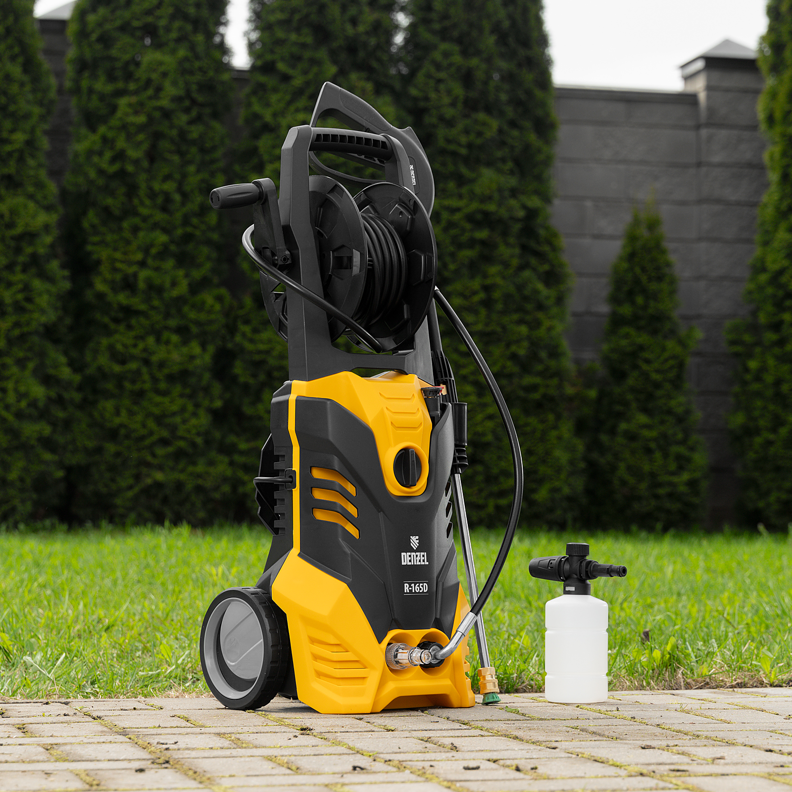 Колесная моечная машина высокого давления Denzel R-165D 58235 производительностью 7 л/мин, мощностью 2200 Вт, с максимальным давлением 165 бар, используется для мытья автомобилей, садового инвентаря, велосипедов, дорожек и заборов. Мощный мотор и помпа высокой производительности позволяют быстро справляться даже с серьезными загрязнениями. Если нет доступа к водопроводу, мойка может осуществлять забор воды из резервуара в режиме самовсасывания, теряя при этом всего 5% давления.