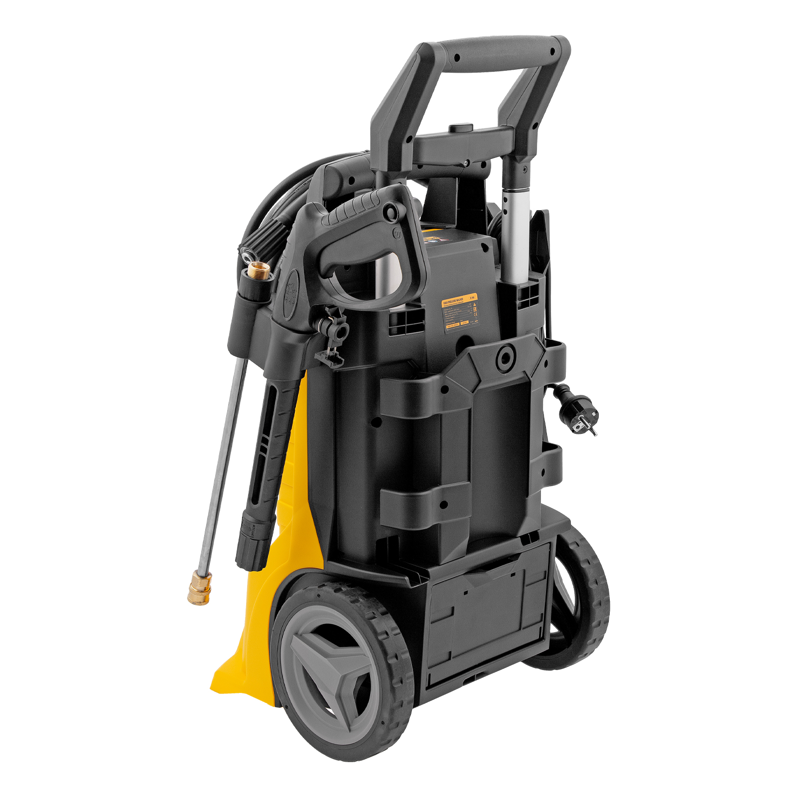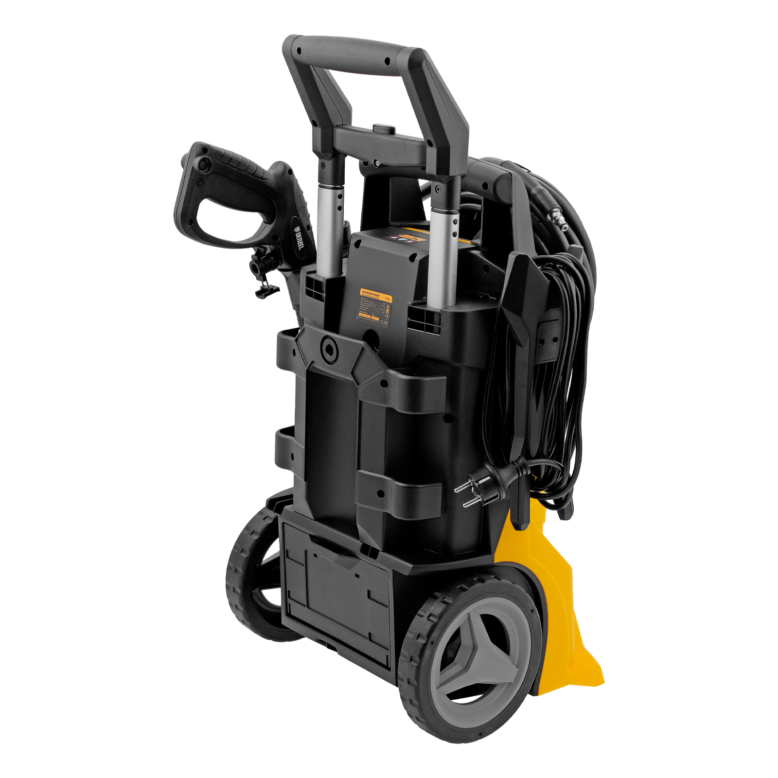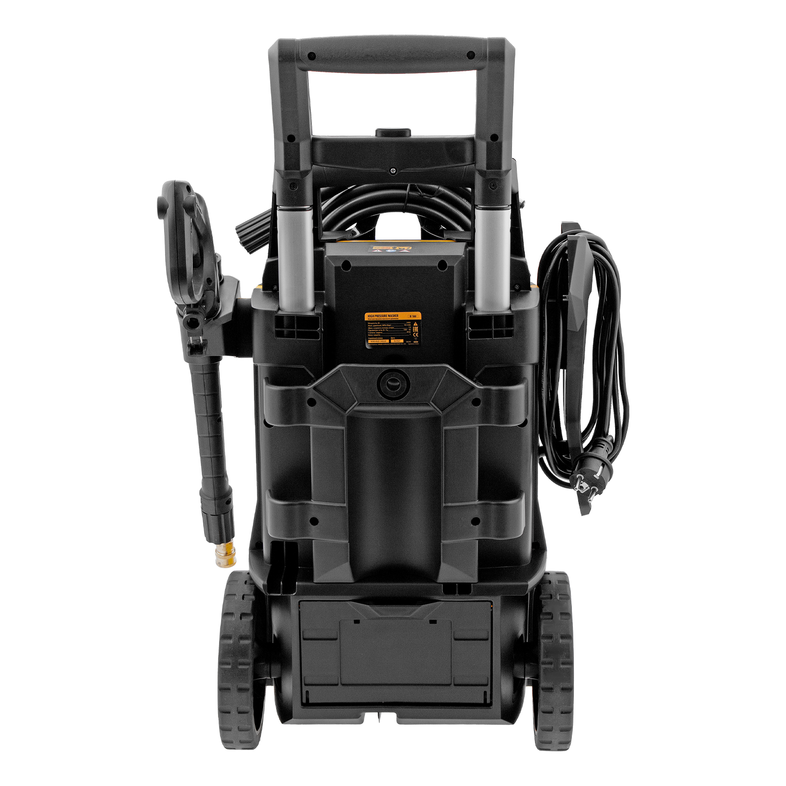 - Мобильность — колеса и телескопическая ручка позволяют легко перемещать мойку во время работы.