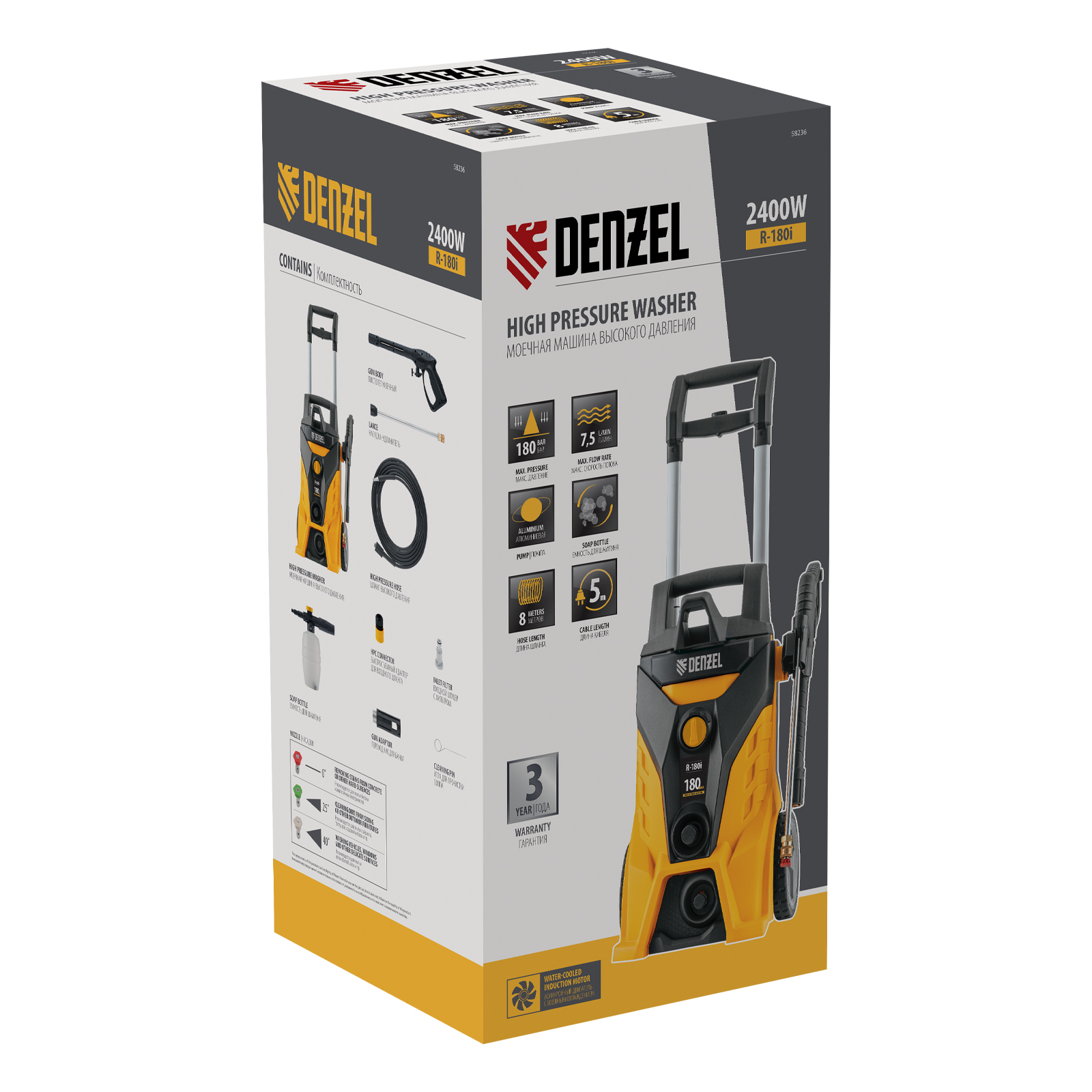 Моечная машина высокого давления R-180i, 2400 Вт, 180 бар, 7.5 л/мин, асинхронный двигатель Denzel в Челябинске
