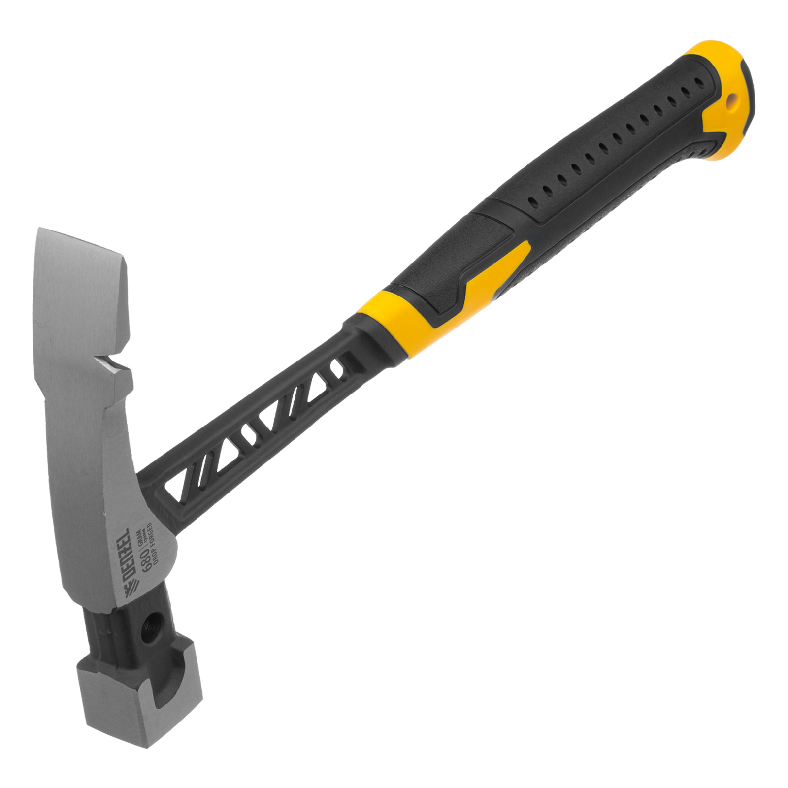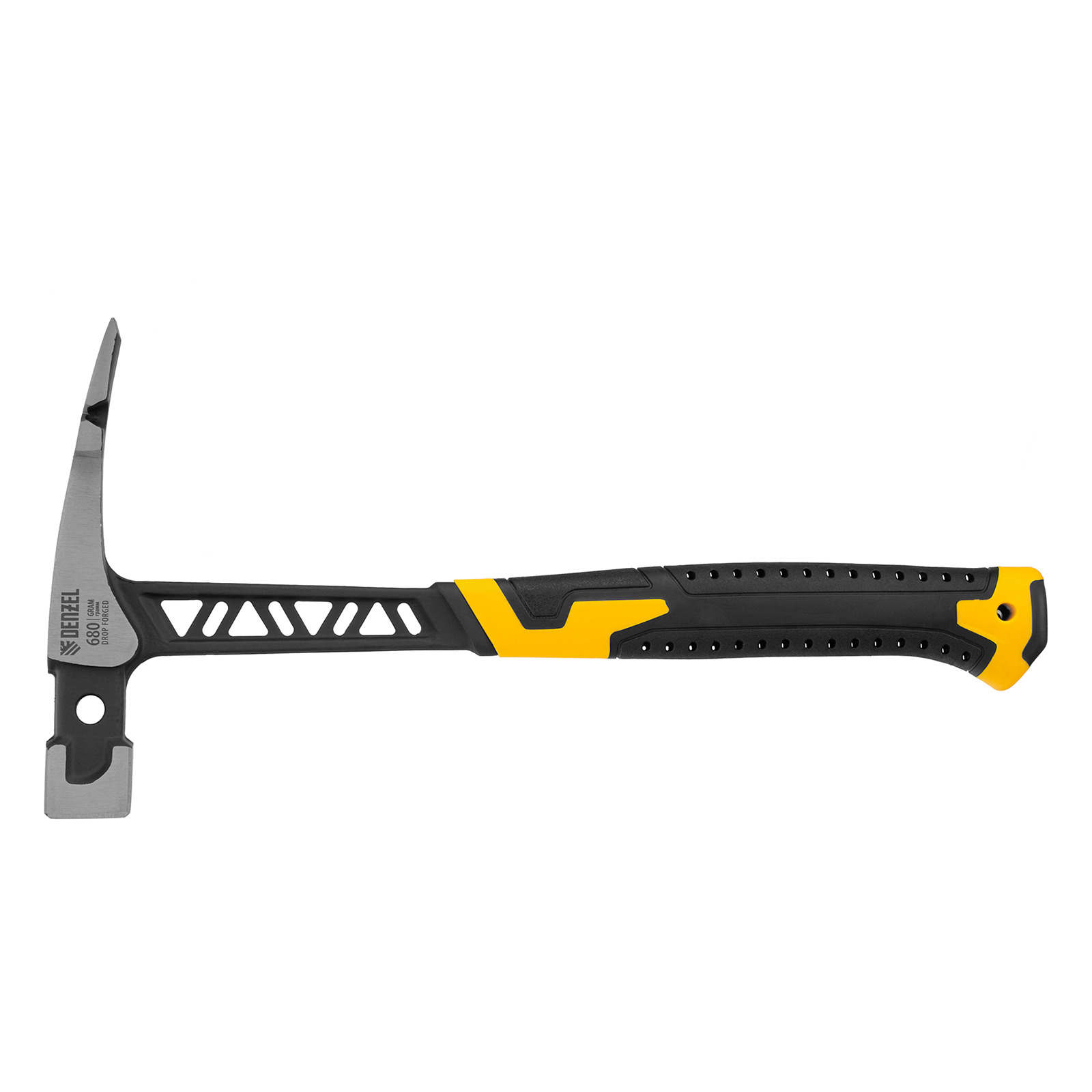 Цельнокованый молоток каменщика Denzel 10633 с бойком весом 680 г, с двухкомпонентной обрезиненной рукояткой, используется для выполнения работ с каменной или кирпичной кладкой. Квадратный боек предназначен для нанесения ударов, а удлиненный заточенный носок — для разрубания камня или кирпича. Гвоздодер применяется для выпрямления небольших гвоздей.