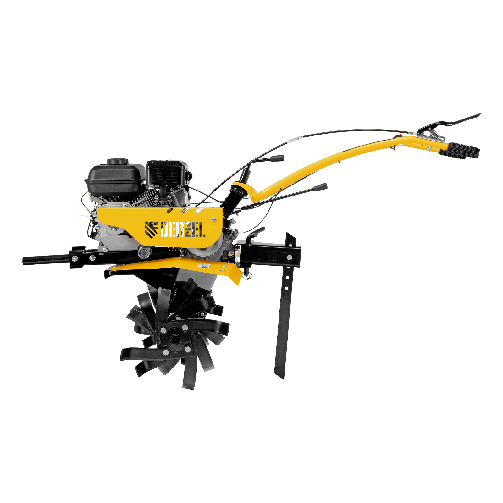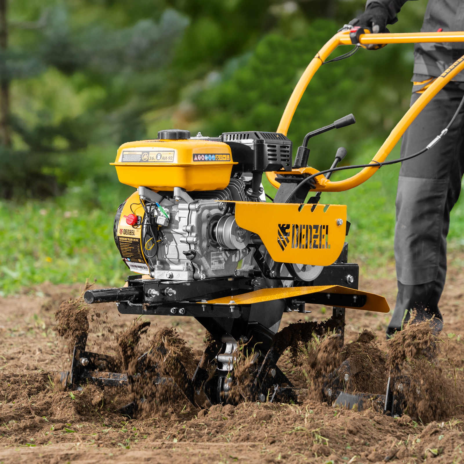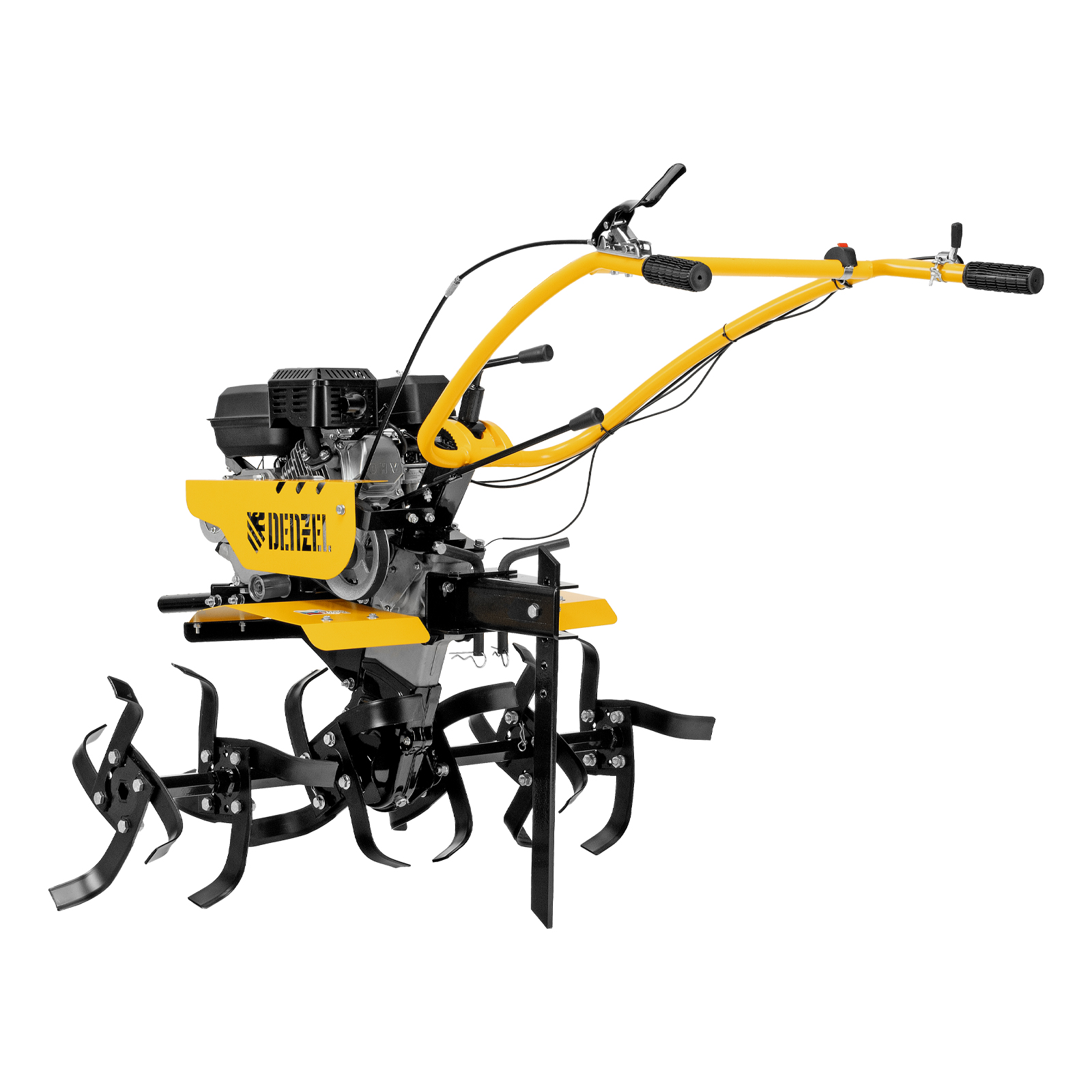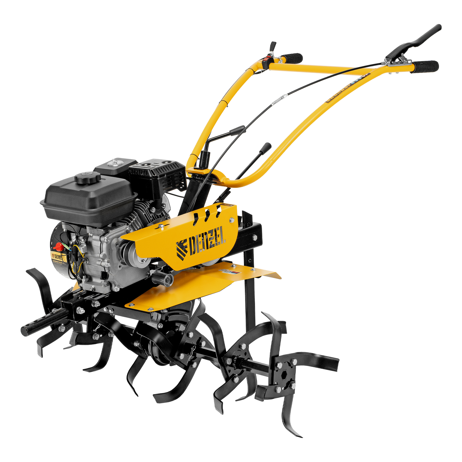 Мотоблок Denzel DPT-170S 56441 с двигателем мощностью 7 л. с., ременным механизмом сцепления, фрезами 3 х 4, шкивом отбора мощности (ШОМ) и коробкой передач 2В/1Н предназначен для проведения сельскохозяйственных работ. Максимальная ширина обработки составляет 1000 мм, глубина — 350 мм. Фрезы собираются из двух двойных и двух одинарных секций, что позволяет регулировать ширину вспашки. ,Шкив отбора мощности и универсальный кронштейн диаметром 30 мм позволяют установить любое навесное оборудование Denzel, например. плуг, окучник, картофелевыкапыватель. Такое решение значительно расширяет возможности мотоблока и позволяет минимизировать расходы на закупку сельскохозяйственной техники.