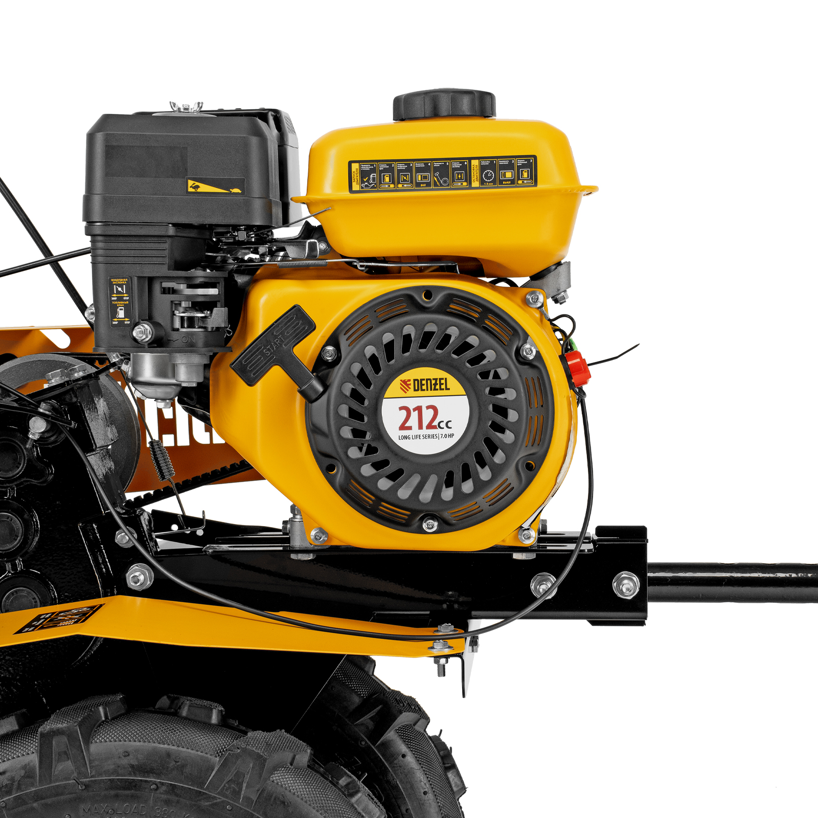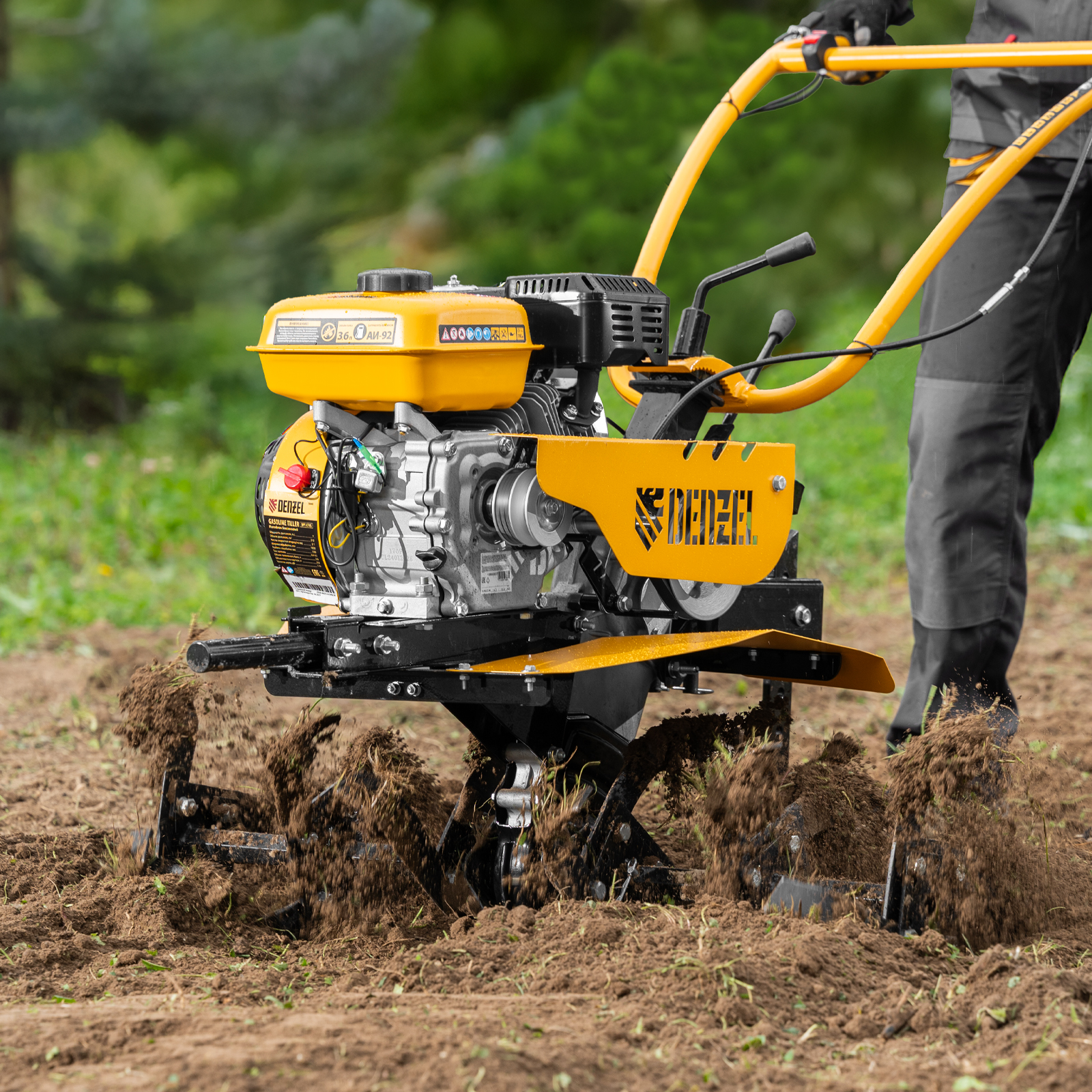 Мотоблок Denzel DPT-270S 56442 с двигателем объемом 212 см3 и мощностью 7 л. с., ременным механизмом сцепления, фрезами 3 х 4, шкивом отбора мощности (ШОМ) и коробкой передач 2В/1Н предназначен для проведения сельскохозяйственных работ. Максимальная ширина обработки составляет 1000 мм. Фрезы собираются из двух двойных и двух одинарных секций, что позволяет регулировать ширину вспашки. ,Шкив отбора мощности и универсальный кронштейн диаметром 30 мм позволяют установить различное навесное оборудование: плуг, окучник, картофелевыкапыватель, а также грунтозацепы и удлинители осей. Совместимые артикулы: Denzel 59901, 59902, 59903, 59904, 59905, 59906, 59907, 59908. Такое решение значительно расширяет возможности мотоблока и позволяет минимизировать расходы на закупку сельскохозяйственной техники.