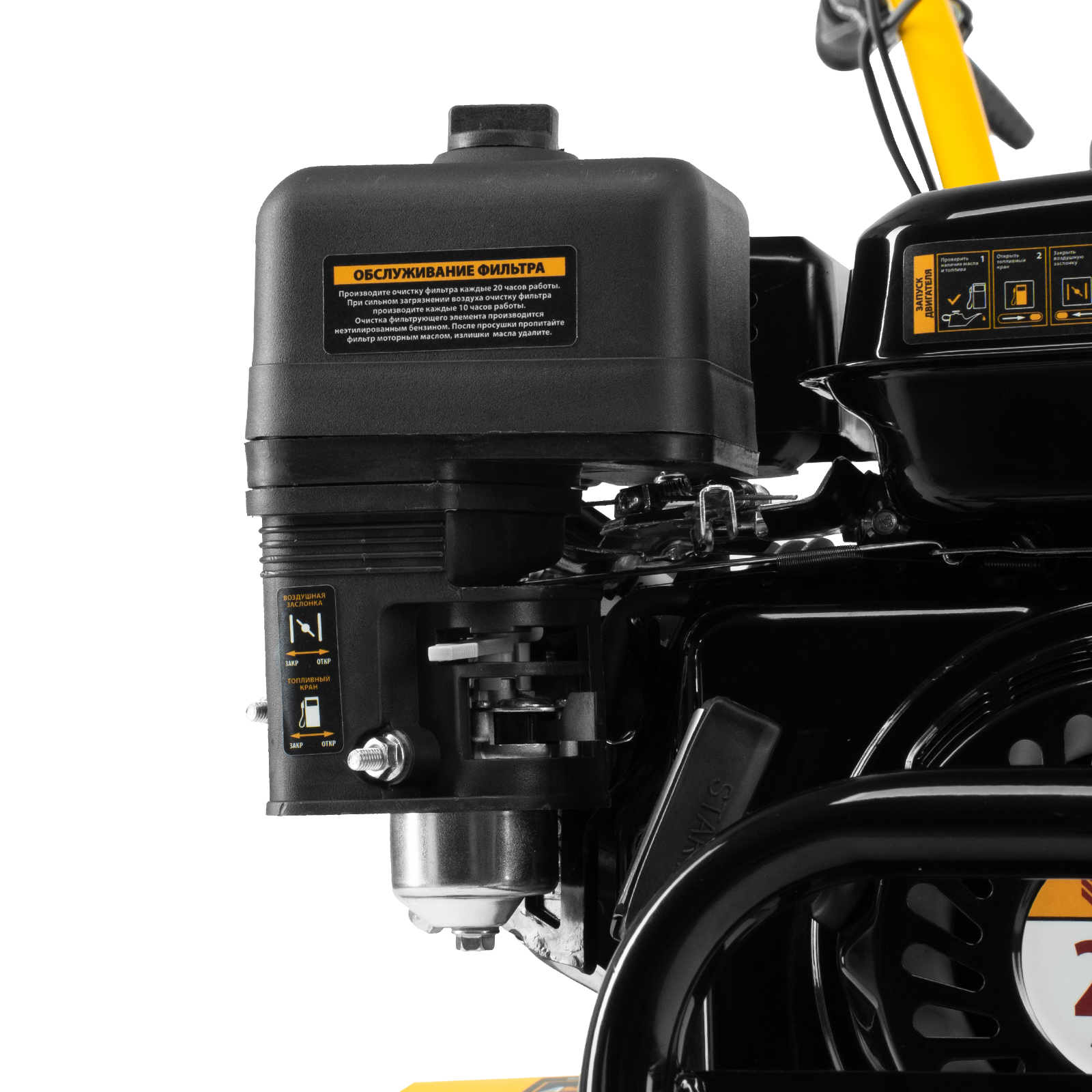 - Комфортное управление — регулятор оборотов двигателя и кнопка пуска выведены на рукоятку перед оператором, поэтому можно оперативно менять режим вспашки, не наклоняясь.