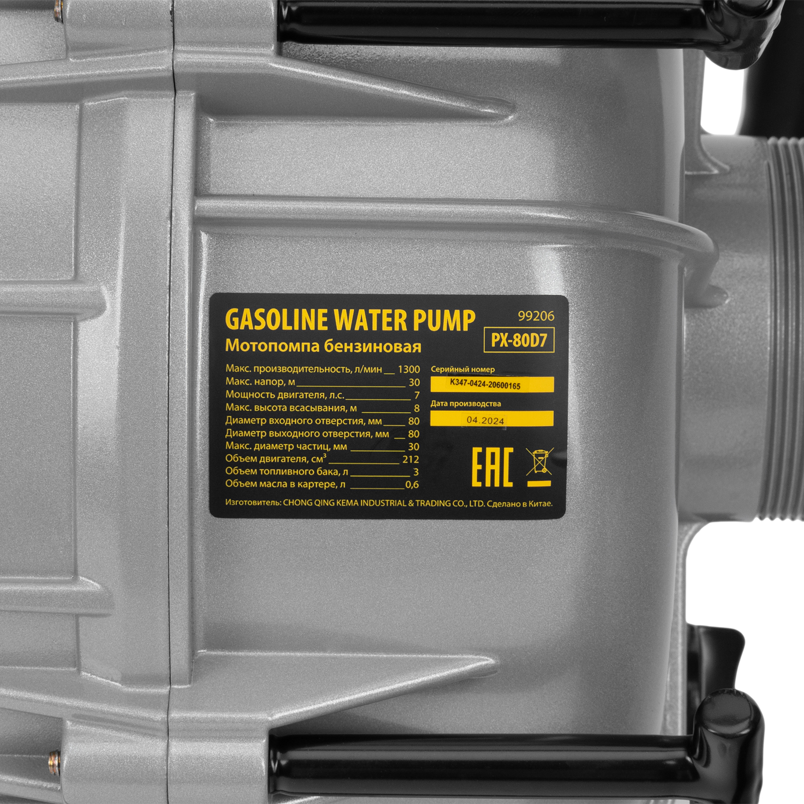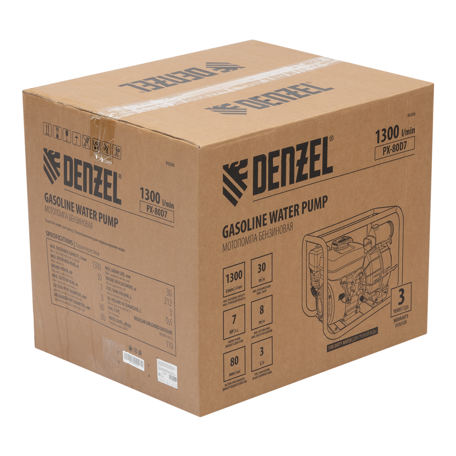 Мотопомпа бензиновая для грязной воды PX-80D7, 7 л.с., 3", 1300 л/мин, глуб 8 м,напор 30 м Denzel в Челябинске