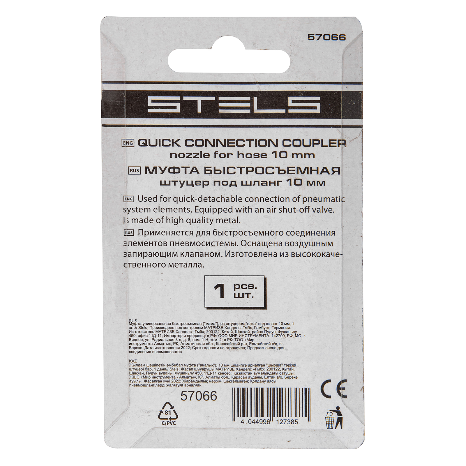Универсальная муфта Stels 57066 со штуцером «елка» и быстросъемным соединением «мама», 1 шт. в упаковке, обеспечивает быстрое подключение шлангов диаметром 10 мм к компрессору. Используется для монтажа пневмолиний и работы с пневмоинструментом.