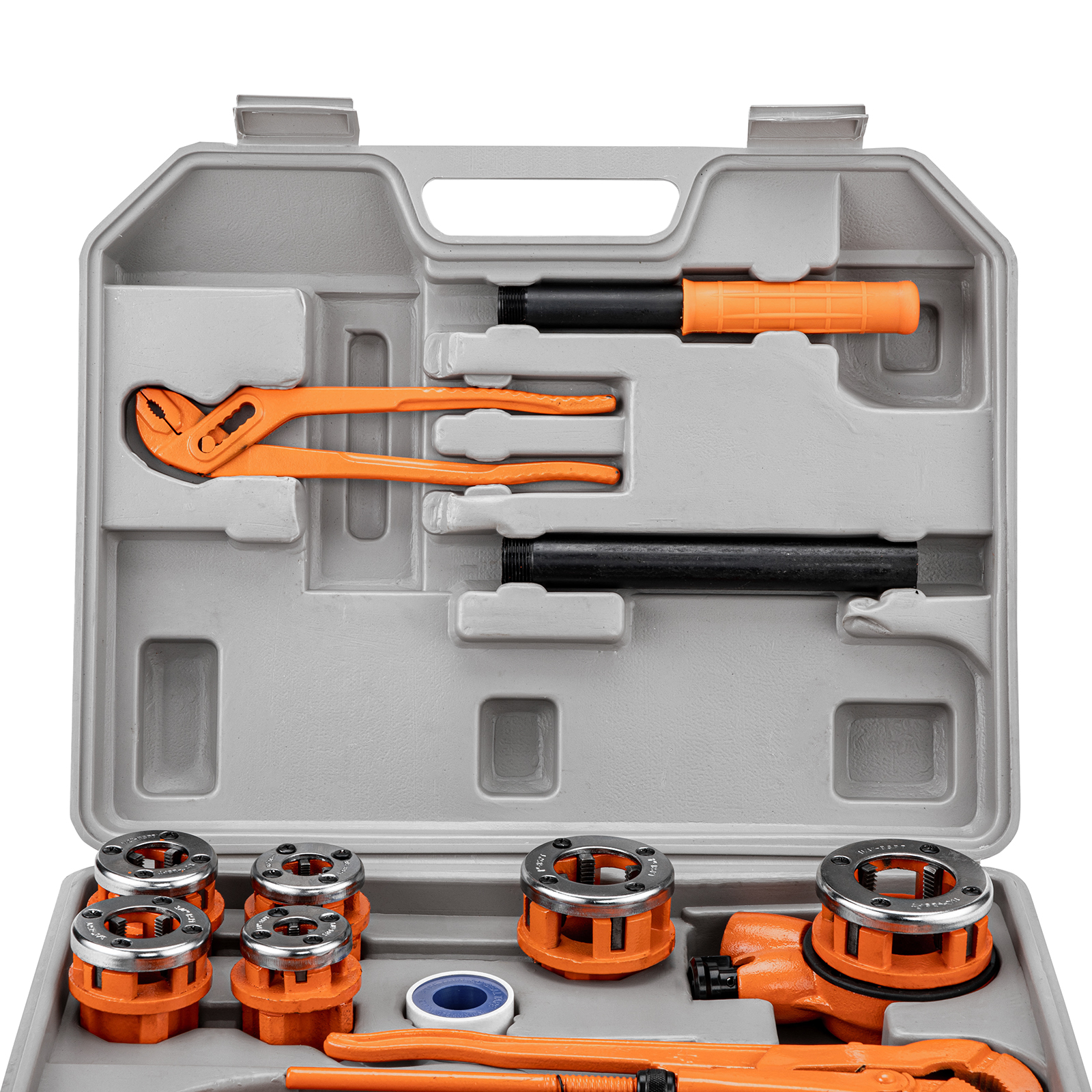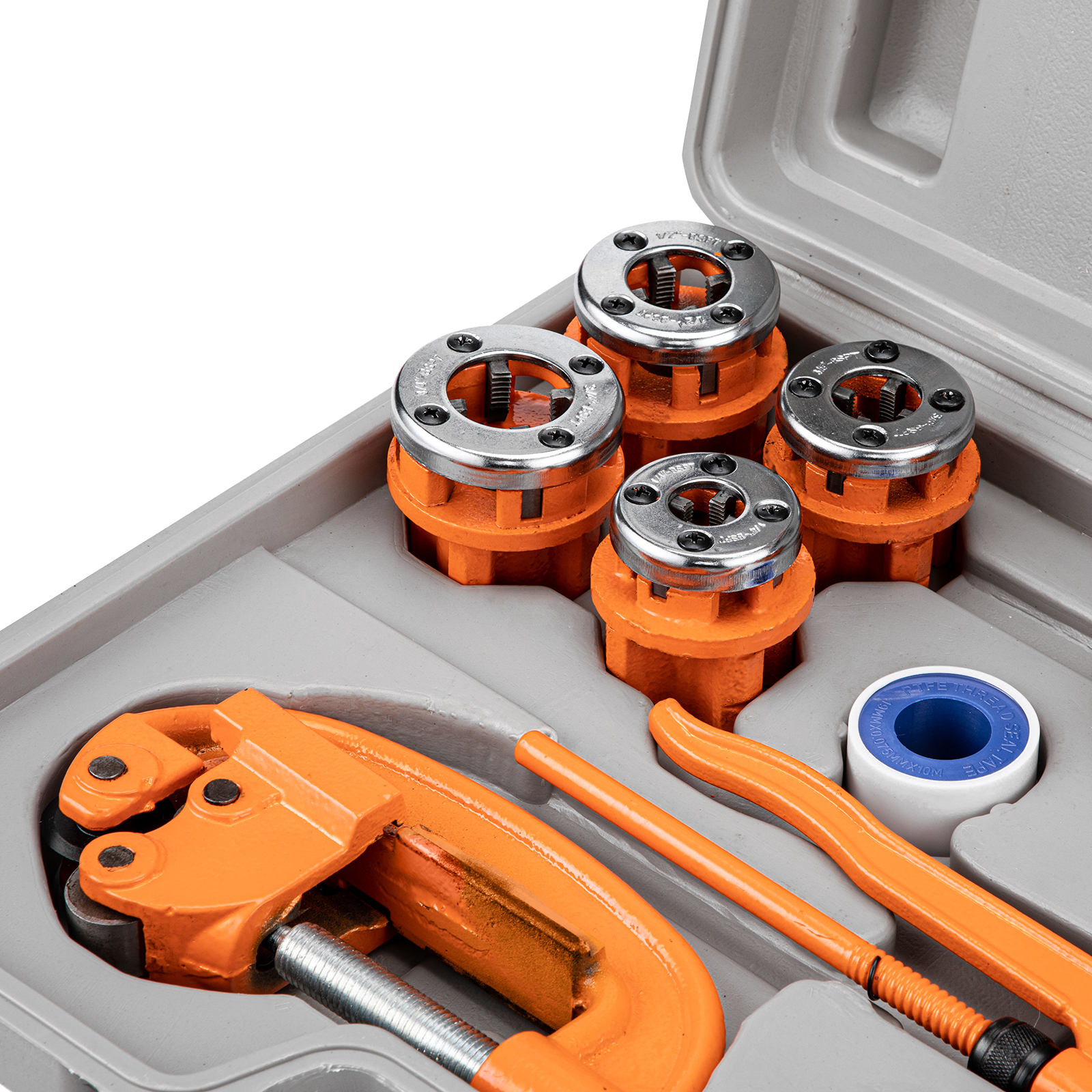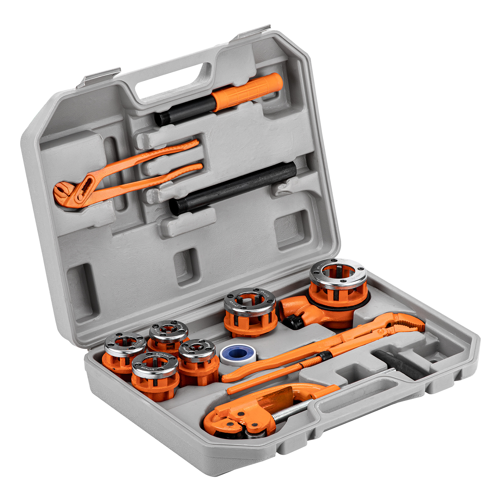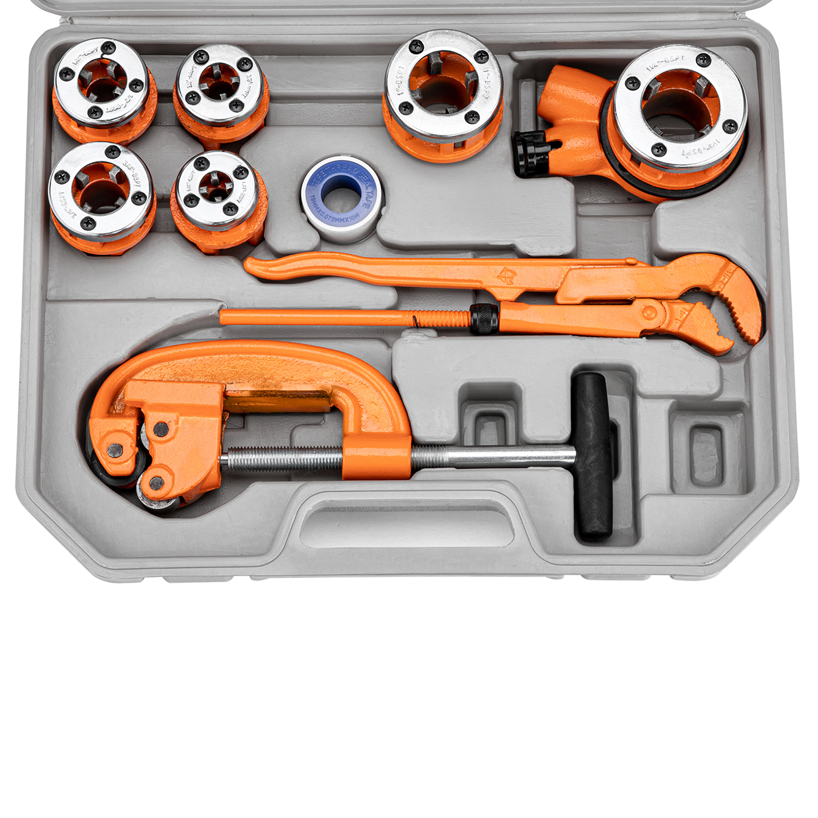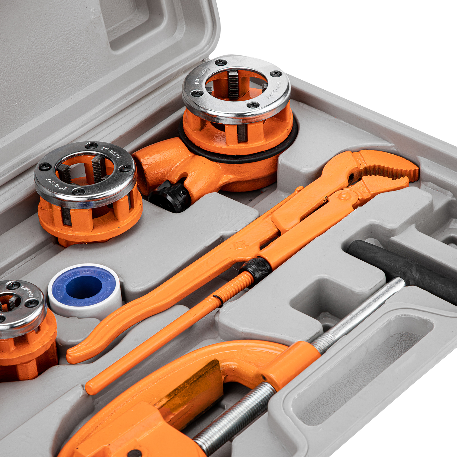 Набор для трубных работ Sparta 773345, состоящий из 13 предметов, пригодится частному мастеру. С его помощью можно нарезать резьбу на трубах и болтах при проведении ремонта в системах водопровода, отопления и газа. Клупп с трещоточным механизмом повышает скорость нарезки, а также облегчает работу в труднодоступных местах.