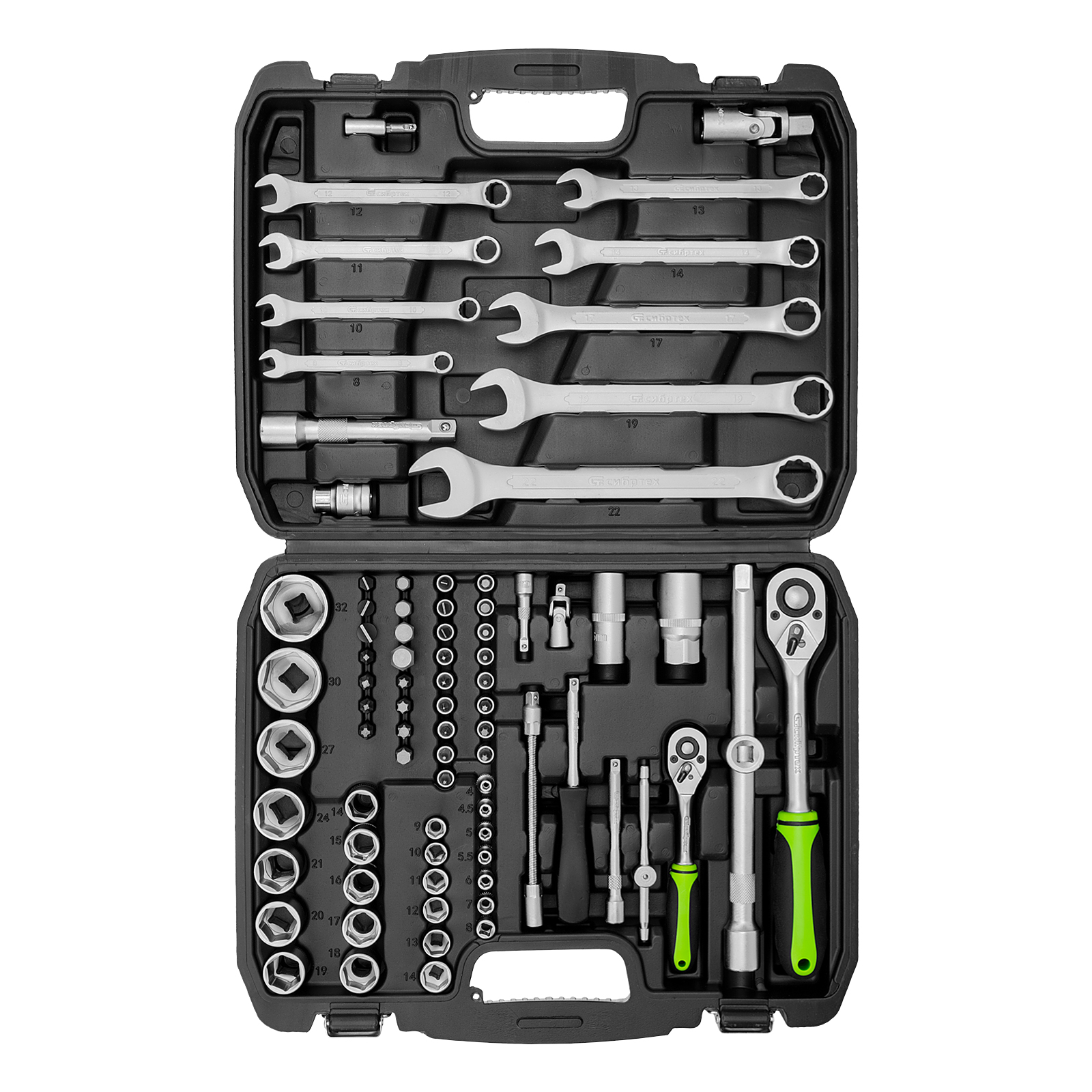 Набор инструмента Сибртех 13500, состоящий из 83 предметов с присоединительными размерами 1/2" и 1/4", предназначен для ремонта и обслуживания автомобилей, также пригодится в быту. Имеющиеся в комплекте насадки рассчитаны на крепеж с различными типами профилей и шлицев, включая HEX и TORX. Набор будет полезен профессиональным мастерам и автолюбителям.