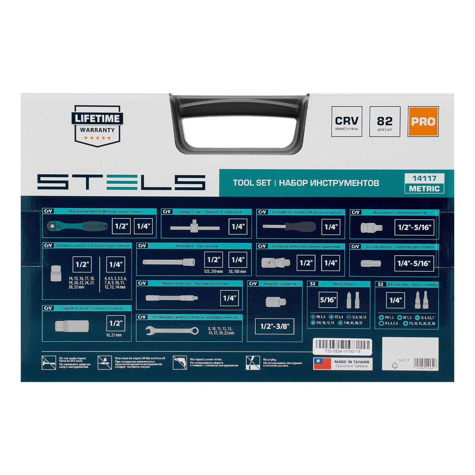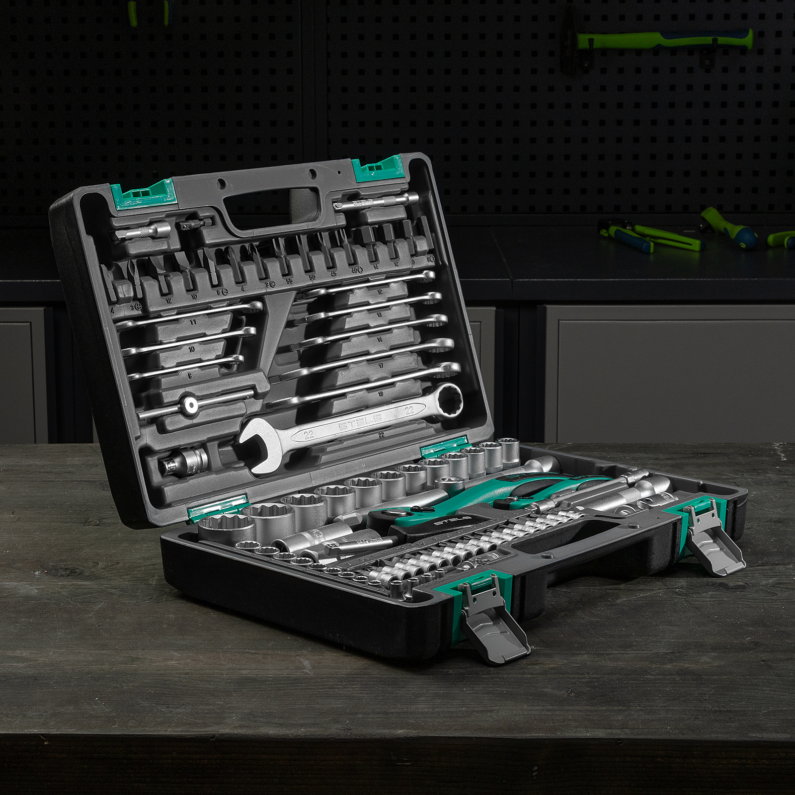 Набор инструментов Stels 14117 в ударопрочным пластиковом кейсе состоит из 82 предметов с присоединительными квадратами 1/2″ и 1/4″, из стали CrV и S2, и предназначен для выполнения слесарно-монтажных работ. Включает инструменты и насадки для работы с резьбовыми крепежами, в том числе 12-гранные торцевые головки, т-образный вороток и удлинители (в том числе гибкий), облегчающие работу в труднодоступных местах. Набор предназначен для профессионального использования в автомастерской, будет полезен и для решения бытовых задач.