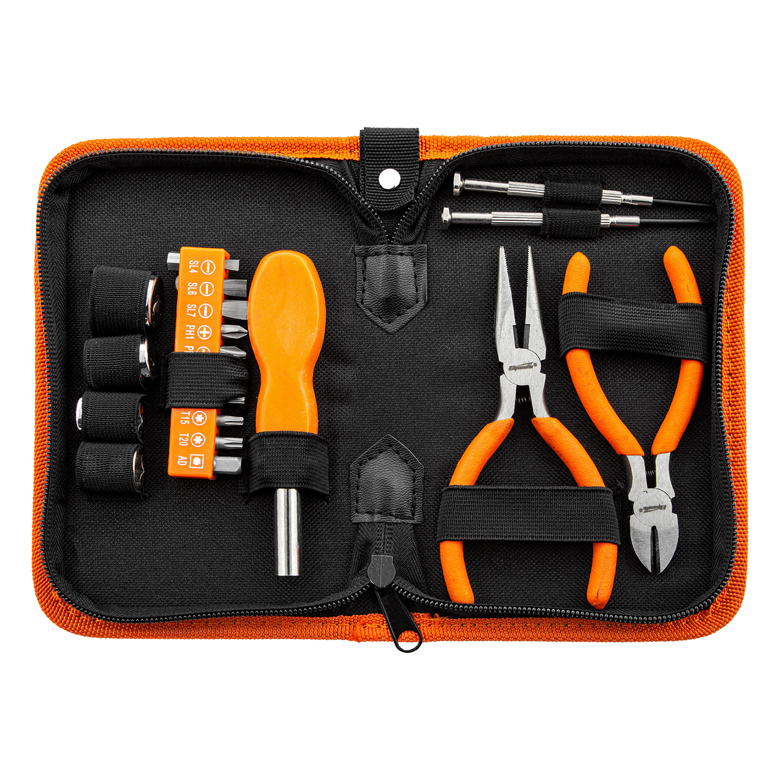 Набор Sparta 13546 из 19 предметов используется для проведения слесарно-монтажных работ. В комплект входят отвертки для точных работ, отвертка для бит, биты и торцевые головки для монтажа/демонтажа крепежных элементов, бокорезы и длинногубцы для захвата, удержания и перекусывания проводов и мелких деталей. Набор будет полезен дома и в частной мастерской.