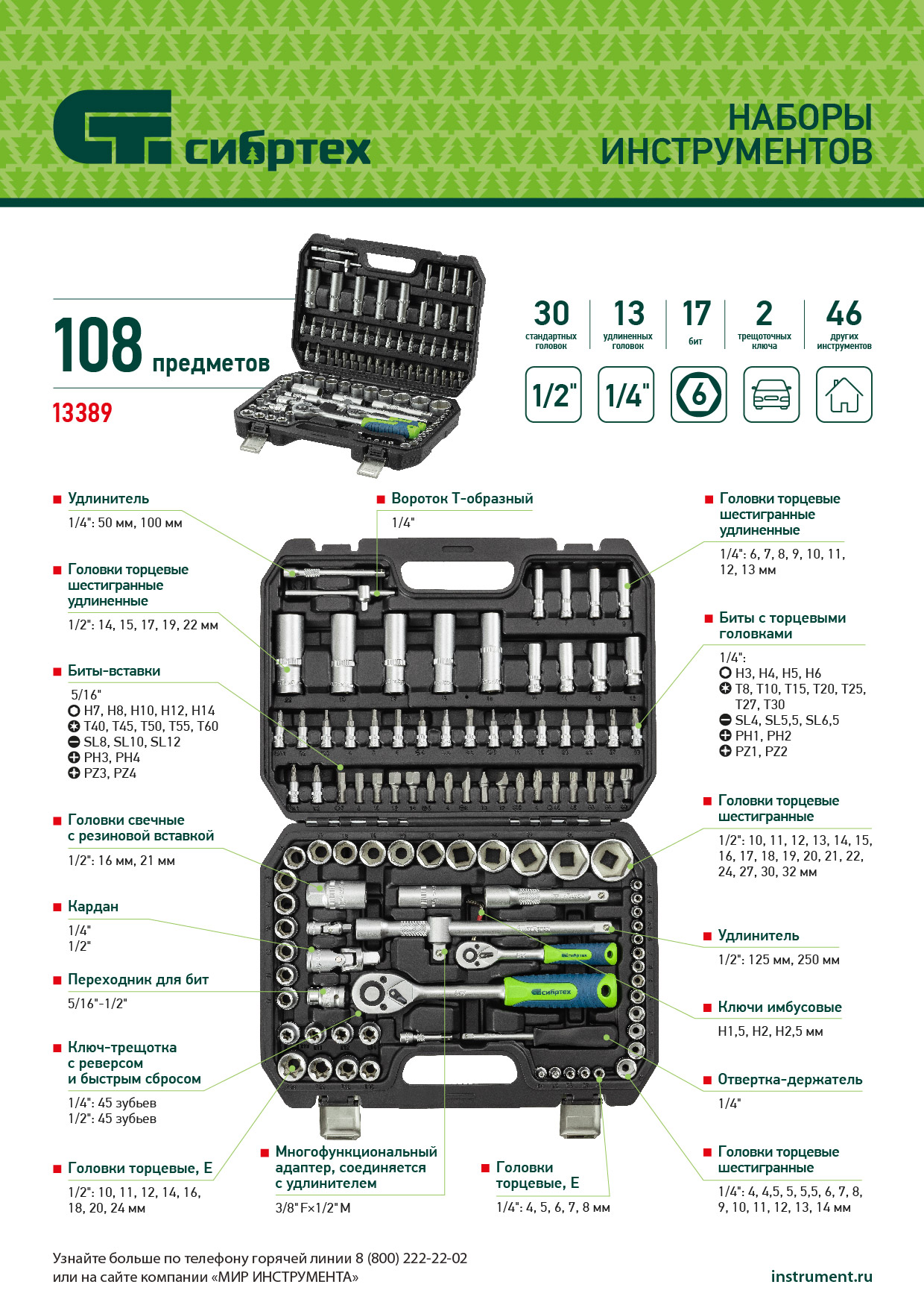 Набор инструментов Сибртех 13389 упакован в пластиковый кейс и состоит из 108 предметов с присоединительным размером 1/2" и 1/4", предназначенных для монтажа и демонтажа резьбового крепежа с разными типами шлицев. В комплект поставки входят карданы, удлинители и переходники, облегчающие работу в труднодоступных местах. Набор используется для ремонта автомобилей, а также полезен в быту.