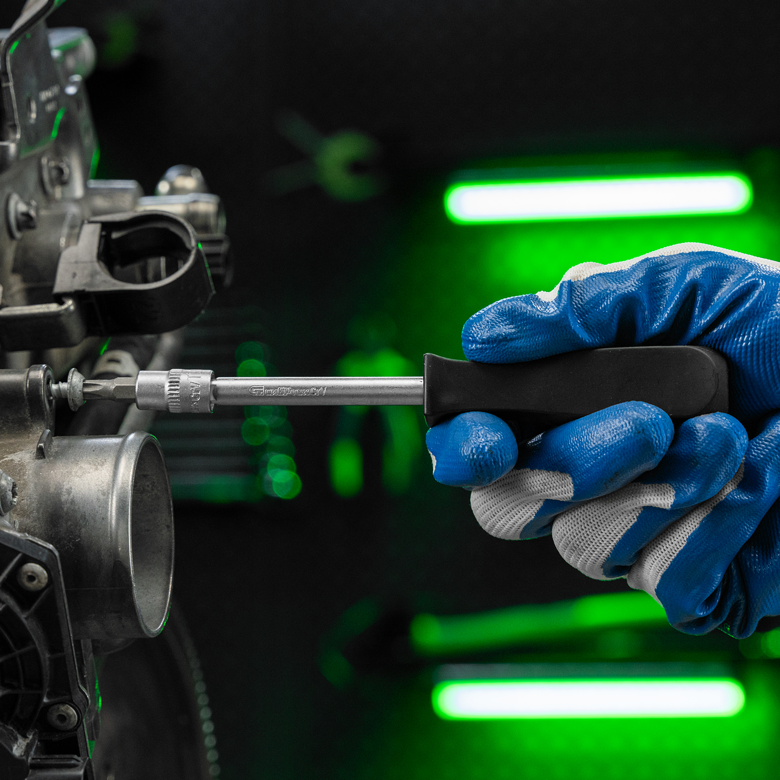- Прочная фиксация — шариковый замок на трещотках, воротках, шарнирах и удлинителях надежно удерживает головки.