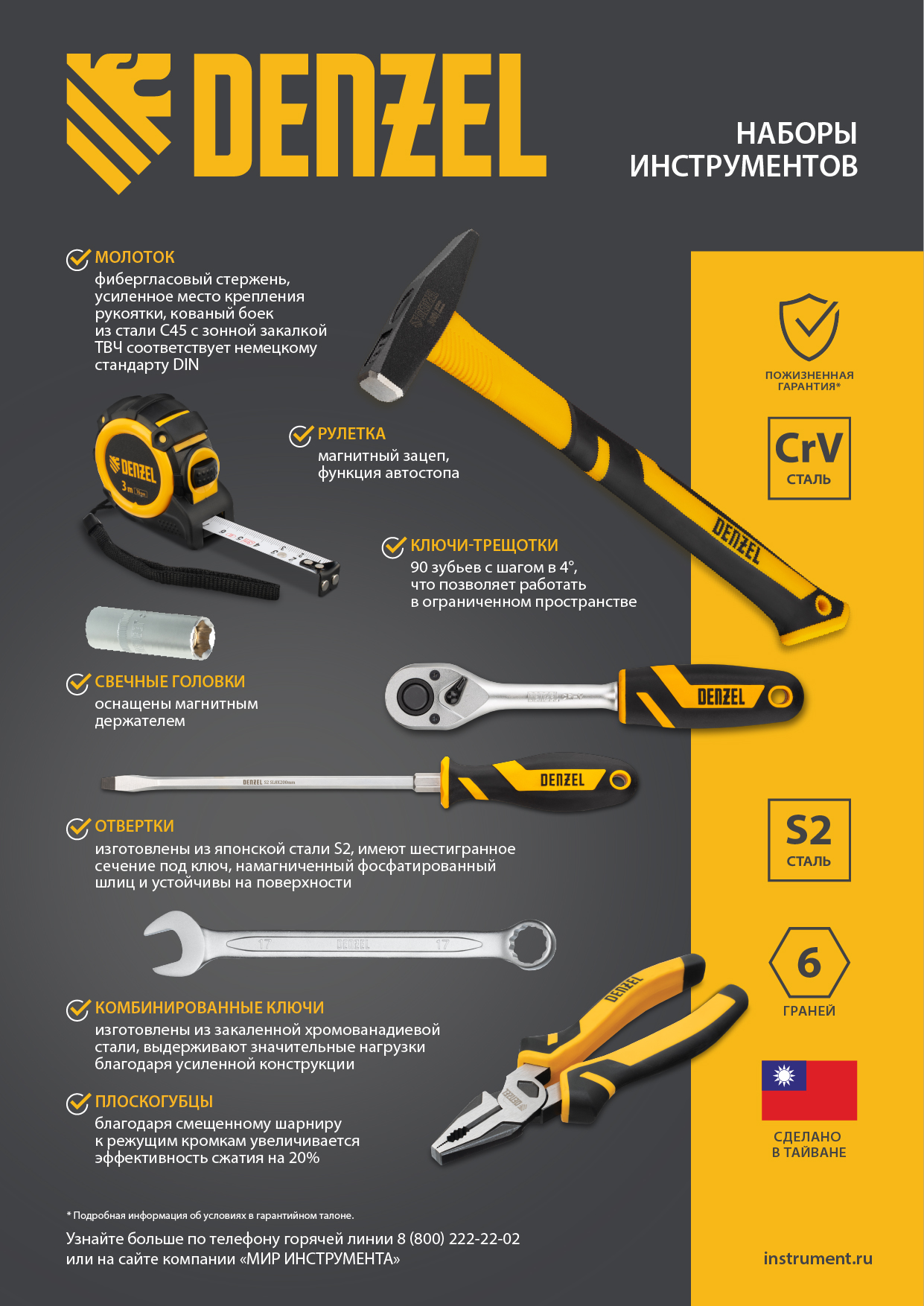 - Устойчивость к высоким нагрузкам — инструменты изготовлены из высокопрочной закаленной стали CrV, биты выполнены из японской стали S2.